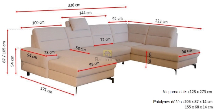 Bendras Plotis/Gylis/Aukštis: 171x336x223/98/87-105 cm.