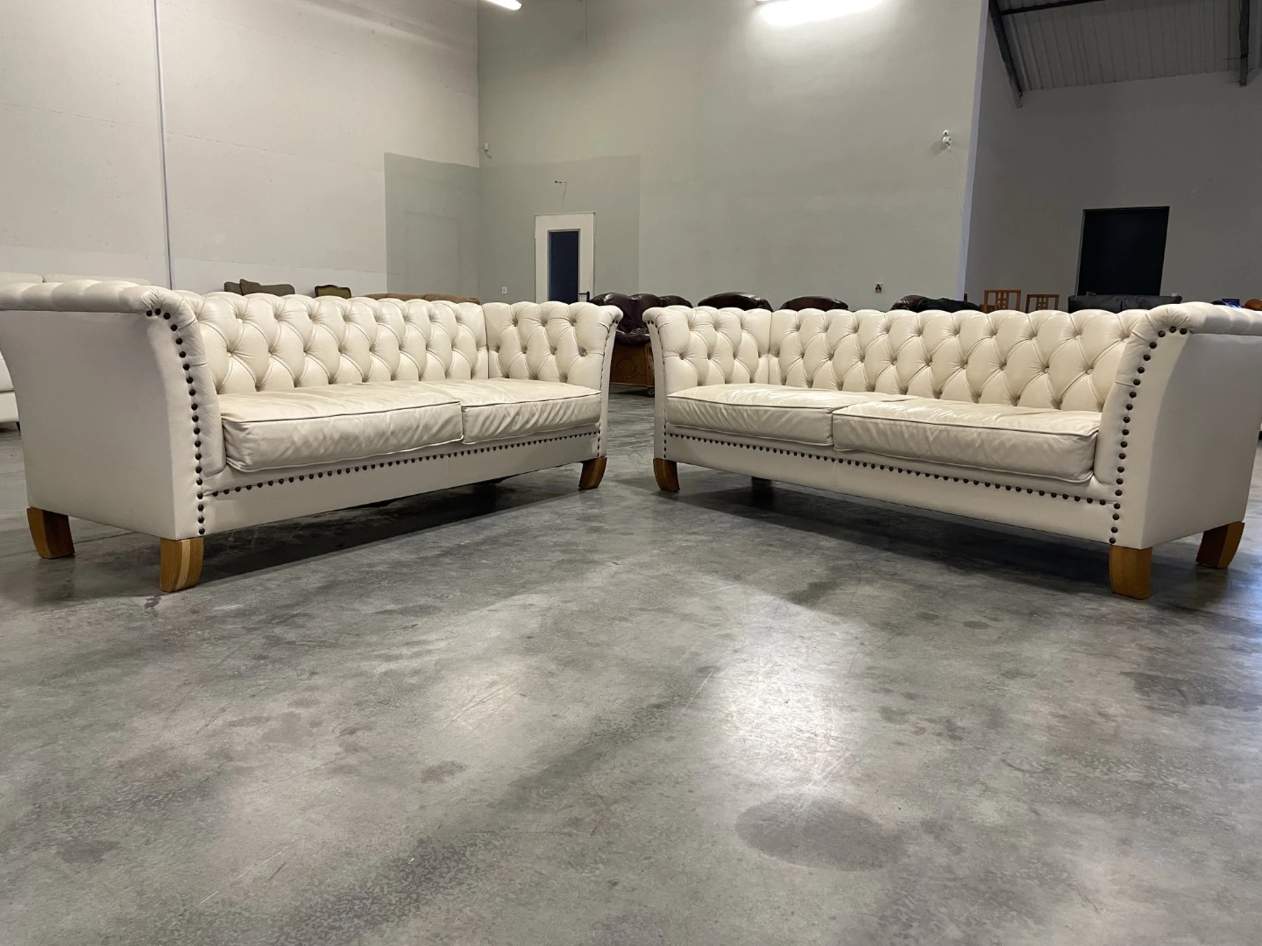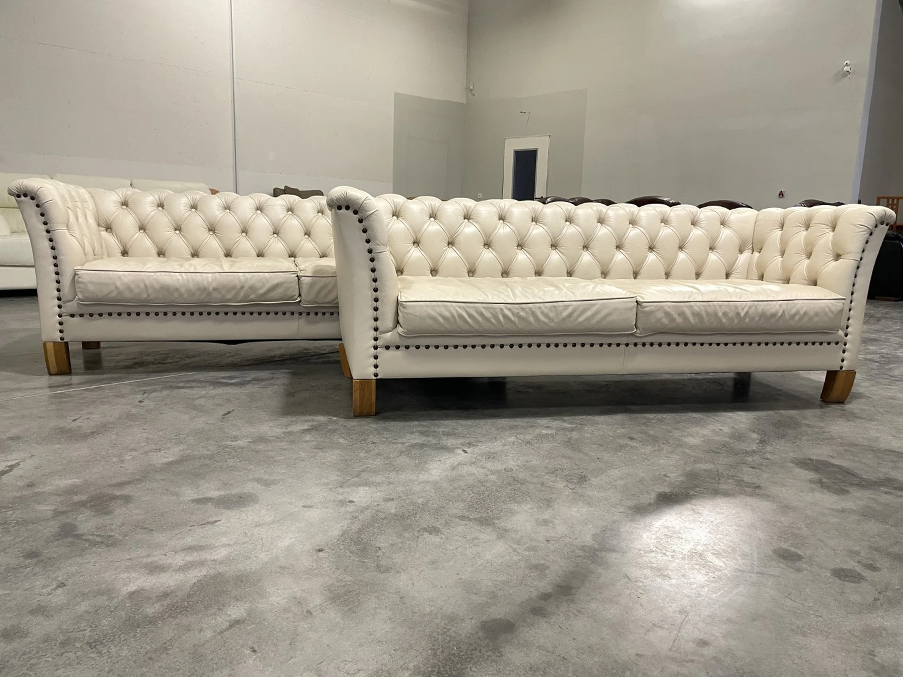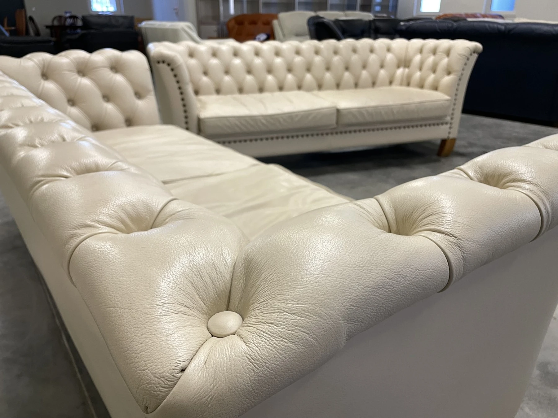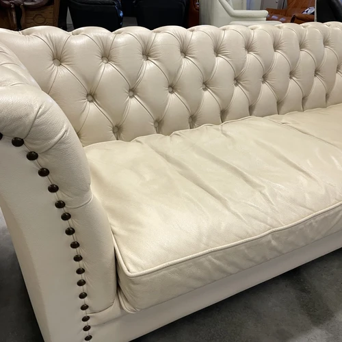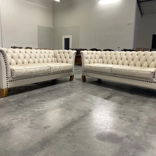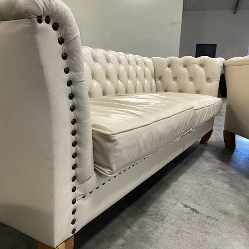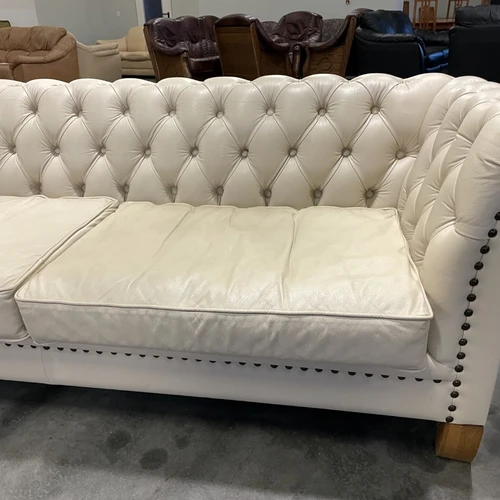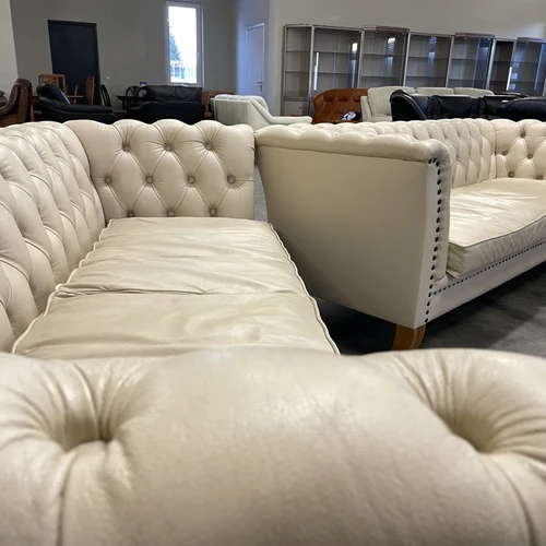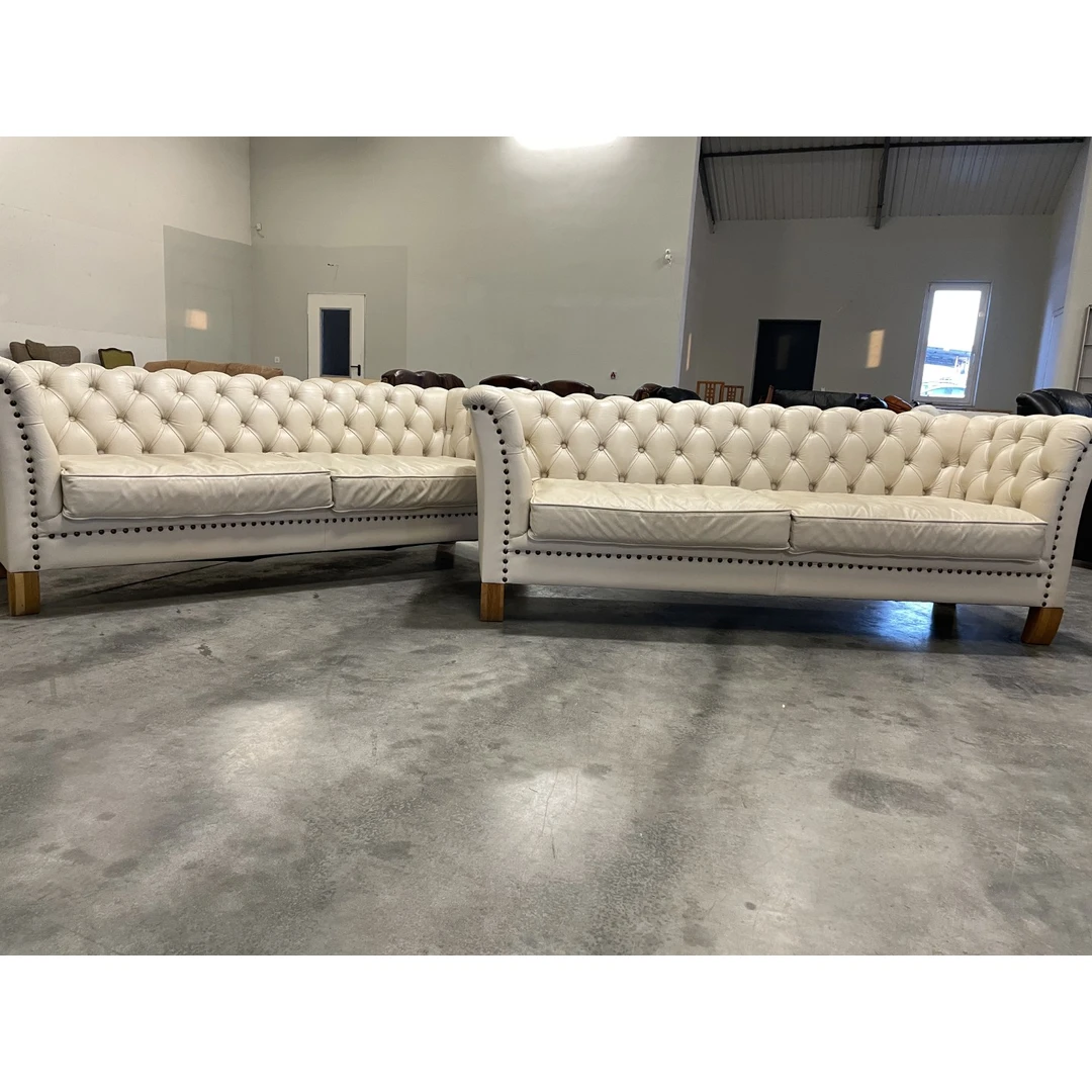 Natūralios odos "Chesterfield" stiliaus dvi trivietės sofos. Vienos sofos ilgis 210 cm, plotis apie 85 cm, aukštis - 77 cm. Nugara ir šonai dermantininiai. Komplektas vidutinio kietumo. Spalva kreminė