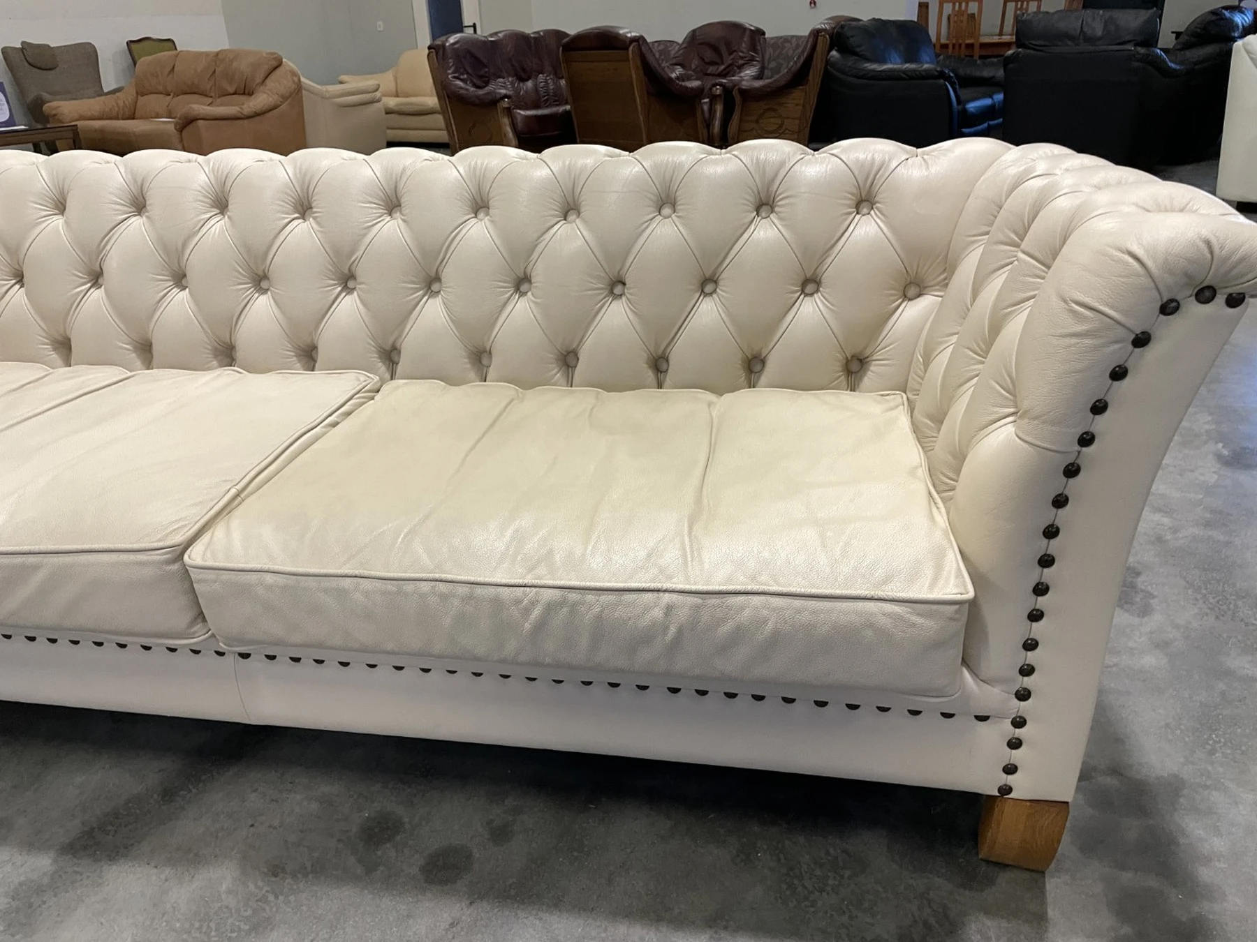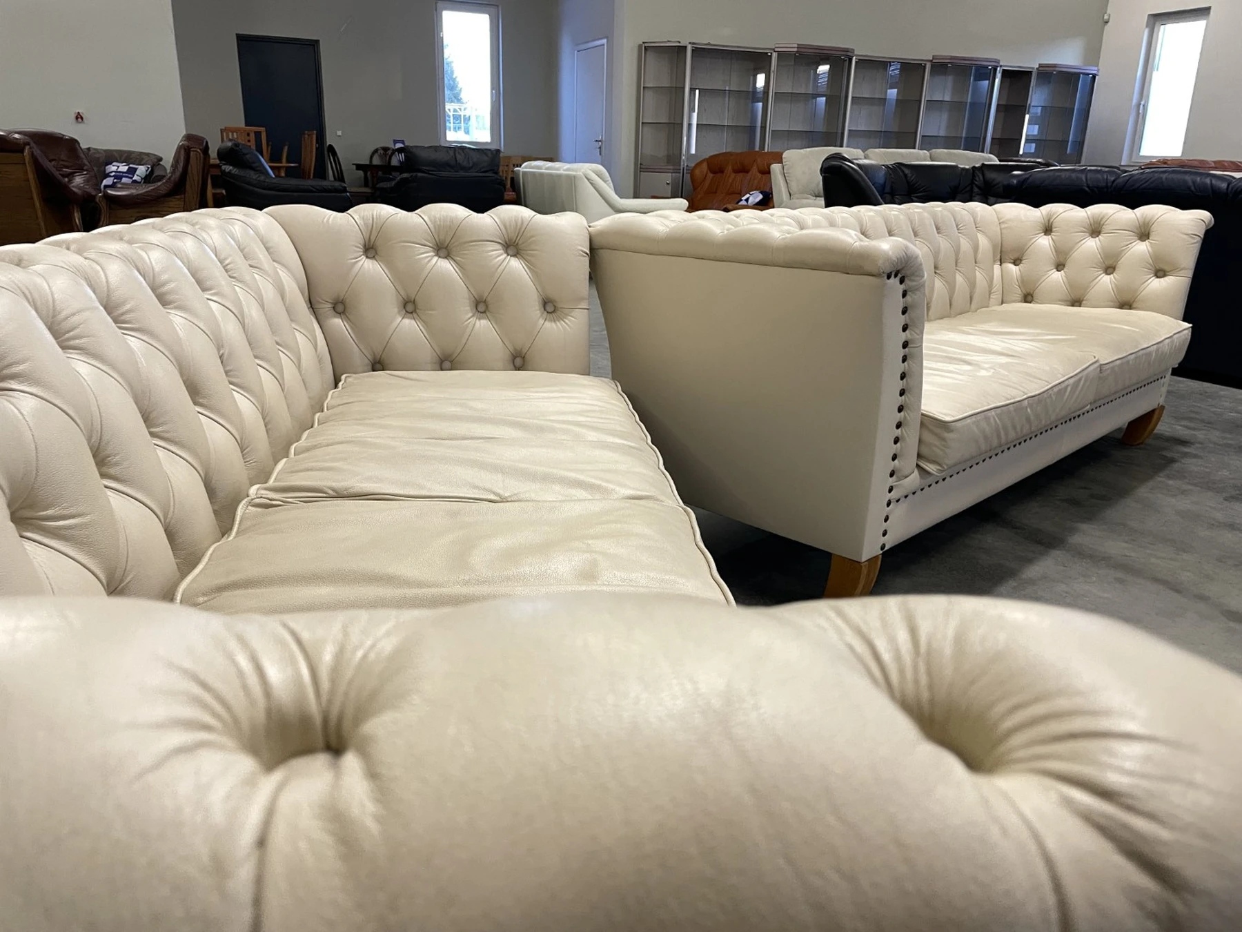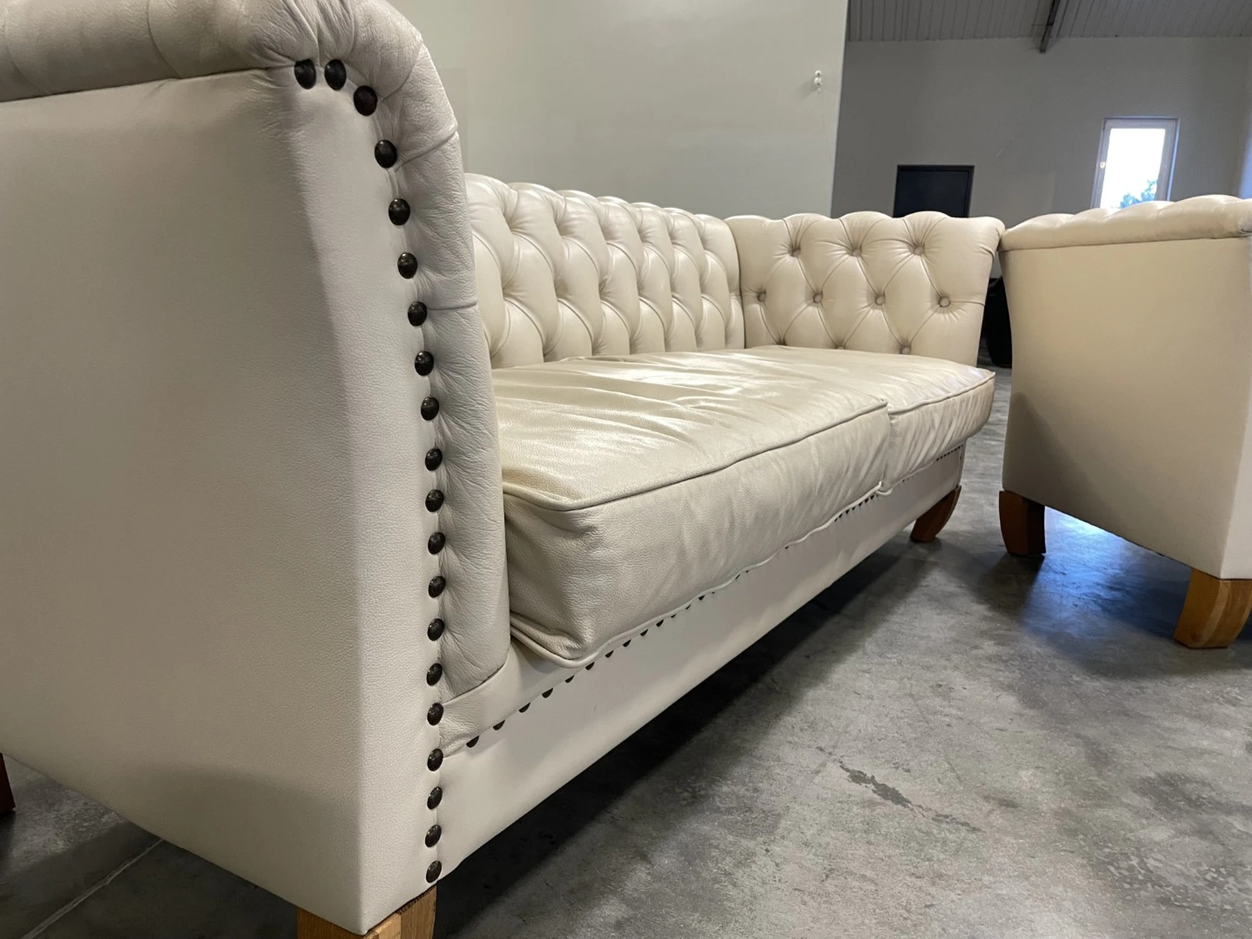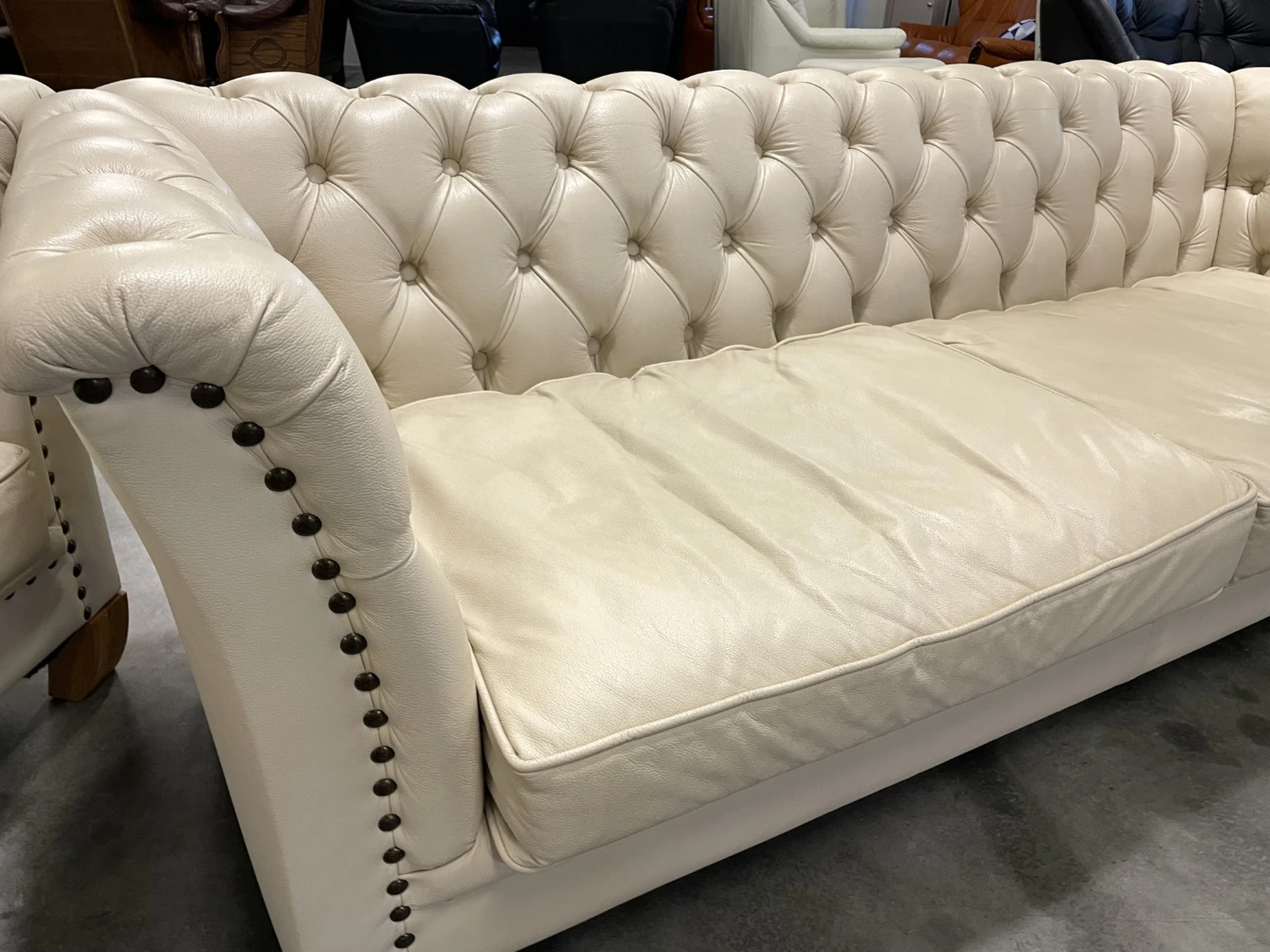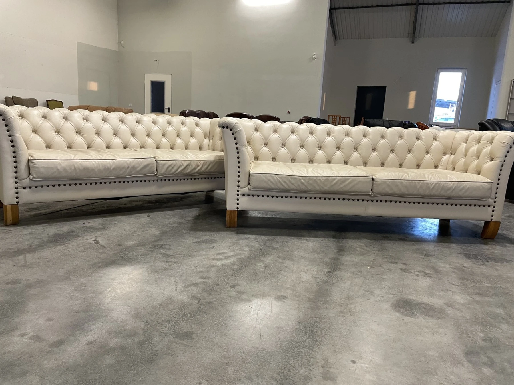 Natūralios odos "Chesterfield" stiliaus dvi trivietės sofos. Vienos sofos ilgis 210 cm, plotis apie 85 cm, aukštis - 77 cm. Nugara ir šonai dermantininiai. Komplektas vidutinio kietumo. Spalva kreminė