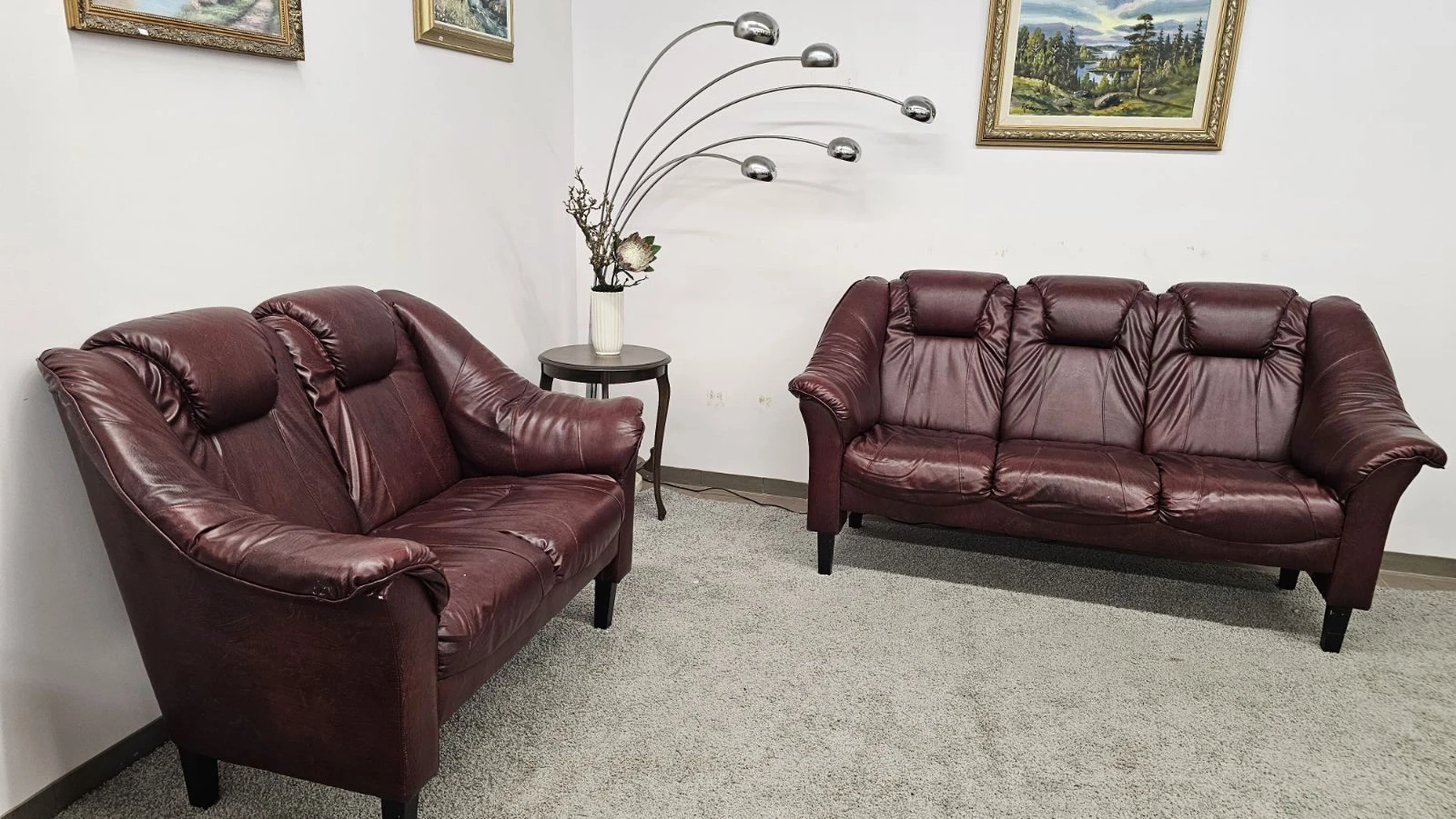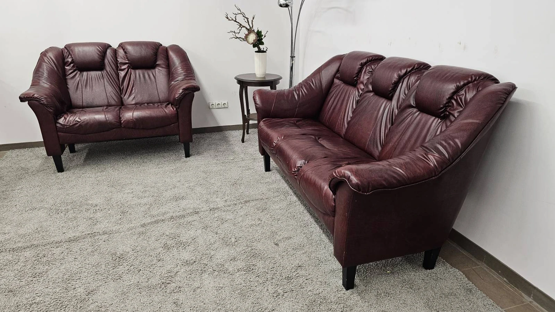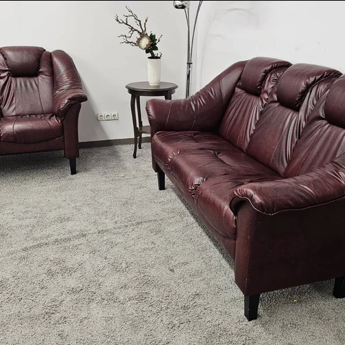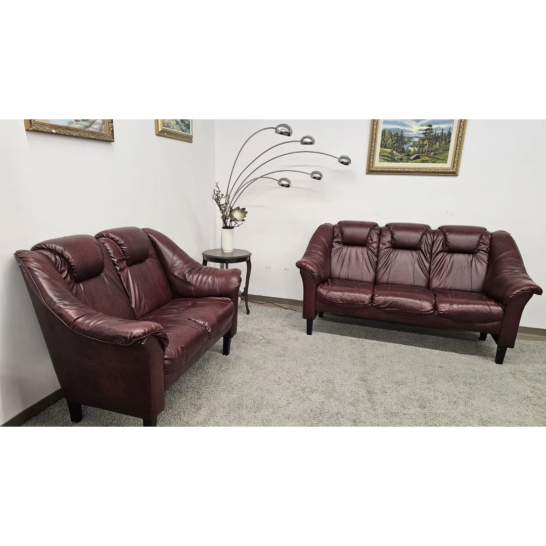 Parduodami naudoti, bet kokybiški sodrios bordo spalvos odiniai baldai: dvivietės (1,45 m) ir trivietės (1,95 m) sofos komplektas.