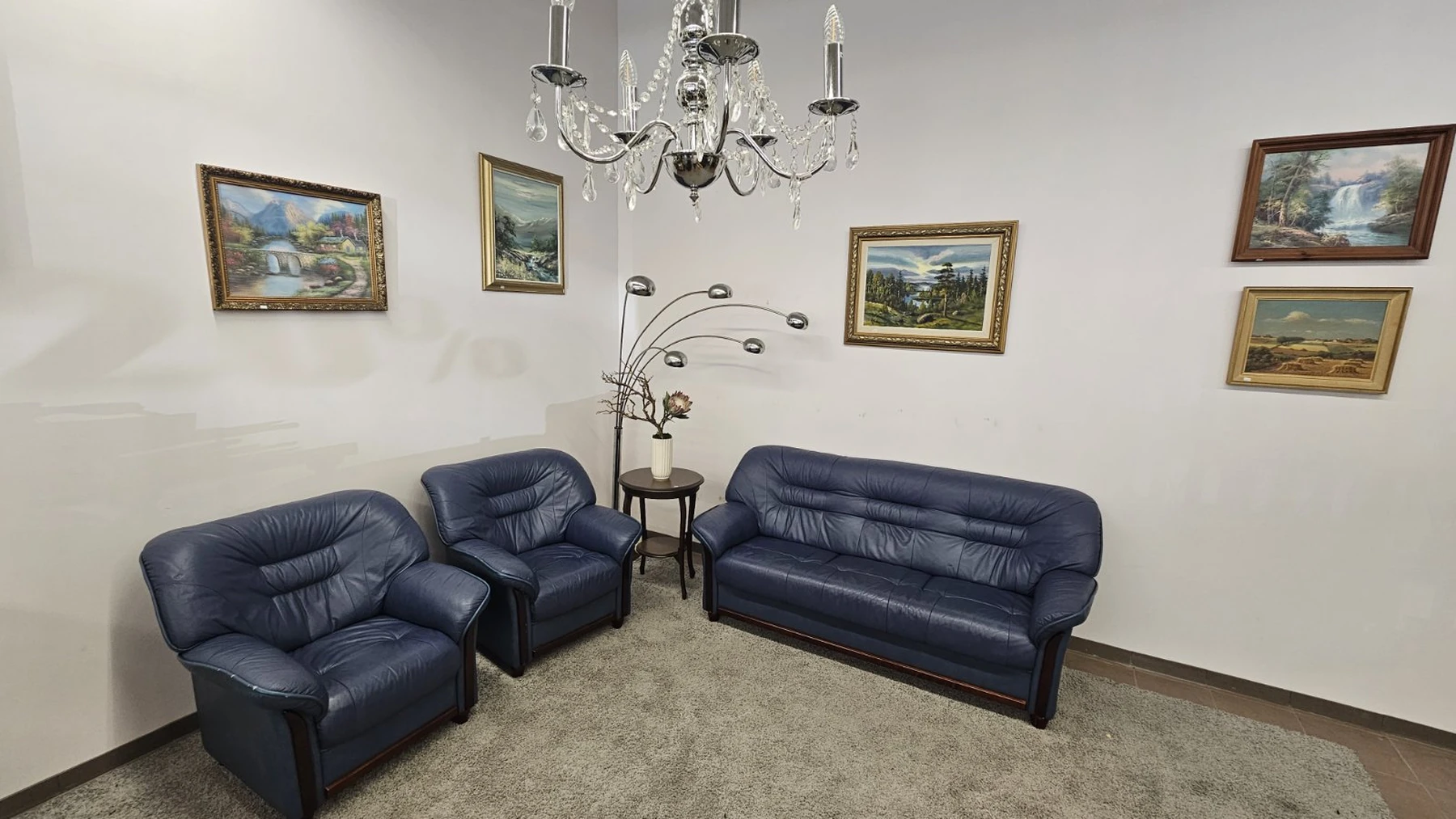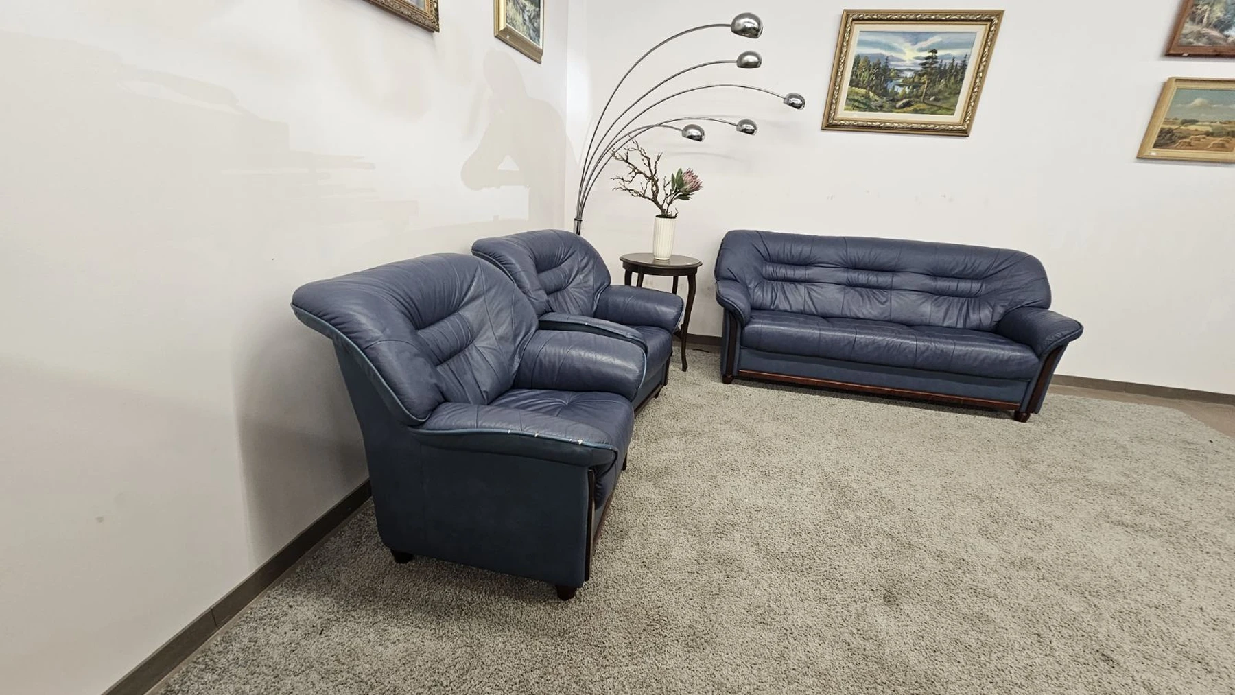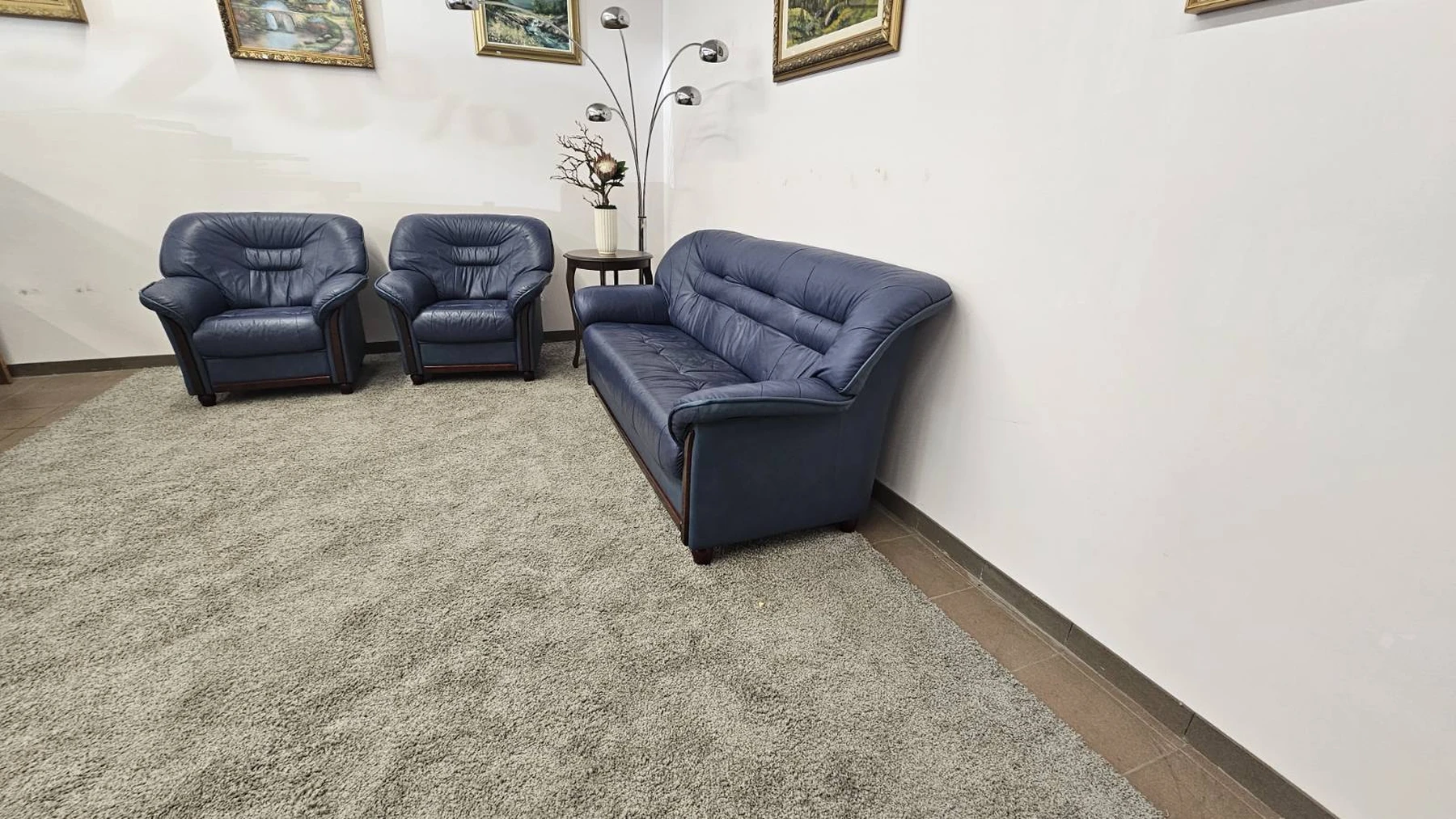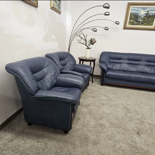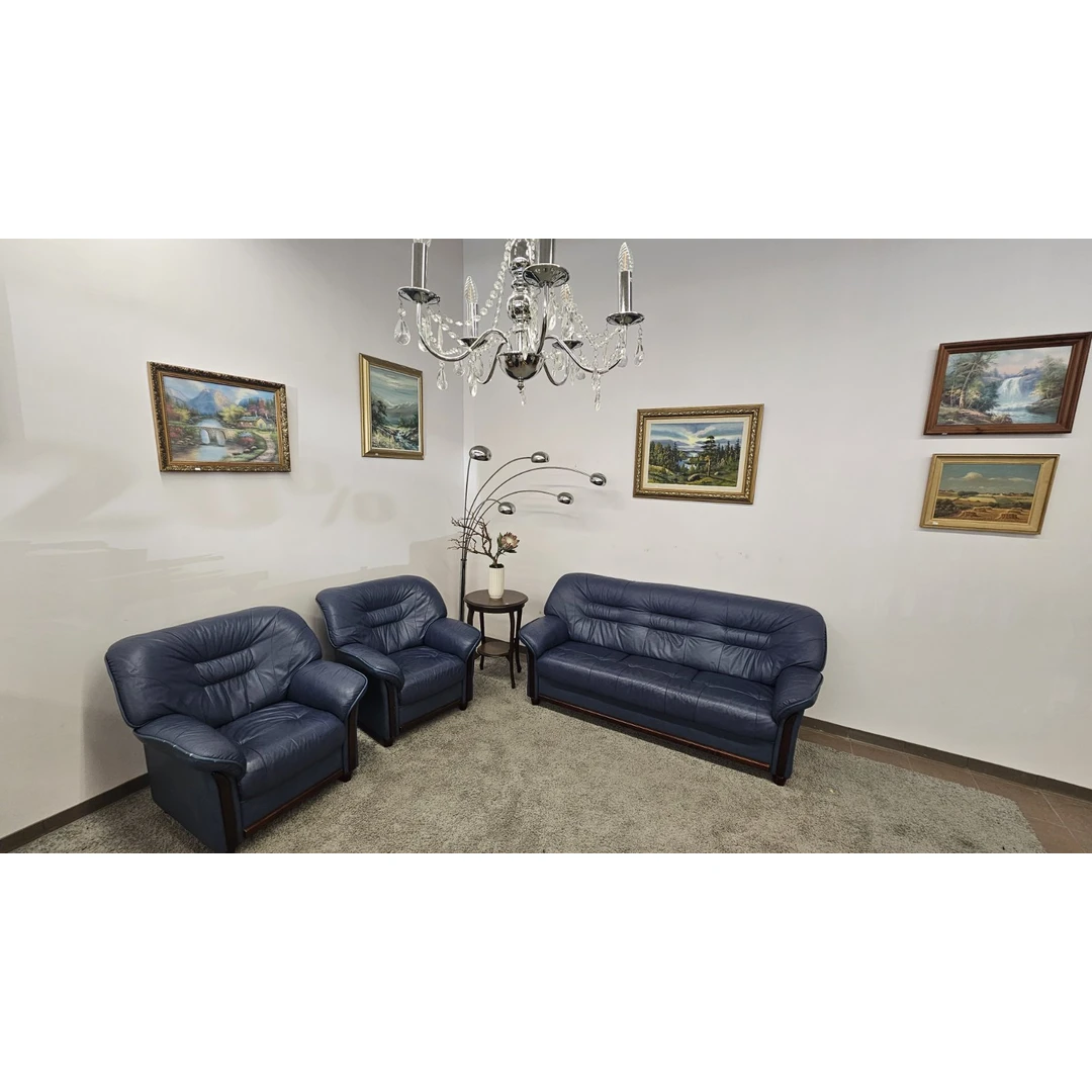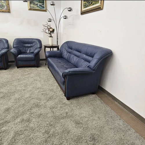 Modernus, mėlynos spalvos, natūralios odos komplektas 3+1+1. Išmatavimai: trivietė-1,9m.