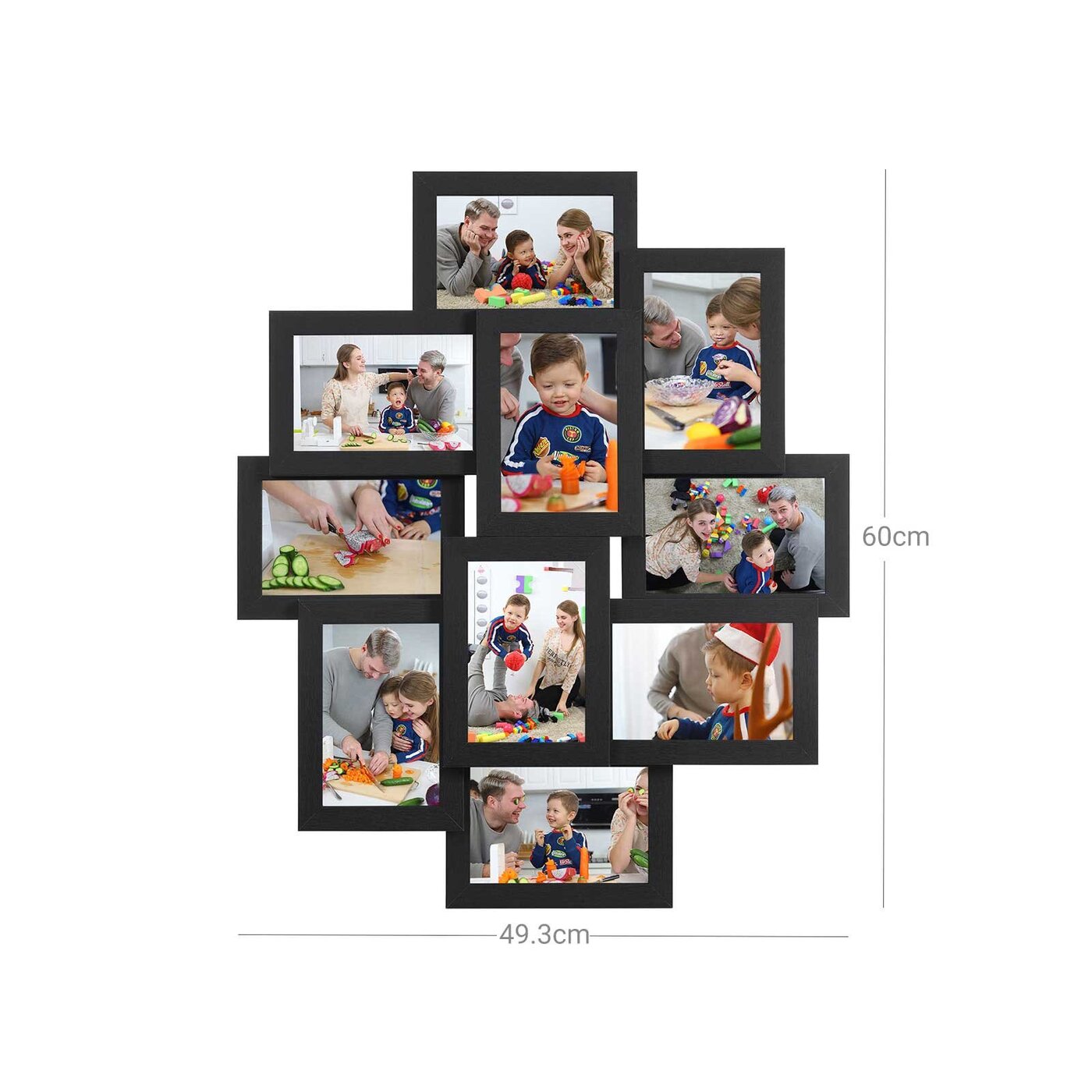 Aprašymas buvo automatiškai išverstas, gali pasitaikyti klaidų.Užpildykite šį rėmelį mėgstamomis nuotraukomis ir pakabinkite. Medienos raštų nuotraukų rėmelis papuoš Jūsų sieną ir visada primins gražias akimirkas Prekės informacija: Bendri matmenys: 60 x 49,3 x 3,6 cm (P x A x A) Nuotraukos matmenys: 10 x 15 cm Rėmo spalva: juodaMedžiaga: MDF, polistirenas Svoris: 1,8 kgPristatymo komplektacija: 10 x paveikslų rėmeliai 1 x maišelis furnitūros 1 x maišas medinių kaiščių SONGMICS Pastabos: Oro burbuliukų buvimas ir prastas šviesos pralaidumas ant permatomo paveikslo dangtelio atsiranda dėl apsauginės plėvelės. Prieš naudodami nuimkite dvi apsaugines plėveles Koliažo rėmelį sudaro keli paveikslų rėmeliai. Šį modelį reikia surinkti ir pakabinti ant sienos; nuotraukų rėmeliai negali būti naudojami atskirai.
