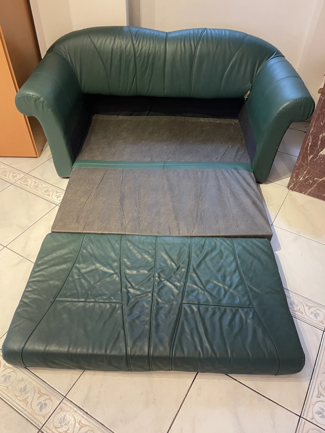 Odine sofa su miegama dalimi, defektas nuotraukose.