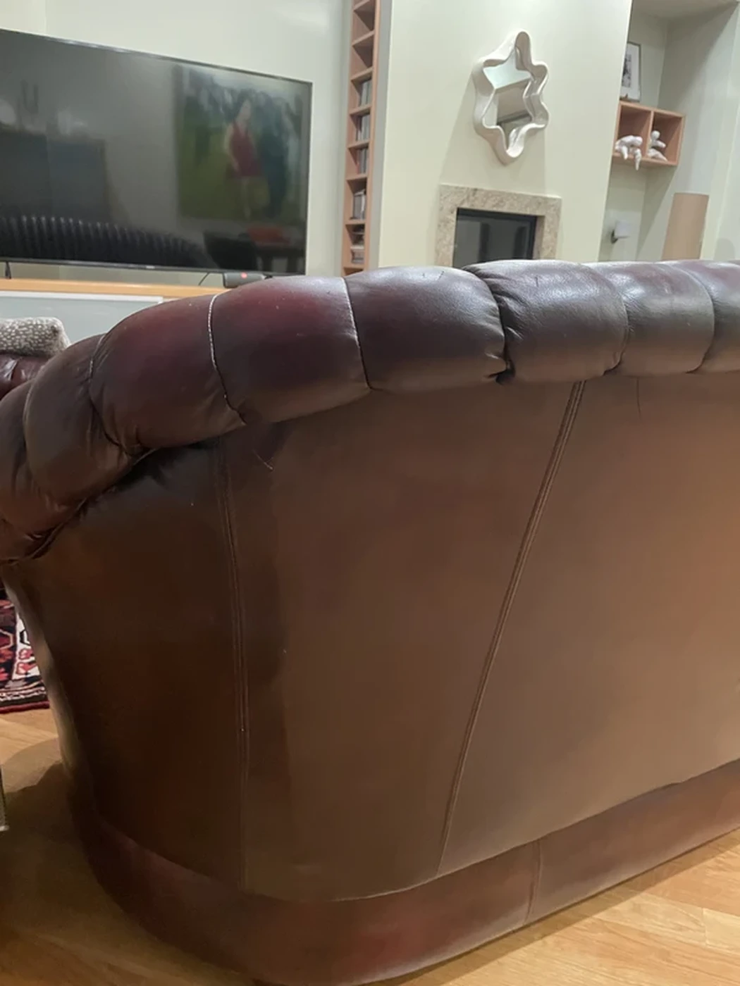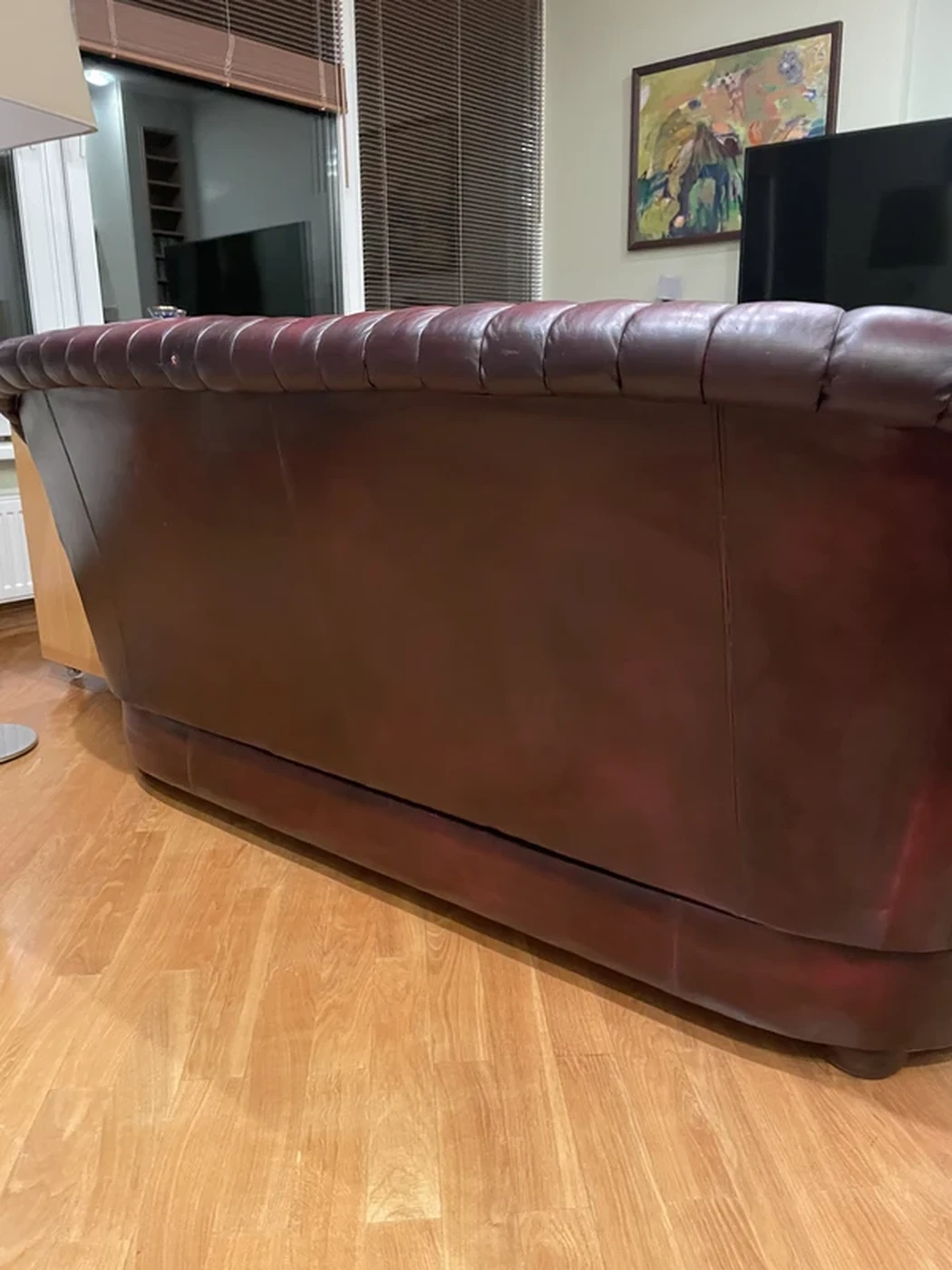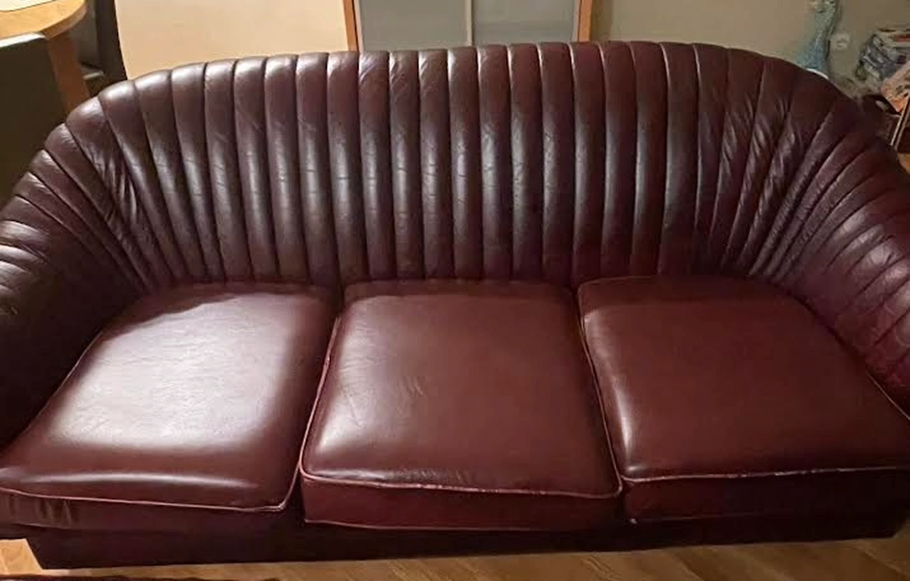 Bordo spalvos odinių baldų komplektas - du foteliai, trivietė sofa.