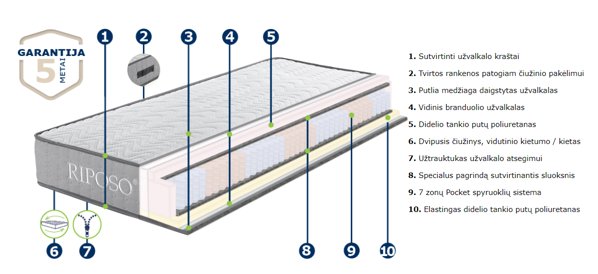 Pagrindas sudarytas iš 7 zonų, ilgaamžių Pocket spyruoklių bloko. Kiekviena spyruoklė įvilkta į tekstilinį maišelį, reaguoja indvidualiai ir prisiderina prie kūno formų ir svorio, taisyklingai paskirsto kūno padėtį gulint, kad išvengtumėte nugaros skausmų.