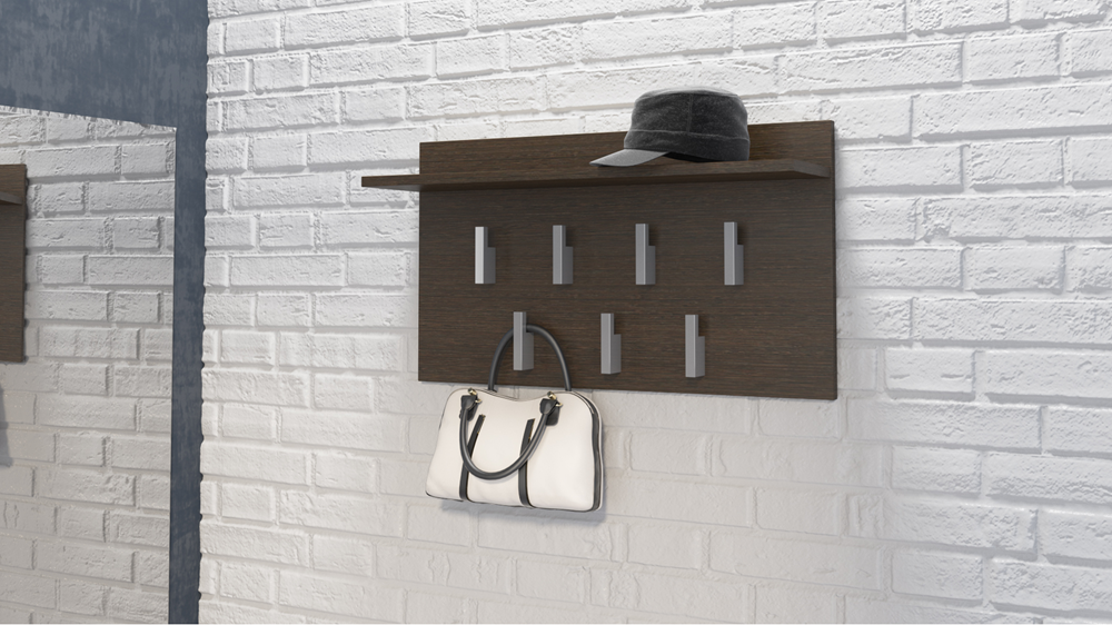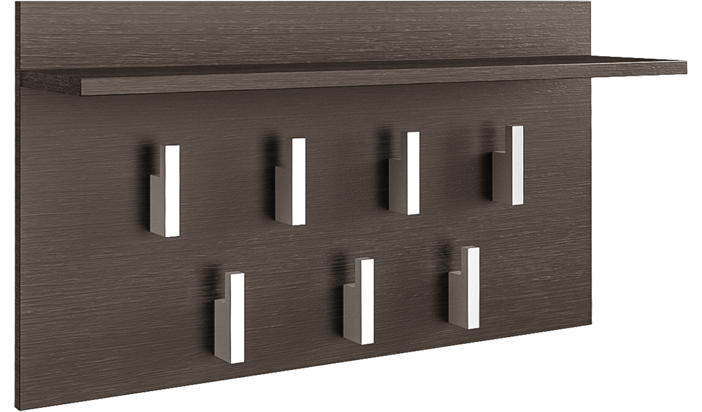 Pagaminta iš 16 mm storio medžio drožlių plokštės (MDP);Kabyklos išmatavimai: plotis - 70 cm, aukštis - 40 cm, gylis – 20 cm;Su septyniais kabliukais ir lentyna Jūsų daiktams;Lentynos matmenys: plotis - 70 cm; gylis - 18 cm;Briaunos dengtos PVC danga, pasižyminčia dideliu cheminiu ir mechaniniu atsparumu;Spalva - tamsiai ruda (wenge);