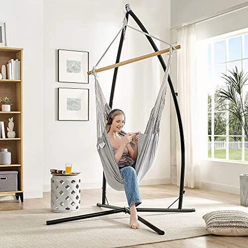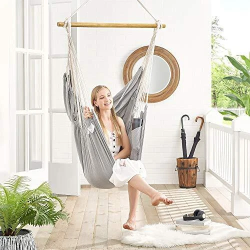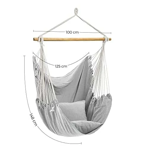 Aprašymas buvo automatiškai išverstas, gali pasitaikyti klaidų.Graži atmosfera: graži išvaizda ir didelis komfortas – ši pakabinama kėdė tikrai traukia akį ir tuo pačiu malonumą kūnui ir sielai. Svetainėje, miegamajame, terasoje, sode ar kieme – šis fotelis žavi savo prašmatnia išvaizda ir yra vieta atsipalaiduoti jums, jūsų šeimai ir draugams Išsami informacija apie produktą: Spalva: Pilka Medžiaga : Poliesterio-medvilnės audinys, poliesterio vata, medinis stulpas Sėdynės dydis: 148 x 125 cm (I x P)Dydis pagalvėlėje: 40 x 40 cm (P x P)Svoris: 2,5 kgMaks. statinė apkrova: 150 kgPristatymo komplektacija: 1 x pakabinama kėdė 2 x pagalvėlės 1 x metalinė grandinė 1 x užsegamas kabliukas 1 x instrukcijos SONGMICS Pastabos: Gaminį galima pakrauti ne daugiau kaip 150 kg. Neviršykite šio maksimalaus svorio. Nelaikykite gaminio ilgą laiką saulės šviesoje ar lietuje. Prieš naudodami visada patikrinkite gaminio būklę.