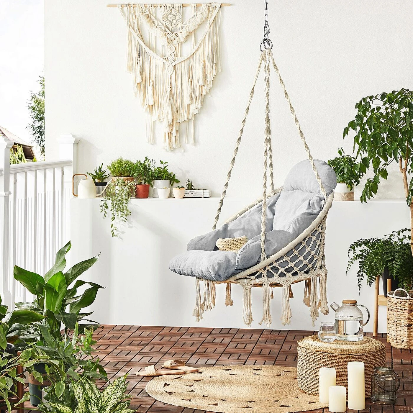 Aprašymas buvo automatiškai išverstas, gali pasitaikyti klaidų.Išlaisvink savo vidinį tinginį: saulė leidžiasi, tavo sode dūzgia paukščiai, tu sėdi toje jaukioje pakabinamoje kėdėje, prisiglaudęs prie storos sėdynės pagalvėlės, visiškai ramus ir atsipalaidavęs. Koks nuostabus vakaras! Privalomas dalykas Scandi Boho gerbėjams: Mėgstate bohemiško interjero stiliaus meninę laisvę, bet manote, kad per daug ryškių spalvų ir akį traukiančių raštų nėra jūsų idealus įvaizdis? Tuomet kodėl gi ne derinti madingą Boho stilių su ramaus skandinaviško stiliaus elementais.Vieną elementą jau radote: šią pakabinamą kėdę su kutais iš SONGMICS, kuri puikiai dera su jūsų naujai atrastu stilių deriniu.Informacija apie gaminį: - Spalva: smėlio spalvos - Medžiaga: medvilnė, metalas - Pakabinimo aukštis: 133 cm - Sėdynės skersmuo: 60 cm - Išorinio žiedo skersmuo: 80 cm - Svoris: 5 kg - Maksimali statinė apkrova: 120 kg Pristatymo apimtis: - 1 x pakabinama kėdė - 1 x Pagalvė SONGMICS Pastabos: - Maksimali šio gaminio statinė apkrova yra 120 kg. Neviršykite šio maksimalaus svorio. - Nelaikykite gaminio ilgą laiką saulės šviesoje ar lietuje. - Prieš naudodami visada patikrinkite pakabinamos kėdės stabilumą. - Vaikai turėtų naudoti šį gaminį tik prižiūrimi suaugusiųjų .