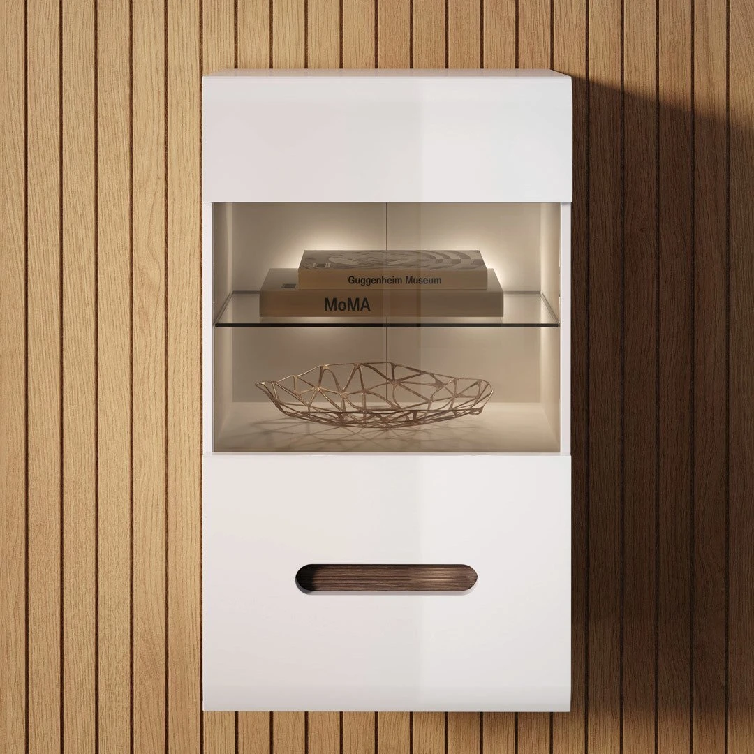 Modernaus dizaino pakabinama vitrina AZTECKA su lentynomis ir stiklu.