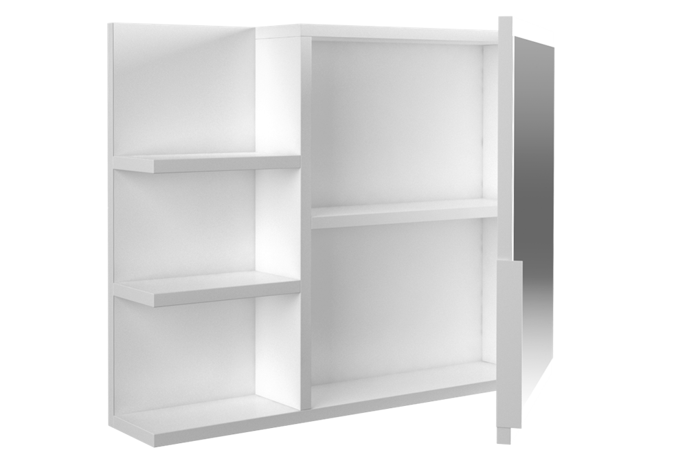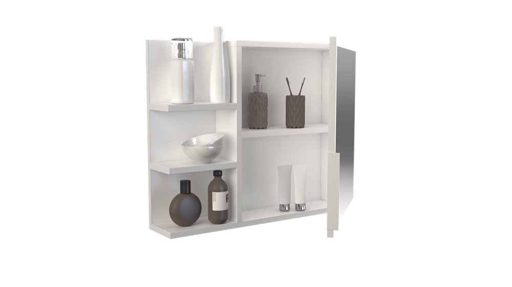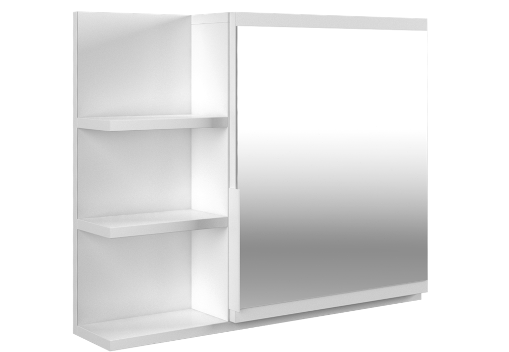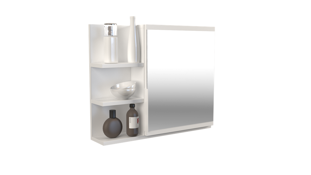 paprastas, praktiškas ir elegantiškas veidrodis su lentynomis;pagaminta iš laminuotos medžio drožlių plokštės (MDP); apsaugota nuo drėgmės; veidrodžio matmenys: plotis - 40 cm, aukštis - 44 cm; erdvi spintelė, kurios viduje - 1 lentyna, 2 skyriai;išmatavimai: plotis - 60 cm, aukštis - 50 cm, gylis - 14,1 cm;3 praktiškos lentynos;spalva: balta (matinė);Galite rinktis kairinį arba dešininį spintelės variantą; be apšvietimo.