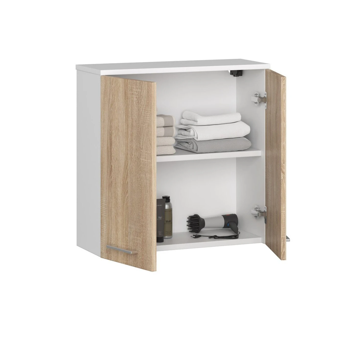 Aprašymas buvo automatiškai išverstas, gali pasitaikyti klaidų. Jei ieškote praktiškos ir universalios sieninės spintelės, atėjote ten, kur reikia. Viršutinių šio baldo durelių viduje yra lentyna, kurioje galėsite susidėti visus reikiamus vonios reikmenis. Spintos universalumas slypi tame, kad šio gaminio pakuotėje yra ir reguliuojamos pakabos pakabinimui, ir kojelės baldams pastatyti ant grindų. Šis praktiškas vonios kambario baldas yra vienos madingiausių šį sezoną -, balta/ąžuolo spalvų. Šis gaminys gali būti sėkmingai derinamas su kitais tokio paties stiliaus baldais ar net ne. Tai vienas iš universalių spalvų pasirinkimo privalumų. Gaminys komplektuojamas su sidabrinėmis durų rankenomis. Mūsų pakabinama spintelė pagaminta iš aukščiausios kokybės laminuotos plokštės. Puikiai atrodo sienos fone ir papildomai pasižymi atsparumu dilimui. Be to, baldų kraštai buvo apklijuoti ABS apvadais, apsaugančiais spintelę nuo mechaninių pažeidimų. Spintelės montavimas labai paprastas, tuomet tereikia užpildyti erdvę vonios reikmenimis. Taip pat verta paminėti, kad šiam gaminiui suteikiama 24 mėnesių garantija.