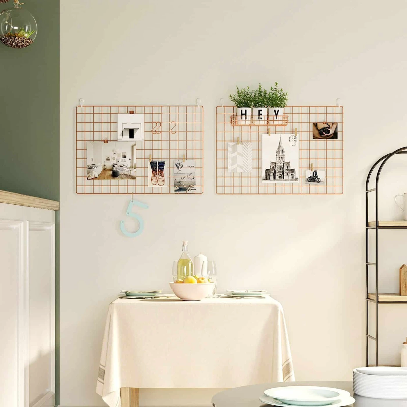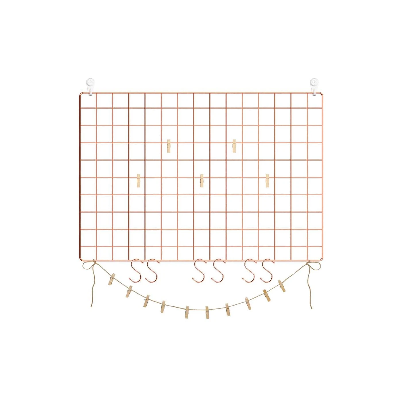 Aprašymas buvo automatiškai išverstas, gali pasitaikyti klaidų.Dėl mažų, bet svarbių dalykų gyvenime: ar jūsų sąskaitos ir kvitai visada nepaaiškinamai išnyksta? Ar vis nesilaikote savo projektų terminų? Tada jums reikia skaidinio, kuriame galėtumėte pakabinti sąskaitas, svarbius užrašus ar kitus smulkius daiktus. Jums bus naudinga, jei viskas bus tvarkinga. Dovana mylimam žmogui ar sau: paverskite šią tinklelio sienelę gimtadienio, kalėdine dovana arba dovana „tik todėl, kad aš tave myliu“ ir sukurkite unikalią rodymo sritį nuotraukoms, kurios jums primena ir jūsų artimuosius apie gerus kartu praleistus laikus. Jei jums asmeniškai patinka ši stilinga sieninė lentyna, kodėl gi nepasilepinus ja?Produkto informacija: Spalva: rožinis auksas Medžiaga: geležis Kiekvienos lėkštės dydis: 65 x 45 cm (P x P) Kanapių virvelės ilgis: 1 m Svoris: 1,6 kg Maks. Keliamoji galia: 5 kg Pristatymo komplektas: 2 x grotelių plokštė6 x S formos kablys 1 x kanapinis virvelė 30 x medinis spaustukas4 x nežymus sieninis kablys 1 x plaktukas (19 cm) 1 x instrukcijos (DE,EN,FR,ES,IT)SONGMICS užrašai :- Gaminį laikykite vaikams ir naminiams gyvūnėliams nepasiekiamoje vietoje.- Nekabinkite ant lėkštės daiktų, sveriančių daugiau nei 5 kg.- Maksimali apkrova tekste nurodo didžiausią statinį svorį.