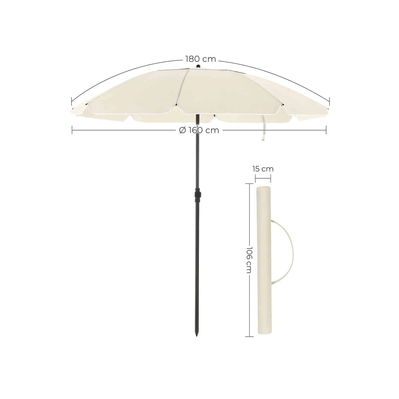 Aprašymas buvo automatiškai išverstas, gali pasitaikyti klaidų.Mėgaukitės gražiu oru pavėsyje! Lauko sezonas prasidėjo ir metas keliauti į sodą, terasą ar paplūdimį! Bet saugokis! Pagalvokite apie tinkamą apsaugą nuo saulės! Kai po ilgų, šaltų žiemos dienų pagaliau susigrąžinate savo lauko erdvę ir pasikviečiate draugus ant grotelių, atėjo puiki akimirka pasinaudoti naujuoju SONGMICS skėčiu! Vasarą būtina turėti Šį skėtį galima lenkti į kairę ir į dešinę. Taigi galite pritaikyti jį prie paros laiko ir šviesos kritimo kampo. Skėčio skersmuo 1,6 m, aukštis 2,1 m. Po apsauga nuo saulės telpa 1-2 žmonės. Skėčio stiebas taip pat pagamintas iš nerūdijančio plieno. Be to, poliesterio apsauginė šluostė užtikrina puikią UV apsaugą iki UPF 50+.Informacija apie gaminį: - Spalva: smėlio spalvos - Medžiaga: milteliniu būdu dengtas plienas, 160 g/m² poliesteris, stiklo pluoštas - Aukštis: 2,1 m - Lanko ilgis: 1,8 m - Ø gaubtas: 1,6 m - Ø gaubto stulpas: 22/25 mm , Sienelės storis: 0,5 mm- Svoris: 1,6 kg Pristatymo komplektas:- 1 x skėčiais- 1 x nešiojimo krepšys SONGMICS Pastabos:- Stovas skėčiui į komplektą neįeina.- Naktį ir pučiant stipriam vėjui skėtį uždaryti.- Nerekomenduojama naudoti šis skėtis skirtas naudoti lietingu oru.