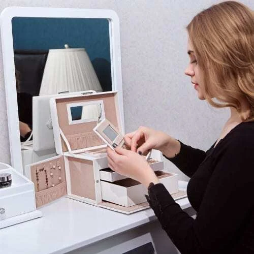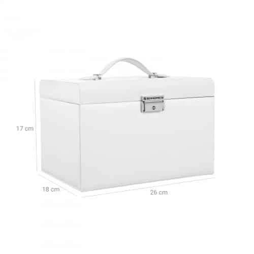 Aprašymas buvo automatiškai išverstas, gali pasitaikyti klaidų.Ar jus erzina, kad jūsų karoliai visada susipainioję, o žiedai guli kažkur bute? Tada laikas įsigyti šį elegantišką papuošalų laikiklį iš SONGMICS, kad galėtumėte tvarkingai laikyti vertingus papuošalus. Apsaugo visus jūsų priedusŠi papuošalų dėžutė turi daug skyrių įvairiems papuošalams ir užtikrina, kad jūsų apyrankės, žiedai, auskarai, karoliai ir kt. bus saugiai laikomi. Minkštas aksominis pamušalas apsaugo jūsų papuošalus nuo įbrėžimų ir kitų pažeidimų. Jei jūsų draugės taip pat yra papuošalų mėgėjos, viena iš šių dėžučių būtų ideali dovana, tiesa? Išsami informacija apie gaminį:- Spalva: balta- Medžiaga: PU, MDF (vidutinio tankio medienos plaušų plokštė), aksomas- Gaminio dydis: 26 x 18 x 17 cm (P x P x A)- Mini dėžutės dydis: 14 x 9 x 3,5 cm ( P x P x A) - Svoris: 1,8 kg Pristatymo komplektas: - 1 x papuošalų dėžutė - 2 x raktai - Nuotraukose pavaizduoti papuošalai į pristatymo komplektą neįeina