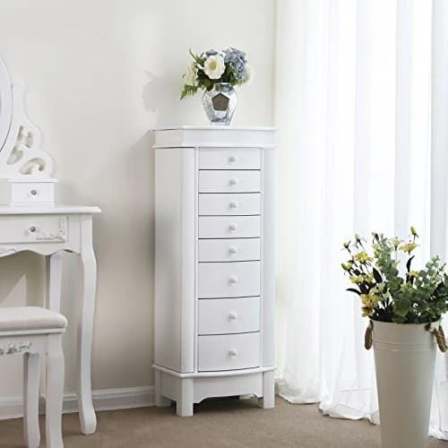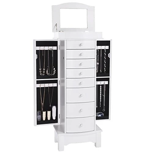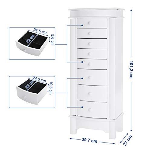 Aprašymas buvo automatiškai išverstas, gali pasitaikyti klaidų.Rafinuotas sandėliavimo išdėstymas Įvairių dydžių stalčiai atitiks Jūsų poreikius. Apyrankės, žiedai, auskarai, karoliai, akiniai nuo saulės, laikrodžiai, plaukų juostelės ir kiti stambūs aksesuarai turi savo vietą. Nebereikia jaudintis dėl erzinančių naudojimo aplinkybių. Didelį dėmesį skiriame gaminio detalėms. Vėrinių kabliukai yra platesni ir tvirtesni, dėtuvės apačioje suteikia papildomos vietos daiktams laikyti ir taip pat apsaugo ilgus karolius nuo įstrigimo durelėse. Dangtelyje esančio veidrodžio dėka galėsite iš karto grožėtis papuošalais ir užbaigti savo dizainą. aukštyn. Apsaugos nuo virtimo įtaisas tuo pasirūpina tolesniam saugiam naudojimui.Išsami informacija apie gaminį: Gaminio matmenys: 39,7 x 101,2 x 27 cm (P x A x A) Pakuotės matmenys: 109 x 35 x 48 cm Veidrodžio matmenys: 25 x 17,5 cm Spalva: baltaMedžiaga: MDF plokštės, aksominis pamušalas Pristatymo dėžutės apimtis 1 x 1 papuošalas x instrukcijos (DE, EN, IT, FR, ES)