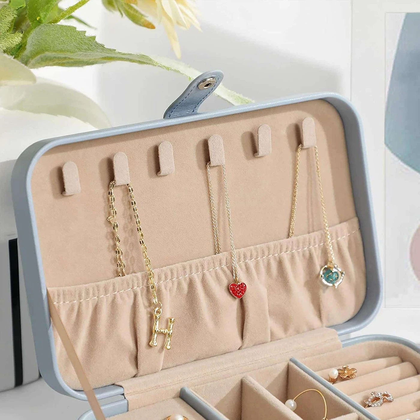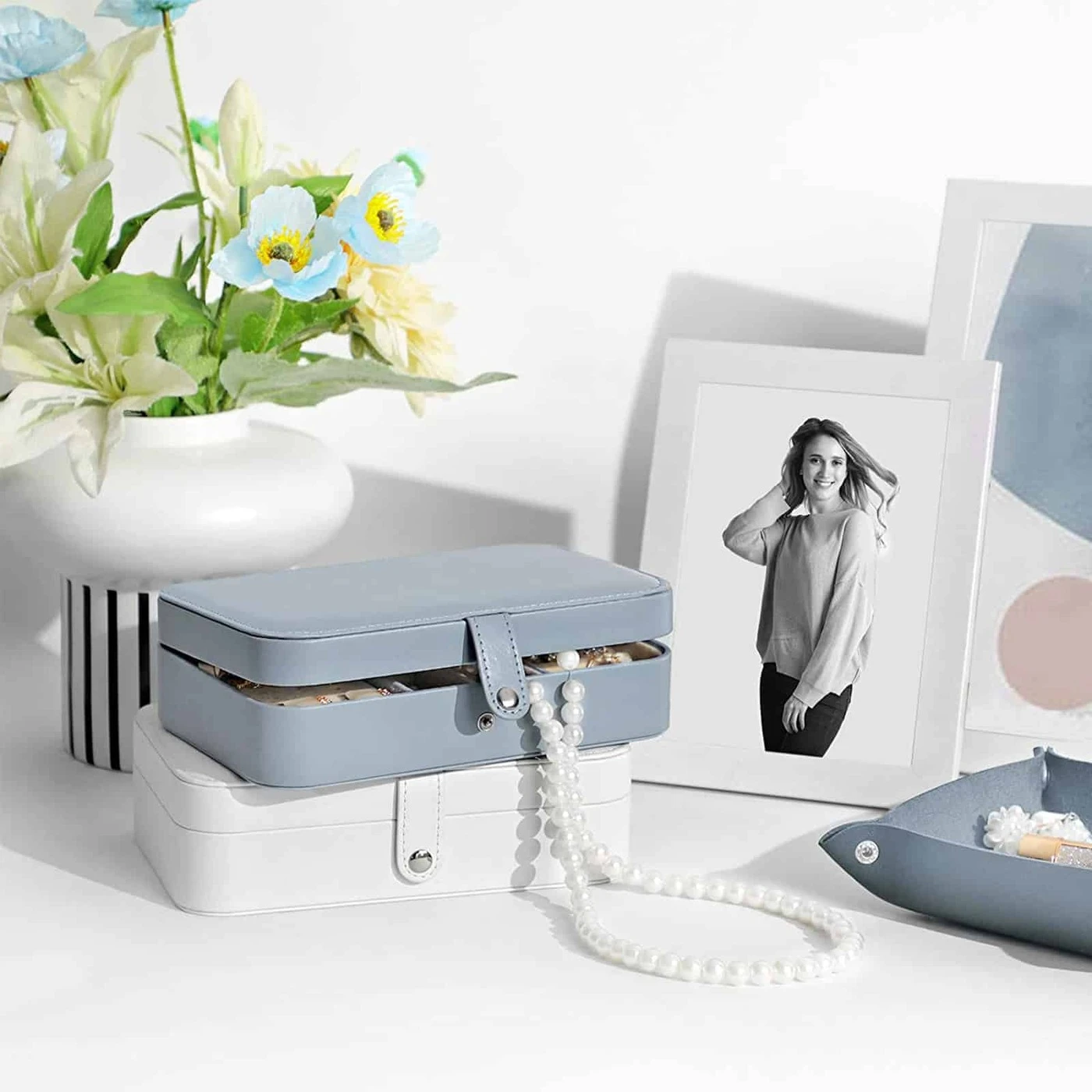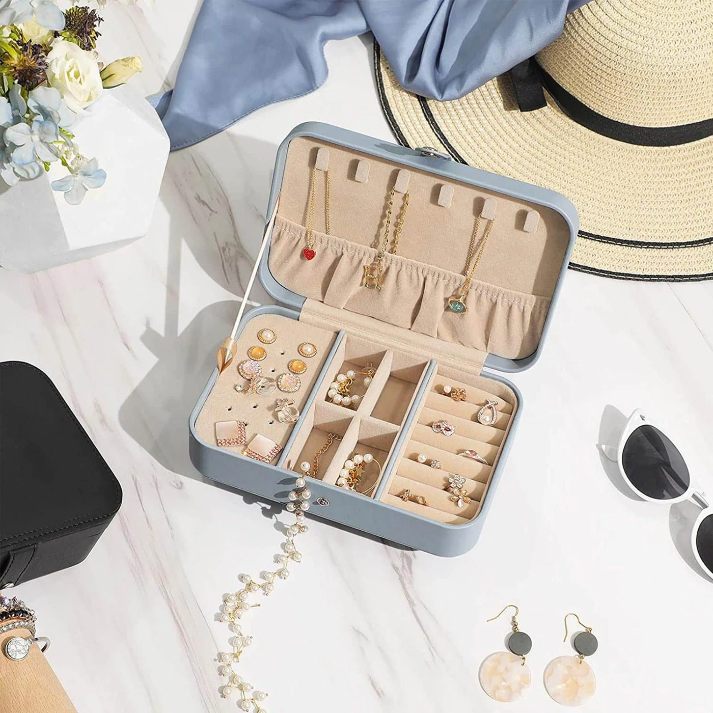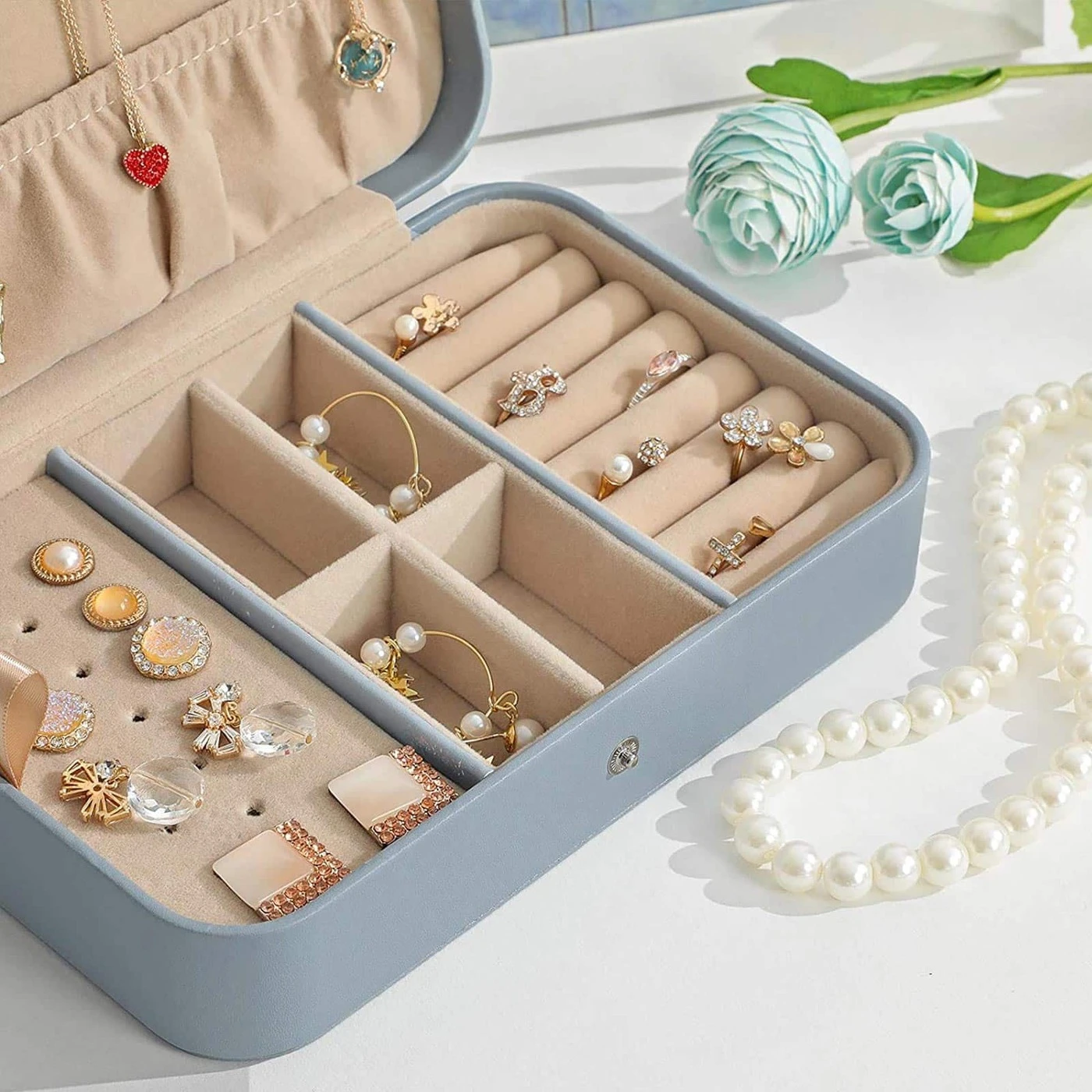 Aprašymas buvo automatiškai išverstas, gali pasitaikyti klaidų.Aukščiausia apsauga: nėra nieko blogiau, kaip po ilgo skrydžio išnarplioti susivėlusį vėrinį. O kur tavo mėgstamiausias auskaras? Kodėl nesudėjus visų savo papuošalų į šį kompaktišką kelionių papuošalų dėklą? Kelionės metu jis gali atlaikyti smūgius, stumdymą ir kitokį piktnaudžiavimą, todėl jūsų papuošalai į paskirties vietą atkeliauja nepažeisti ir tvarkingai išdėstyti. Viskas, ko jums reikia: Pagaminta iš aukštos kokybės dirbtinės odos, minkšto aksomo pamušalo ir MDF, šis papuošalų laikiklis yra patvariausias tokio tipo Keliautojai ir papuošalų mėgėjai taip pat įvertins šiuos privalumus.6 kabliukai dangtelyje pakabinti karolius ir apyrankes.1 šoninė kišenė, kad ilgi karoliai liktų vietoje.1 šarnyrinis padėklas su 17 skylių auskarams su segtukais.1 paslėptas. skyrius po paklotu siūlo dar daugiau erdvės.4 maži skyreliai su nuimama pertvara auskarams ir pakabukams.8 ritinėliai žiedams ar rankogaliams.Informacija apie gaminį: Spalva: balta Medžiaga: PU (poliuretanas), aksomas, MDF (vidutinio tankio medienos plaušų plokštė) Dydis: 19,7 x 12,5 x 5 cm (P x P x A) Svoris: 0,3 kg Pristatymo komplektas: 1 x papuošalų dėžutė
