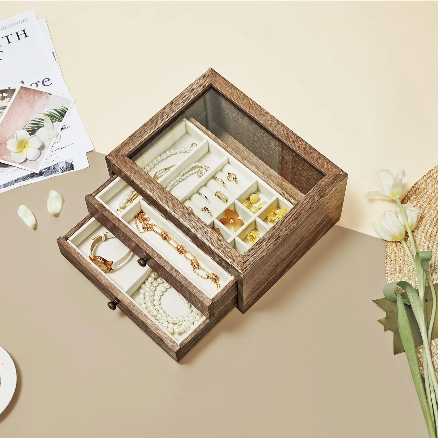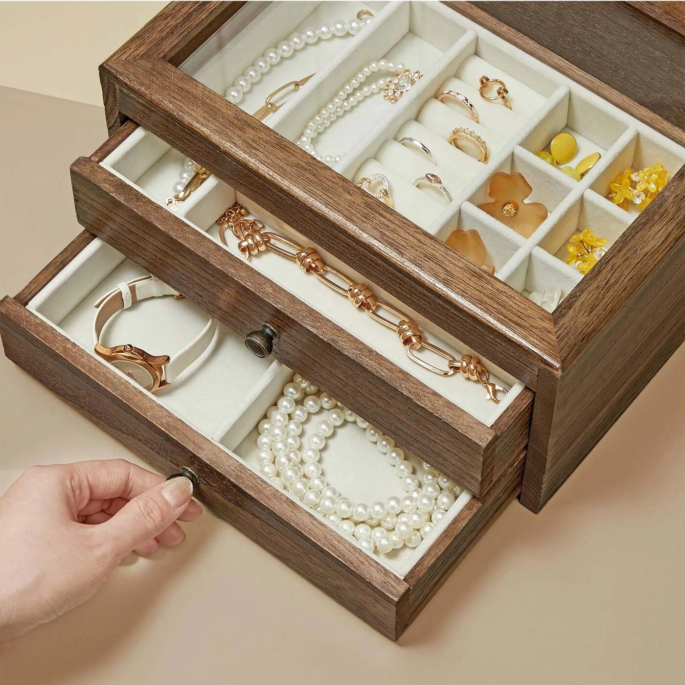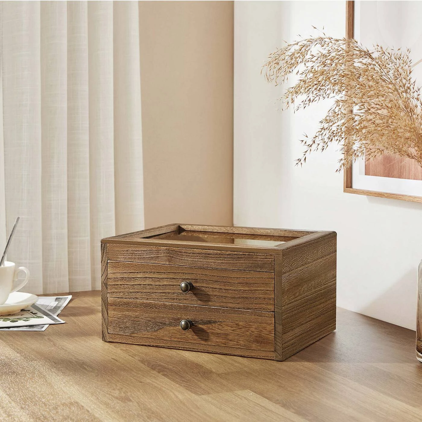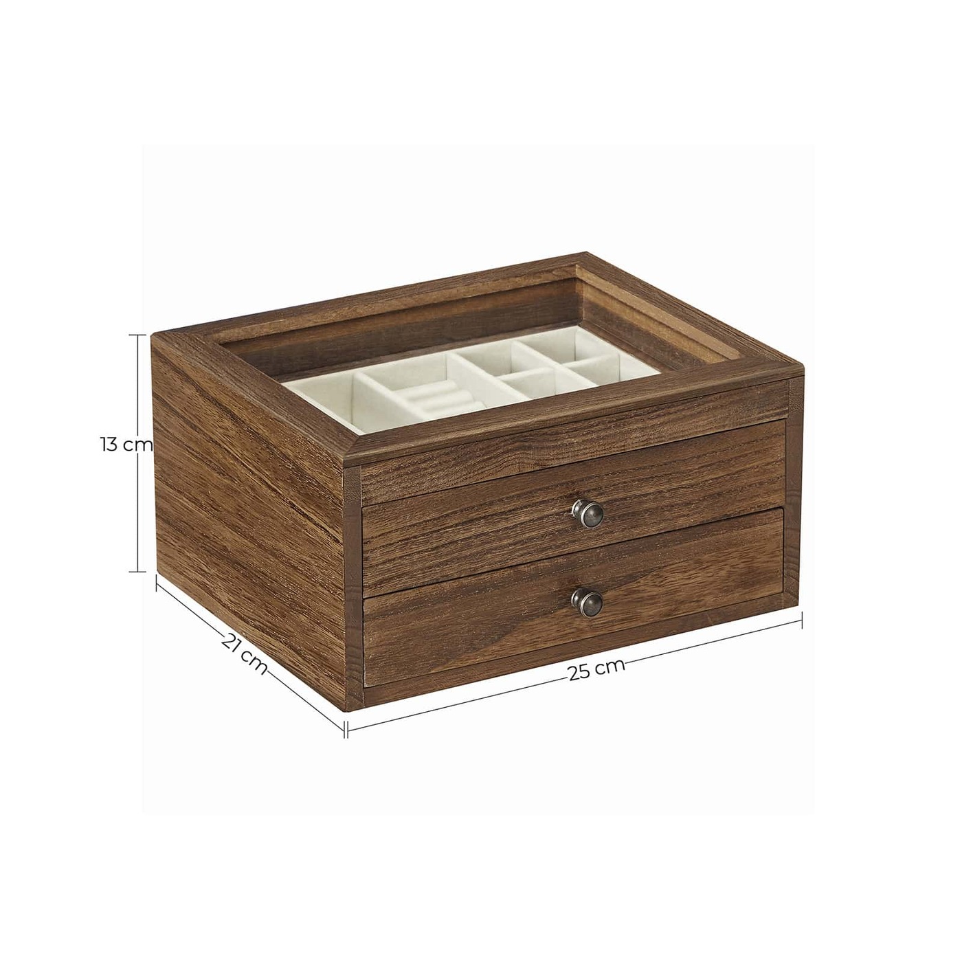 Aprašymas buvo automatiškai išverstas, gali pasitaikyti klaidų. Sveika! Viskas čia! Apyrankės, karoliai, auskarai ir žiedai atranda naujus namus šioje praktiškoje papuošalų dėžutėje. Nebereikia gaišti laiko ieškant papuošalų miegamajame – tai tiesiai prieš akis! Atsisveikinimas su chaosu! Atsisveikinkite su grandinių netvarka ant tualetinio stalo. Atidarykite šią papuošalų dėžutę, ištraukite stalčius ir tvarkingai sudėkite įvairius savo lobius. Išsirinkti tinkamus papuošalus gali būti nesunku. Suteikite savo aprangai apdailą kiekvieną dieną.Informacija apie gaminį: - Spalva: ruda - Medžiaga: Paulownia mediena, aksomas, stiklas - Dydis: 25 x 21 x 13 cm (P x P x A) - Svoris: 1,3 kg Pakuotės turinys: - 1 x papuošalų dėžutė SONGMICS Pastabos: - Ar nedėkite ant gaminio per sunkių daiktų.- Nelaikykite gaminio ilgą laiką tiesioginiuose saulės spinduliuose.