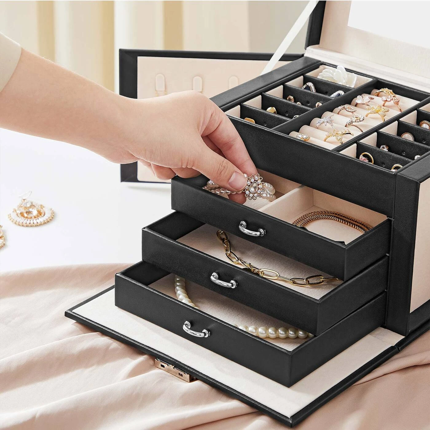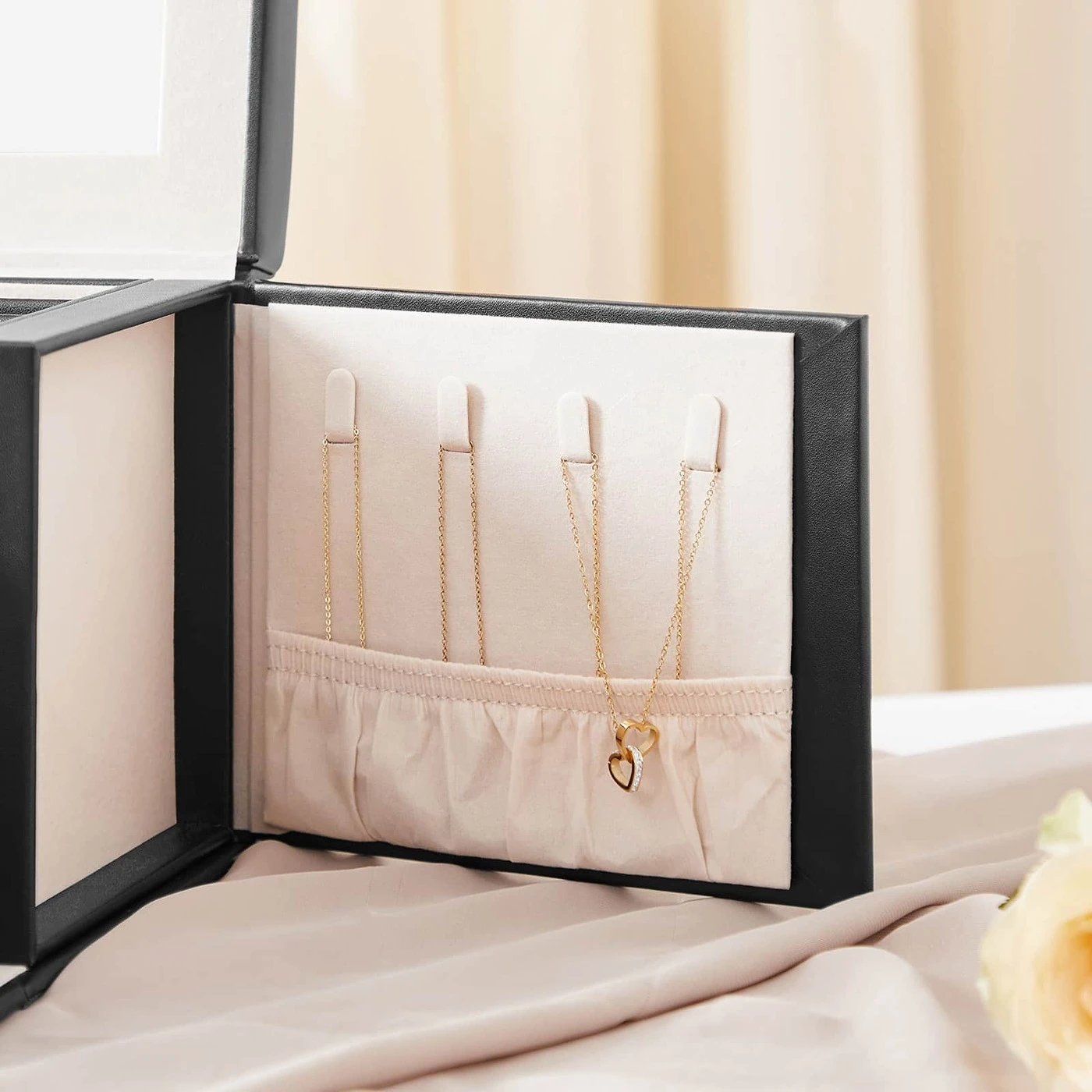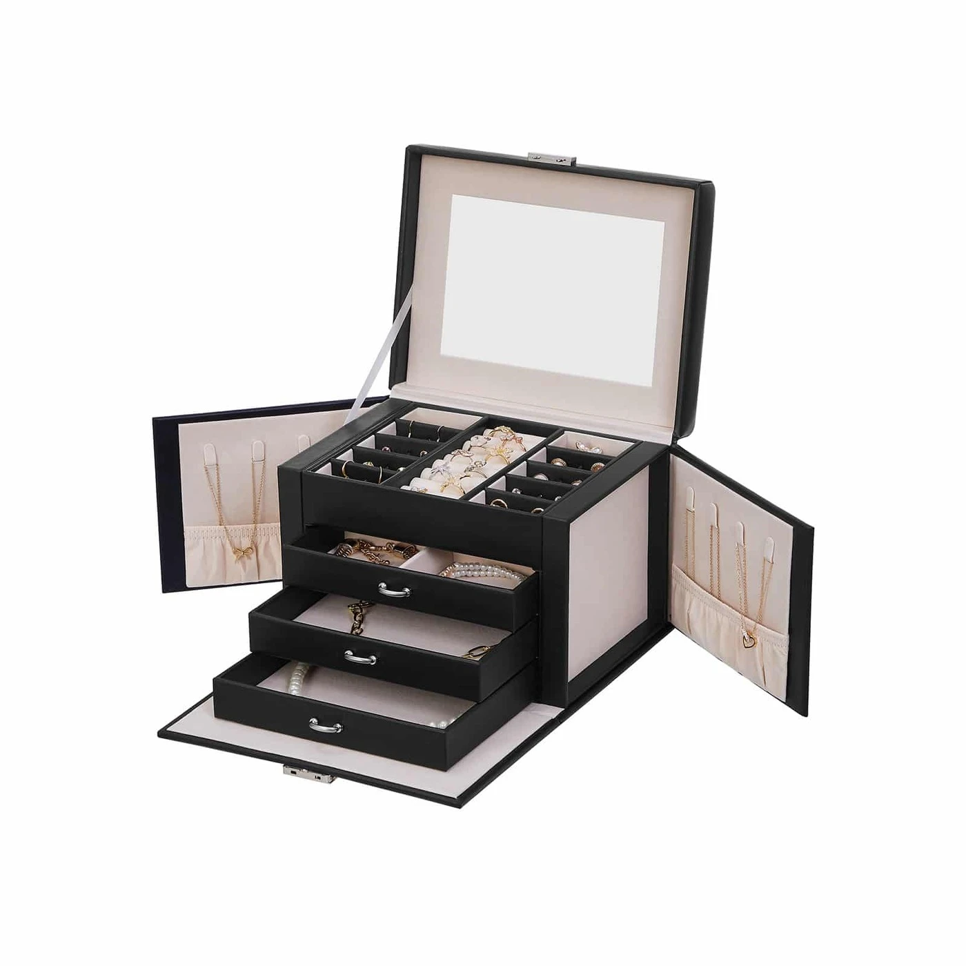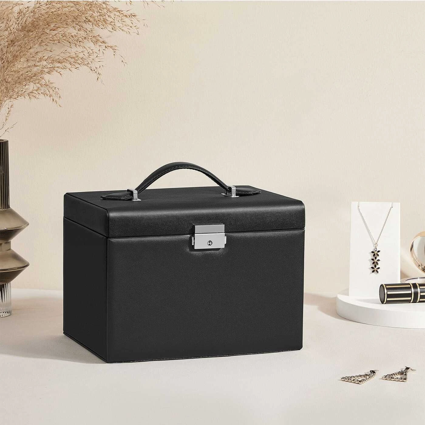 Aprašymas buvo automatiškai išverstas, gali pasitaikyti klaidų.Originalus – už sėkmingą dovaną! Pfu... Ketinate ateiti į draugo gimtadienį tuščiomis rankomis, nes neturite geros dovanos idėjos? Ne ne ne! Verčiau rinkitės šią naudingą, praktišką ir originalią papuošalų dėžutę ir įteikite dovaną kartu su geriausiais linkėjimais!Parodome visus svarbiausius šios papuošalų dėžutės akcentus:Dydis tinka visai papuošalų kolekcijai.3 stalčiai apyrankėms ir kaklo papuošalams, 1 stalčius su nuimamais skirstytuvais.10 skyrelių auskarams, sagėms ir pakabukams, su išimamais pertvaromis su skylutėmis 20 auskarų su smeigtukais.9 lizdai žiedams.8 kabliukai kaklo papuošalams.2 kišenės pakabukams.2 rakteliai dėžutei uždaryti.Informacija apie gaminį: Spalva: juoda Medžiaga: MDF (vidutinio tankio medienos plaušų plokštė), aksominis pamušalas Dydis: 22,5 x 17,5 x 16,5 cm (P x P x A) Svoris: 1,6 kg Pristatymo komplektas: 1 x papuošalų dėžutė 2 x raktai