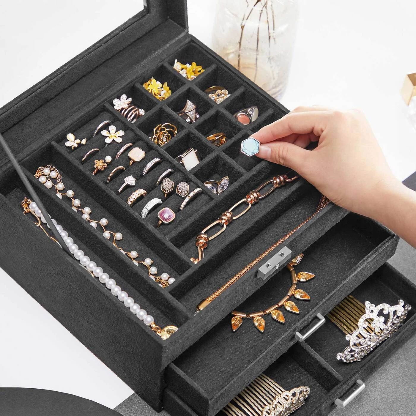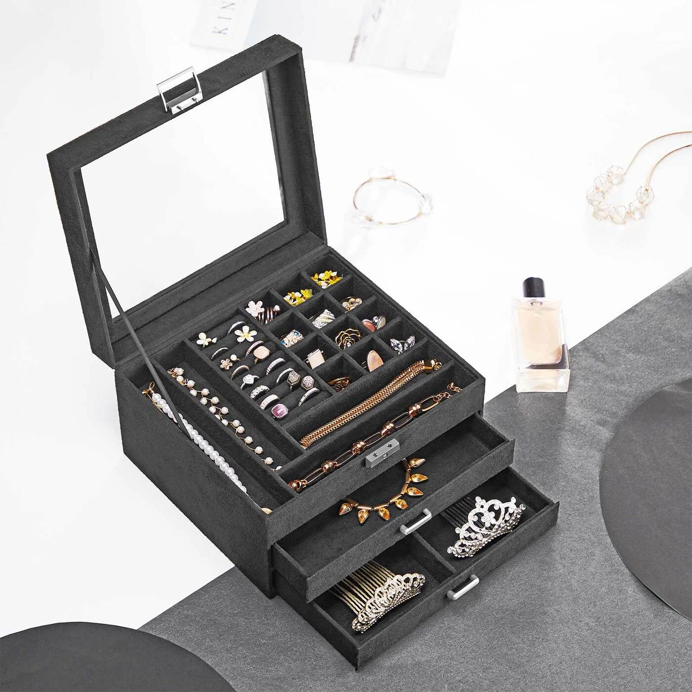 Aprašymas buvo automatiškai išverstas, gali pasitaikyti klaidų.Geros naujienos papuošalų mylėtojams Ar parduotuvėje žavitės spindinčiais papuošalais, bet negalite jų parsinešti namo, nes nebelieka vietos naujiems papuošalams? Vienas auskaras guli ant jūsų tualetinio staliuko, o kitas dingo dėl neaiškių priežasčių? Ši 3 pakopų papuošalų dėžutė jums padės. SONGMICS supranta, kaip svarbu tvarkyti papuošalų kolekciją. Šios papuošalų dėžutės akcentai: - aksominis viršelis ir pamušalas; minkštas ir atsparus dilimui - Stabili konstrukcija, pagaminta iš medienos gaminio - Skaidrus stiklo dangtis - Tvarkingai išbaigtos siūlės; Cinko lydinio rankenos – pilkas tonas – 2 stalčiai, 8 ratukai žiedams, 12 kvadratinių skyrių ir 4 siauri skyriaiInformacija apie gaminį: - Spalva: pilka - Medžiaga: MDF (vidutinio tankio medienos plaušų plokštė), aksomas - Dydis: 23,2 x 20,5 x 14 cm (P x P x A) - Svoris: 1,3 kg Pristatymo komplektas: - 1 x papuošalų dėžutė - 1 x KeySONGMICS Pastabos: - Raktas labai mažas. Todėl laikykite jį saugioje, vaikams nepasiekiamoje vietoje, kad išvengtumėte pavojaus sveikatai įkvėpus ar prarijus raktą.