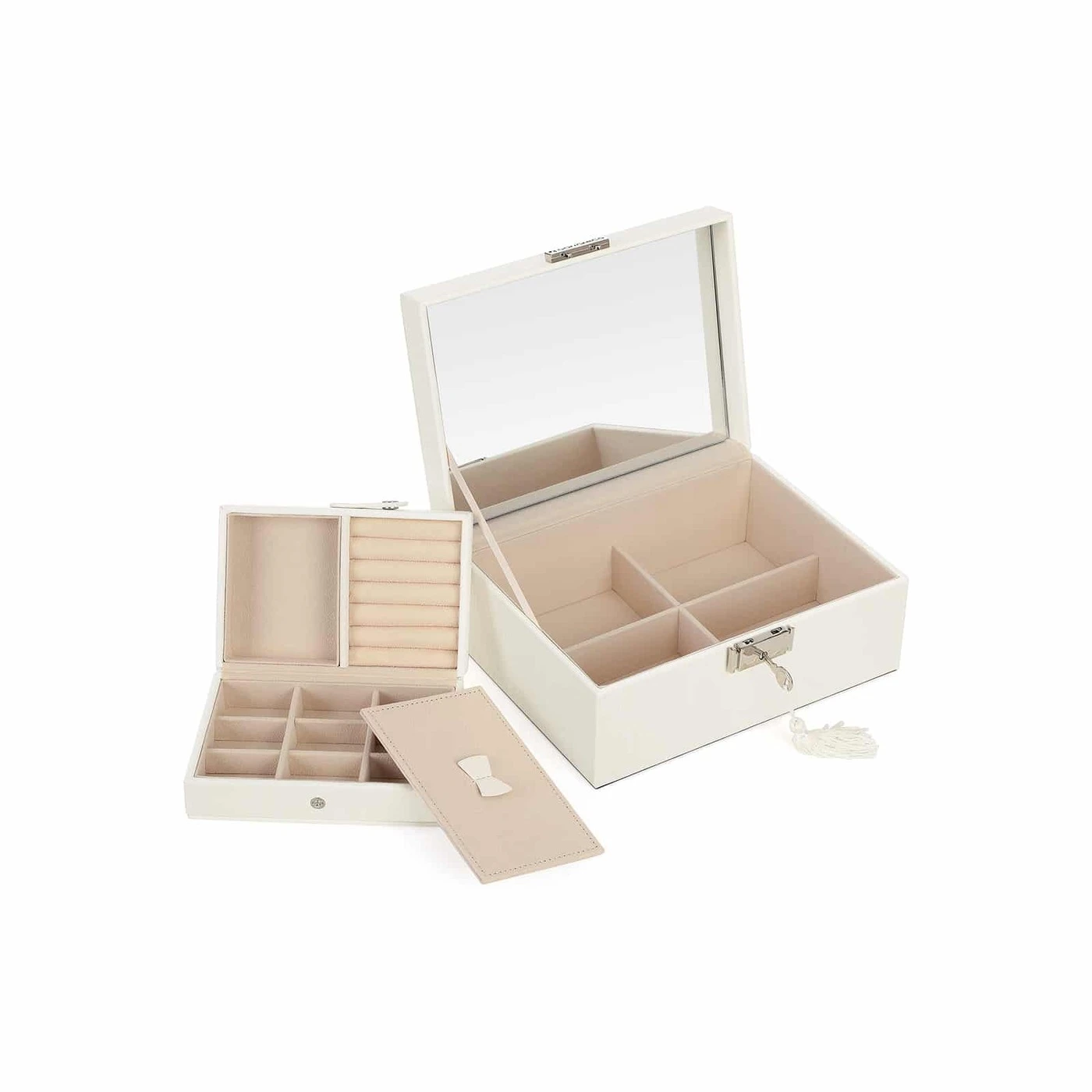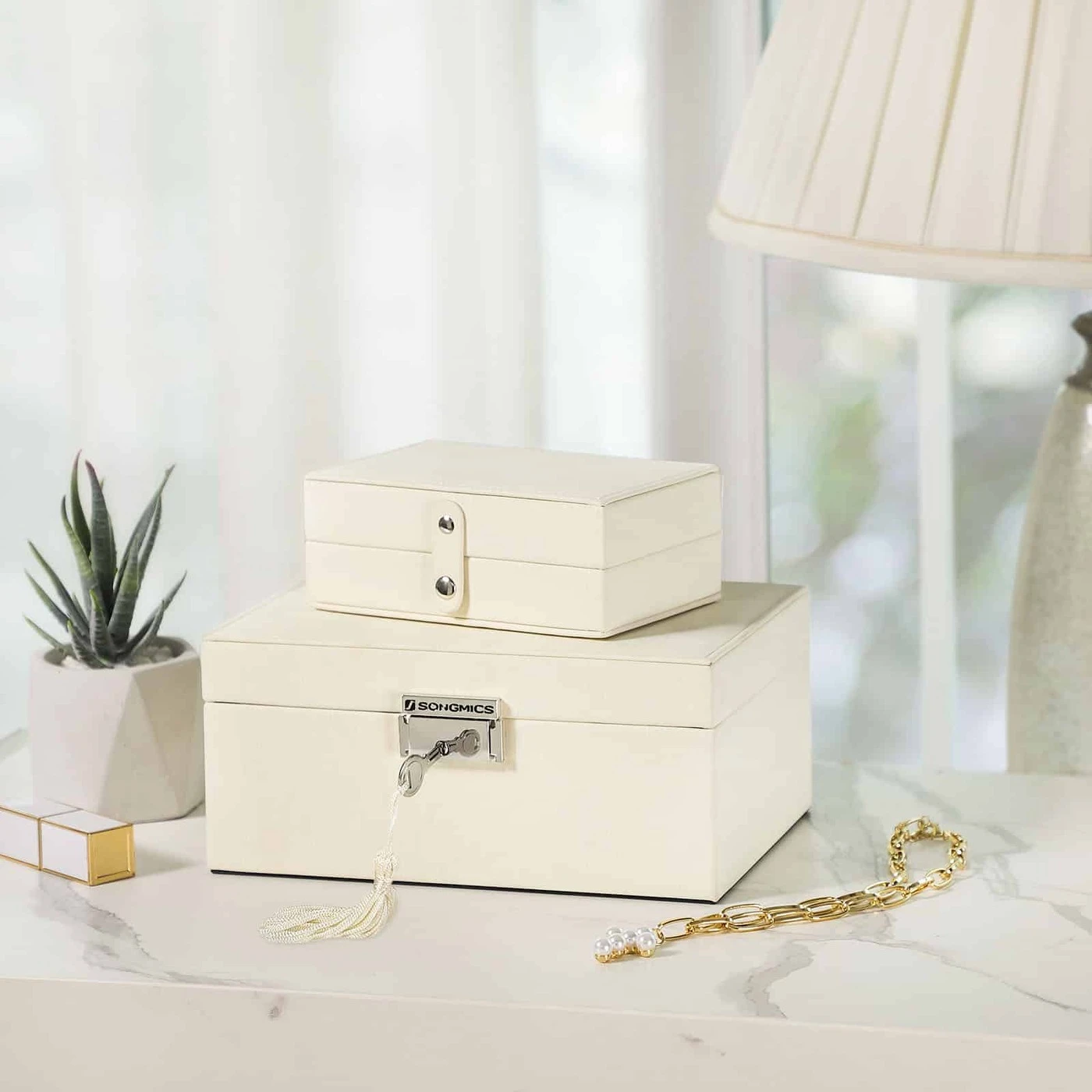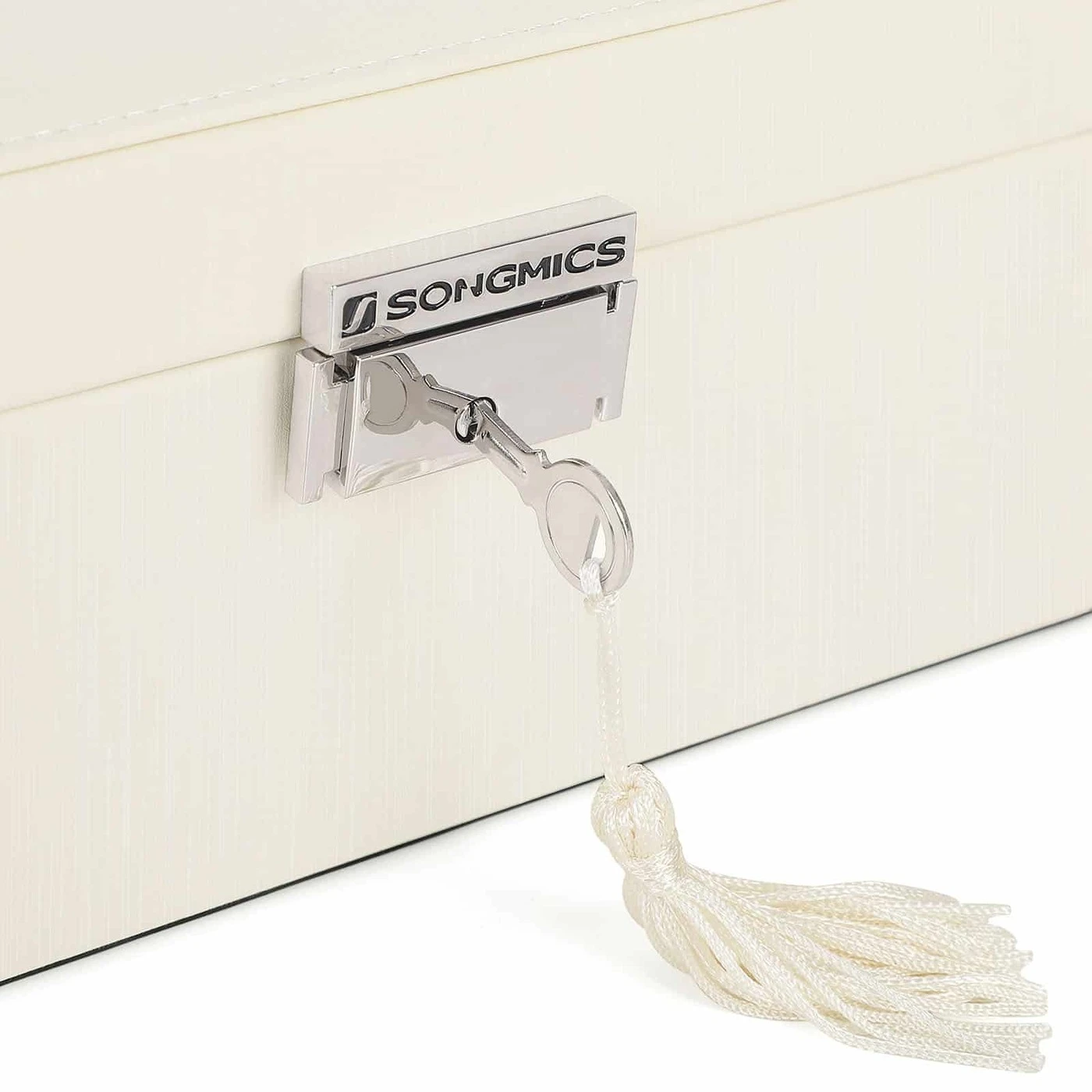 Aprašymas buvo automatiškai išverstas, gali pasitaikyti klaidų.Informacija apie gaminį: - Spalva: dramblio kaulo baltas PU, smėlio spalvos pamušalas - Medžiaga: MDF (vidutinio tankio medienos plaušų plokštė), PU, aksomas, stiklas - Gaminio dydis: 22 x 16 x 10 cm (P x P x A) - Produkto svoris: 0,8 kgPristatymo komplektacija: - 1 x papuošalų dėžutė - 1 x raktas