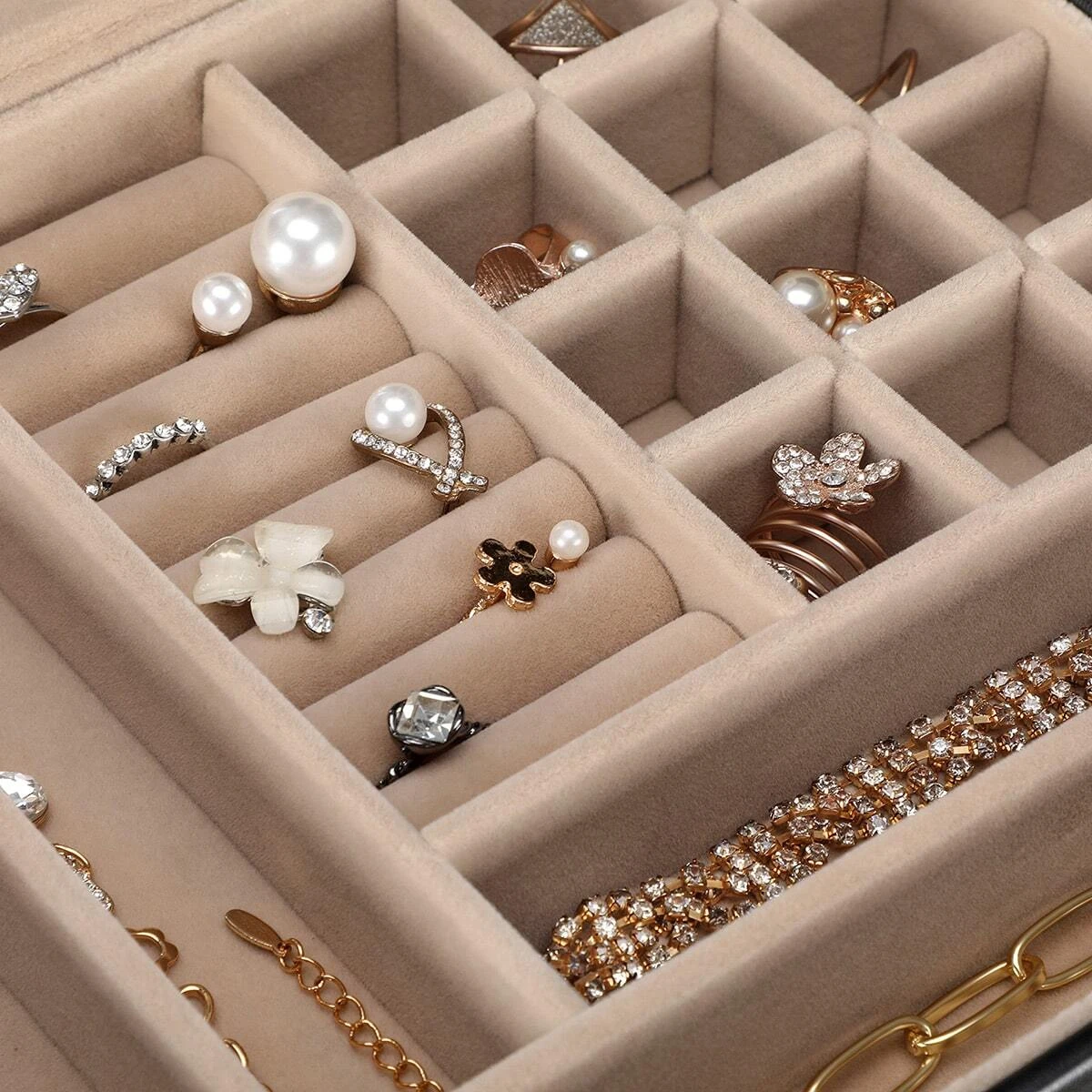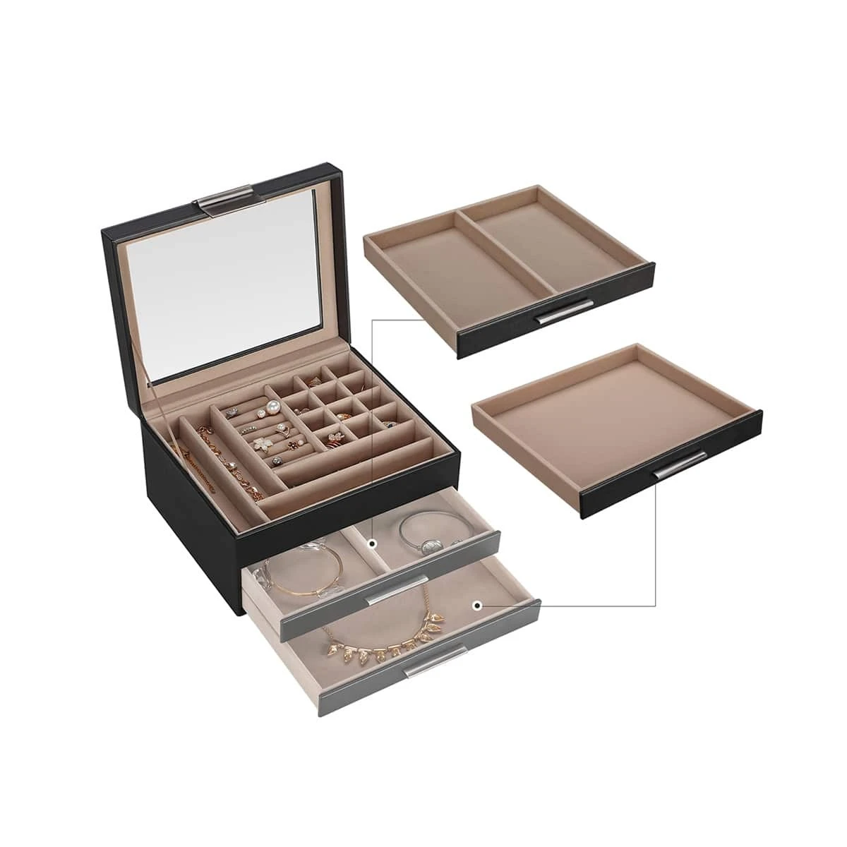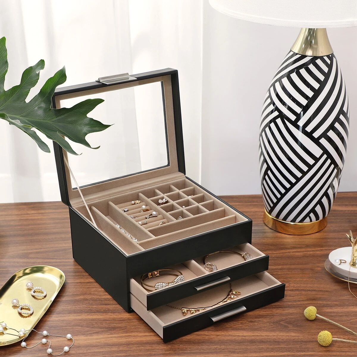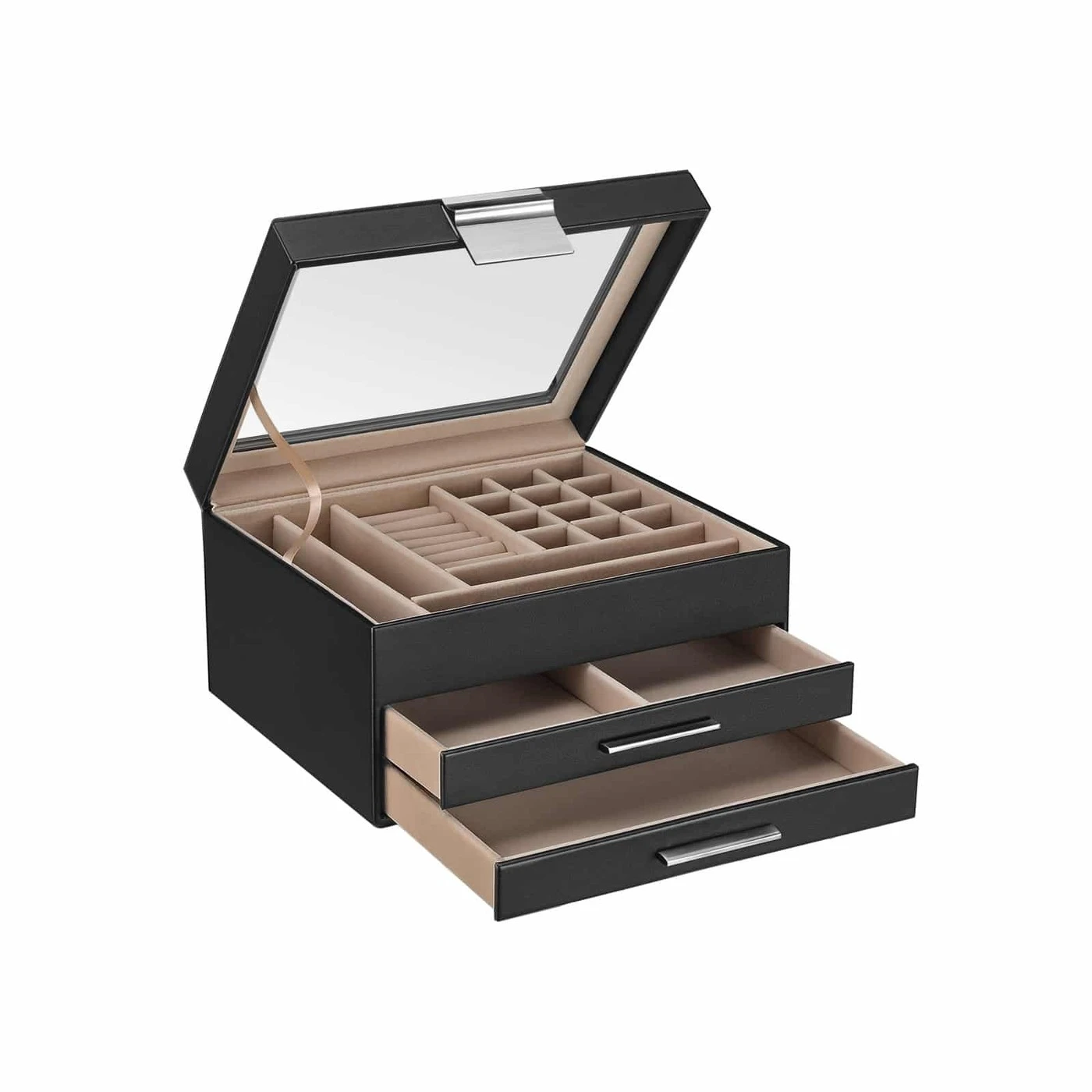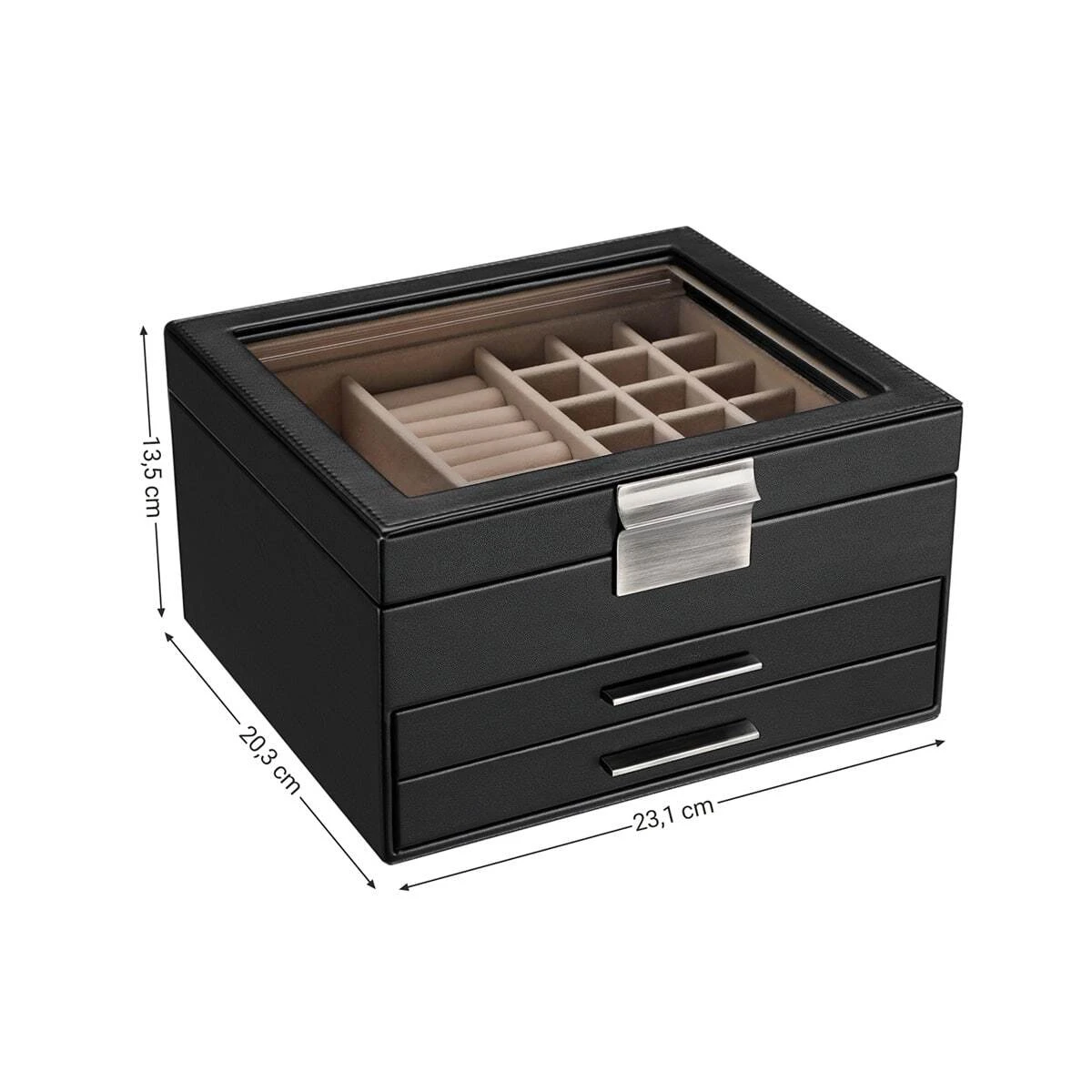 Aprašymas buvo automatiškai išverstas, gali pasitaikyti klaidų.Lengva prieiga prie reikalingų papuošalų Prieš eidami į darbą ar į pasimatymą nesikrapšykite netvarkingame stalčiuje, kad surastumėte tinkantį vėrinį. Ši papuošalų dėžutė su stikliniu dangteliu padeda laikyti visus papuošalus vienoje vietoje, tvarkingai ir lengvai pasiekiamoje vietoje. Smulkius daiktus, kuriuos norite apsaugoti nuo smalsių akių, galite sutalpinti dviejuose skirtingo išplanavimo stalčiuose. Dovana artimiesiems ar sau Dėl patrauklios išvaizdos ši dėžutė puikiai tiks kaip dovana gimtadienio, jubiliejaus ar savęs meilė-tu siurprizas savo mylimam žmogui. Jei jums asmeniškai patinka ši elegantiška papuošalų dėžutė, kodėl gi nepadovanojus sau dovanos?Informacija apie gaminį: - Spalva: Juoda - Medžiaga: MDF (vidutinio tankio medienos plaušų plokštė), PU (poliuretanas), aksomas, stiklas - Dydis: 23,1 x 20,3 x 13,5 cm (P x P x A) - Svoris: 1, 4 kg Pakuotės turinys: - 1 x papuošalų dėžutė