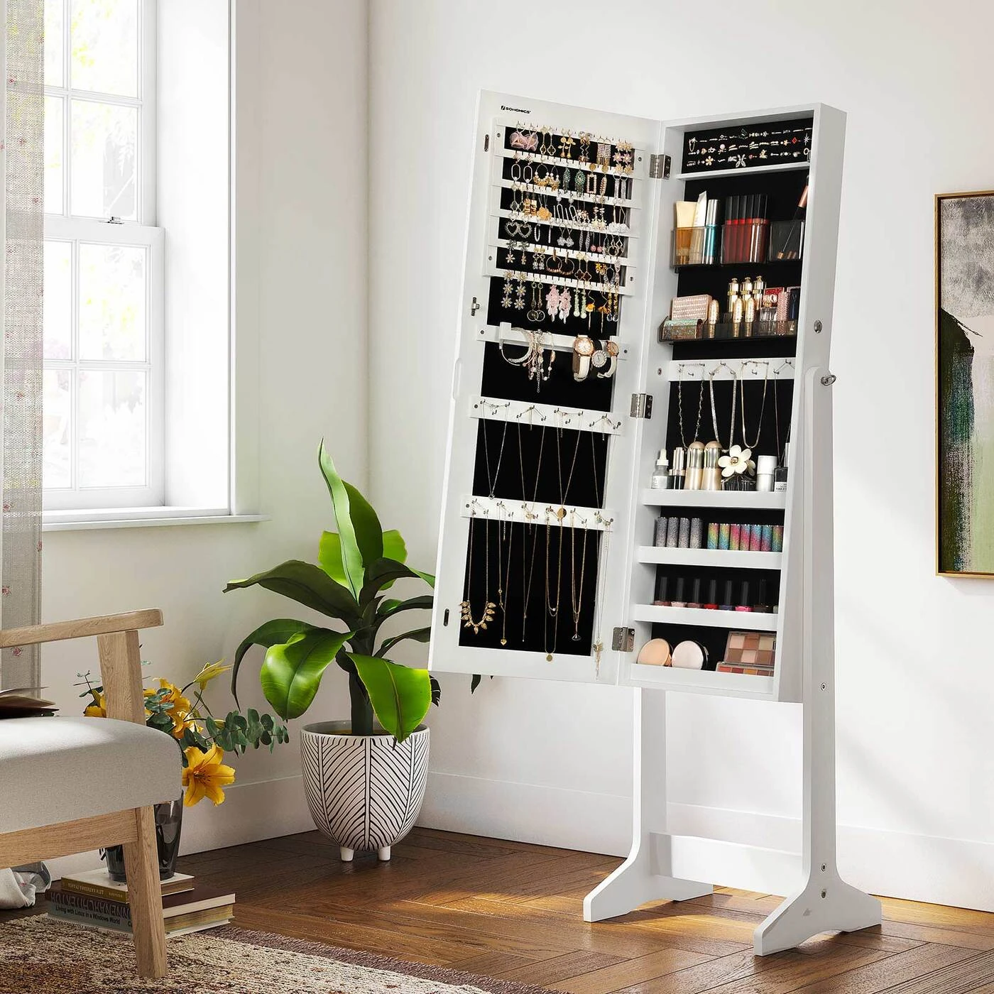 Aprašymas buvo automatiškai išverstas, gali pasitaikyti klaidų.Puikiai suprojektuotas iš namų Jūs jau išsirinkote savo aprangą, bet jai vis dar trūksta kažko? Tiesiog atidarykite šios papuošalų spintelės dureles, kad surastumėte apdailą savo išvaizdai! Auksiniai auskarai ir miela apyrankė su gėlėmis puikiai derėtų prie jūsų suknelės, ar ne? Sustabdyti! Nepamirškite, kad jūsų makiažas taip pat yra šioje papuošalų spintelėje. Taigi papildykite savo išvaizdą tinkamais papuošalais ir makiažu, o tada grožėkitės rezultatu praktiškame viso ūgio veidrodyje! Vieta, kur jūsų papuošalai jaučiasi saugūs Nepalikite papuošalų ir makiažo pūti tamsiuose stalčiuose! Šioje veidrodinėje spintelėje galite laikyti savo lobius kaip vitrinoje ir apsaugoti juos nuo dulkių ir vagių spyna ir dviem raktais. Perlų karoliai, apyrankės, auskarai ir makiažo reikmenys iš karto jausis kaip namuose šioje įmantrioje papuošalų spintelėje!Išsami informacija apie gaminį: - Spalva: balta - Medžiaga: MDF (vidutinio tankio medienos plaušų plokštė) - Bendras dydis: 41,2 x 36,5 x 152 cm (I x P x A) - Spintelės korpuso dydis: 37,5 x 9,7 x 108 cm (P x P) x H) - Svoris: 11,4 kg Pristatymo apimtis: - 1 x papuošalų spintelė - 2 x raktai - 1 x priedų paketas - 1 x Apsaugos nuo virtimo - 1 x rankinis (DE, EN, FR, ES, IT) SONGMICS Pastabos: - Vaikai Saugumo sumetimais draudžiama lipti ar žaisti su gaminiu.- Pritvirtinkite šį gaminį prie sienos su komplekte esančiu apsaugančiu nuo apvirtimo.