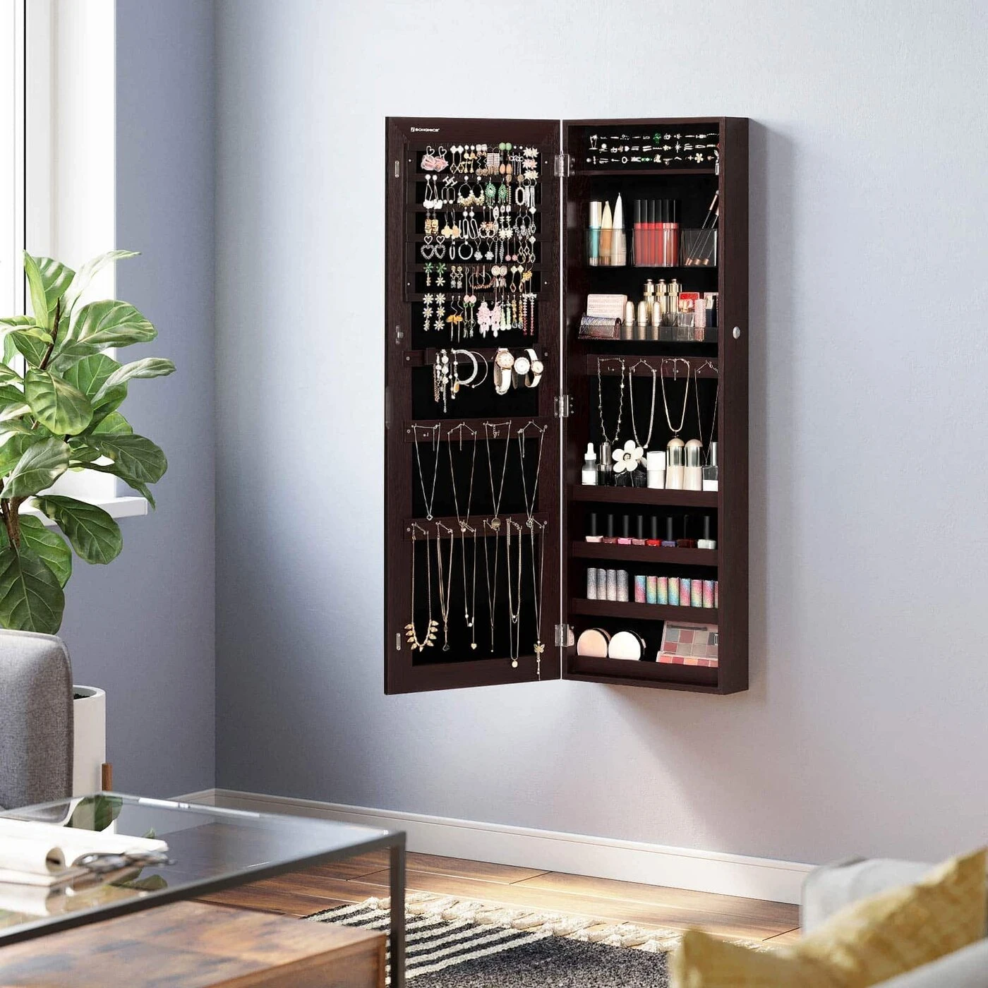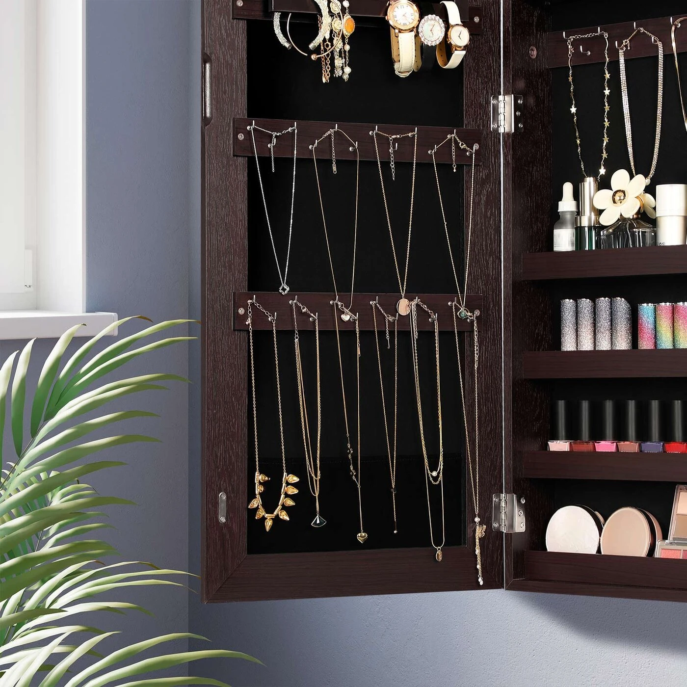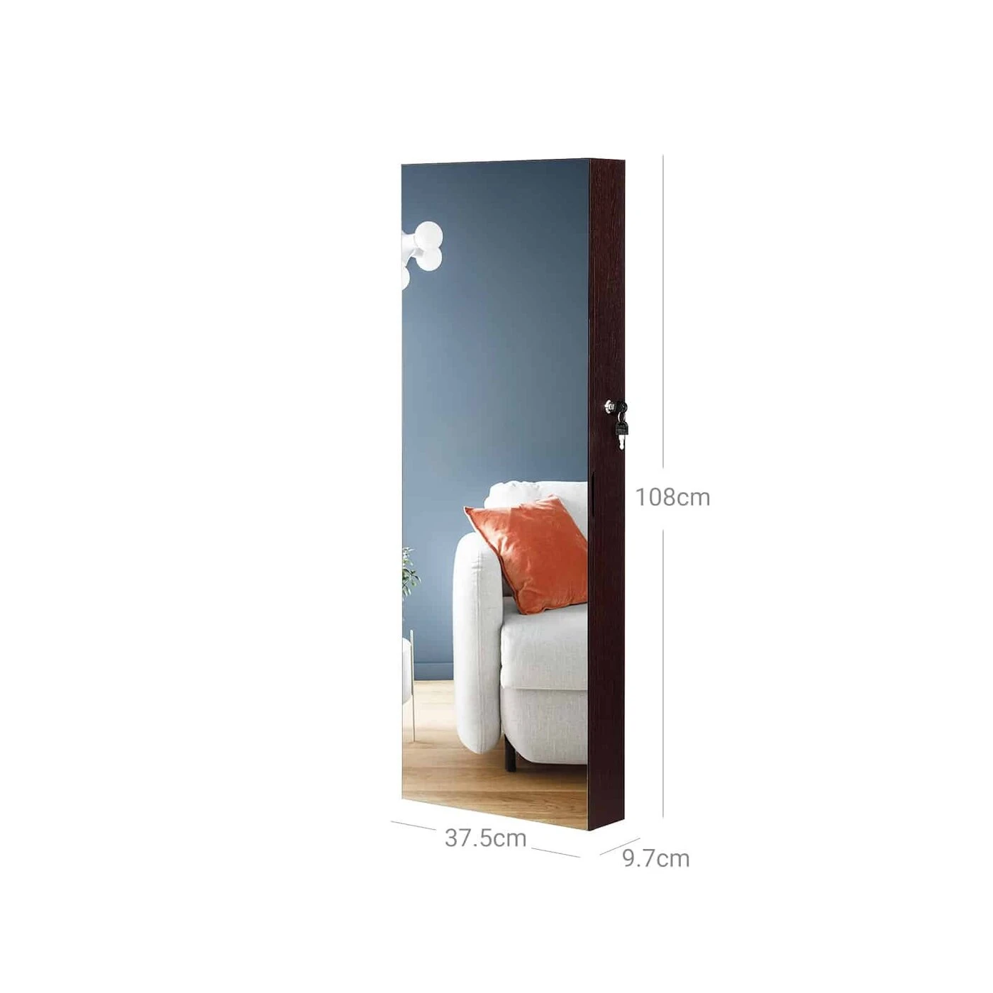 Aprašymas buvo automatiškai išverstas, gali pasitaikyti klaidų.Puikiai suprojektuotas iš namų Jūs jau išsirinkote savo aprangą, bet jai vis dar trūksta kažko? Tiesiog atidarykite šios papuošalų spintelės dureles, kad surastumėte apdailą savo išvaizdai! Auksiniai auskarai ir miela apyrankė su gėlėmis puikiai derėtų prie jūsų suknelės, ar ne? Sustabdyti! Nepamirškite, kad jūsų makiažas taip pat yra šioje papuošalų spintelėje. Taigi papildykite savo išvaizdą tinkamais papuošalais ir makiažu, o tada grožėkitės rezultatu praktiškame viso ūgio veidrodyje! Vieta, kur jūsų papuošalai jaučiasi saugūs Nepalikite papuošalų ir makiažo pūti tamsiuose stalčiuose! Šioje veidrodinėje spintelėje galite laikyti savo lobius kaip vitrinoje ir apsaugoti juos nuo dulkių ir vagių spyna ir dviem raktais. Perlų karoliai, apyrankės, auskarai ir makiažo reikmenys iš karto jausis kaip namuose šioje įmantrioje papuošalų spintelėje!Informacija apie gaminį: - Spalva: ruda - Medžiaga: MDF (vidutinio tankio medienos plaušų plokštė) - Dydis: 37,5 x 9,7 x 108 cm (P x P x A) - Svoris: 9 kg Pristatymo komplektas: - 1 x papuošalų spintelė - 2 x raktai - 1 x priedų paketas - 1 x vadovas (DE,EN,FR,ES,IT)SONGMICS Pastabos:- Saugumo sumetimais vaikams neleidžiama lipti ar žaisti su gaminiu.