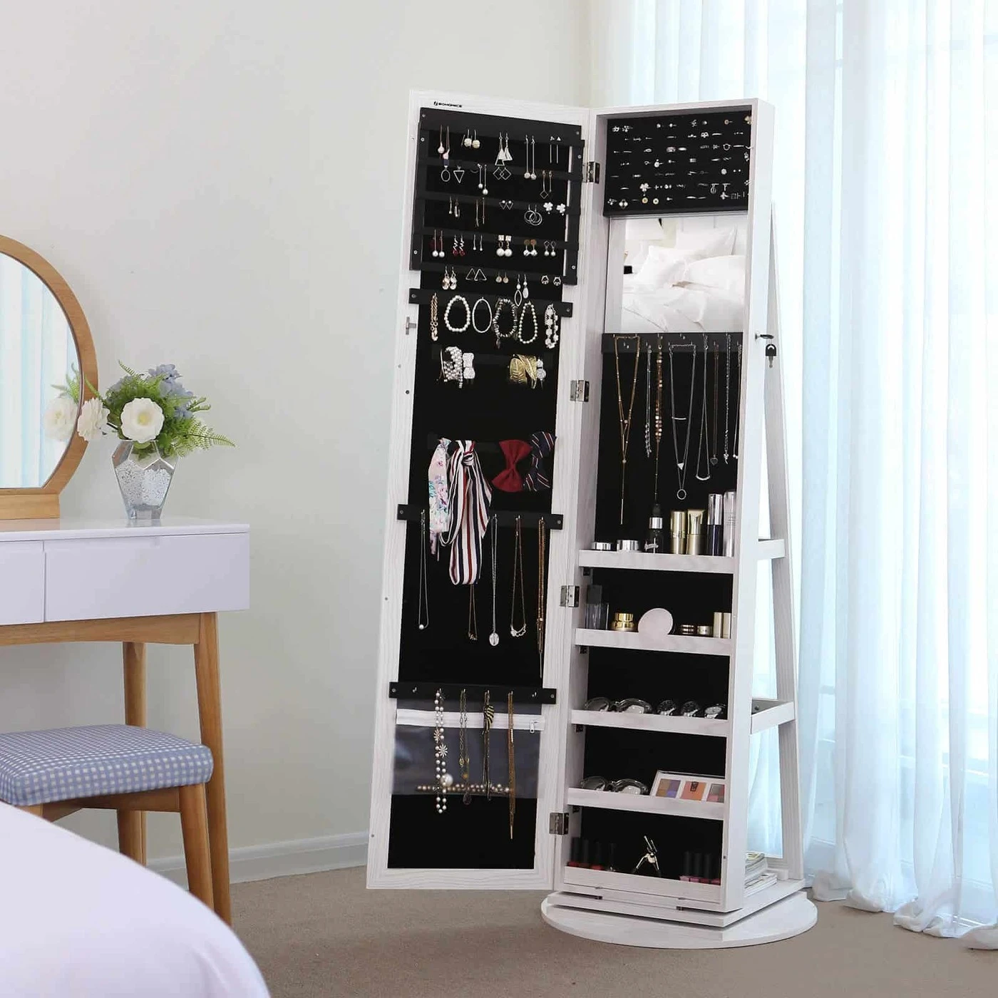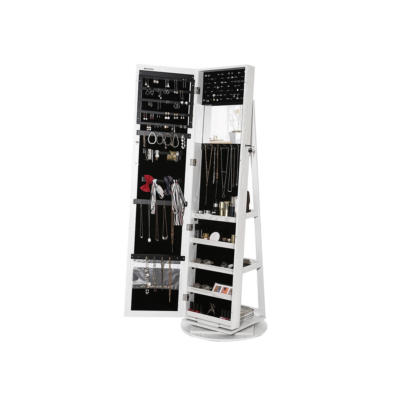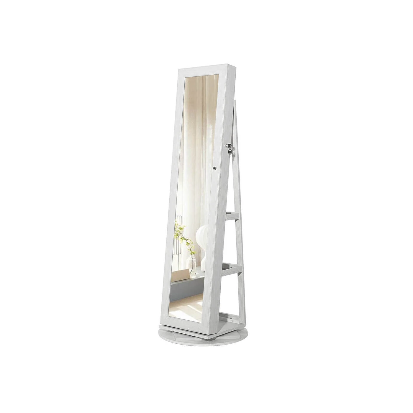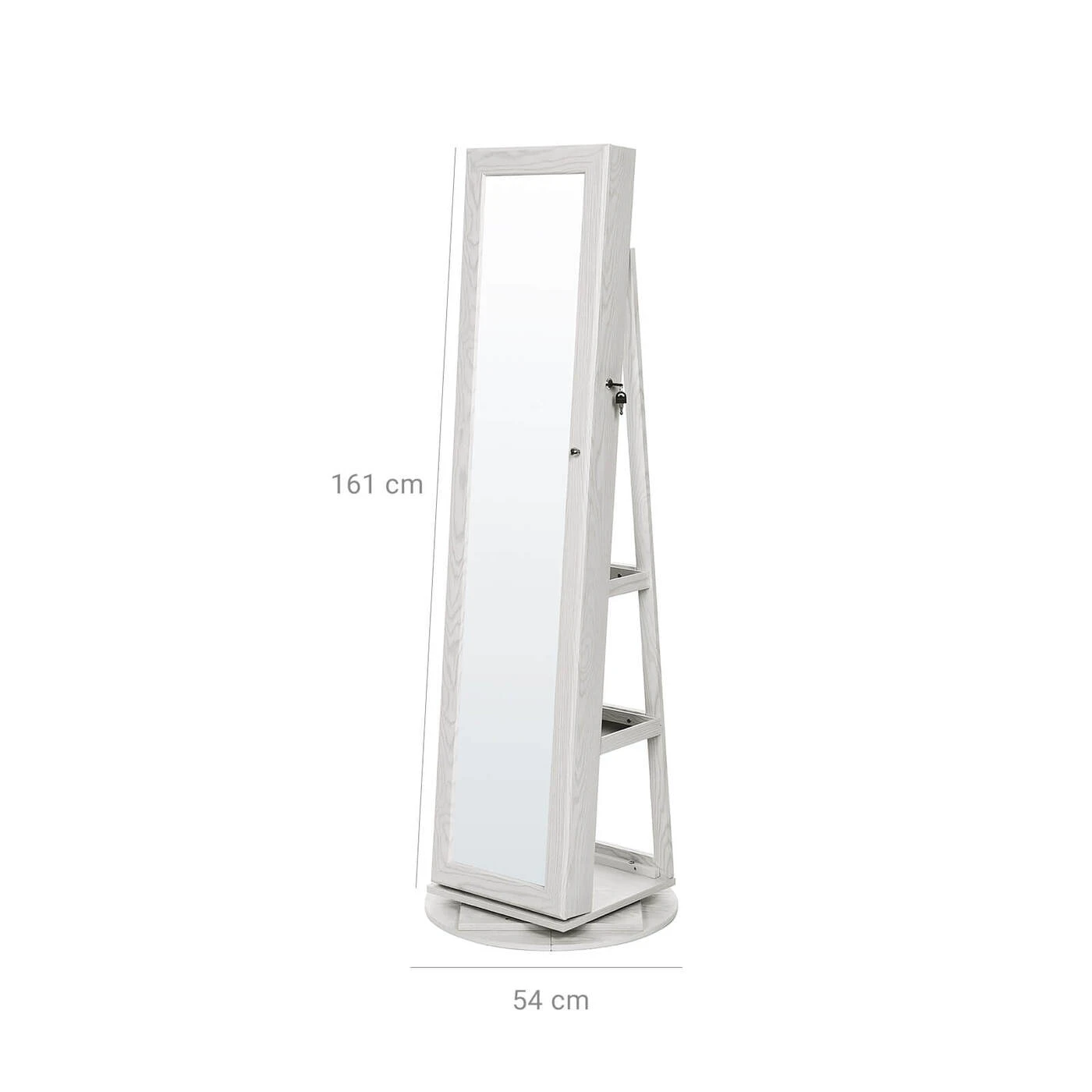 Aprašymas buvo automatiškai išverstas, gali pasitaikyti klaidų.Jei ieškote stovinčio veidrodžio su laikymo galimybėmis, SONGMICS veidrodis ir papuošalų spintelė, kurią galima pasukti 360°, yra geras pasirinkimas. Spintelė suteikia daug erdvės, o gale esanti kopėčių lentyna optimaliai išnaudoja erdvę. Pagaliau viską galima tvarkingai susidėlioti nesipainiojus. Norimą papuošalą galima nesunkiai rasti besipuošiant žvelgiant į veidrodį. Naudodami SONGMICS veidrodį ir papuošalų spintelę galėsite džiaugtis pirkiniu daugelį metų. Pastabos:- Veidrodis trapus, su juo elkitės atsargiai, kad nesulaužtumėte.- Venkite tempti papuošalų spintelės į spintelės priekį, kad apsisaugotumėte nuo apvirtimo.Išsami informacija apie gaminį: Grynasis svoris: 19,56 kgMedžiaga: MDF plokštėMatmenys: 54 x 161 x 54 cm (PxAxG) Mažos kvadratinės lentynos matmenys: 34 x 3 x 13 cm (PxAxG)Didelės kvadratinės lentynos matmenys: 35 ,5 x 3 x 19. x A x A) Išorinio veidrodžio matmenys: 26 x 144 cm (P x A) Vidinio veidrodžio išmatavimai: 34,5 x 23 cm (P x A) Pristatymo komplektas: - 1 x papuošalų spintelė - 1 x besisukantis rėmas - 1 x tinkantis krepšys - 2 x raktai - 1 x rankinis (DE, EN, FR, IT, ES)