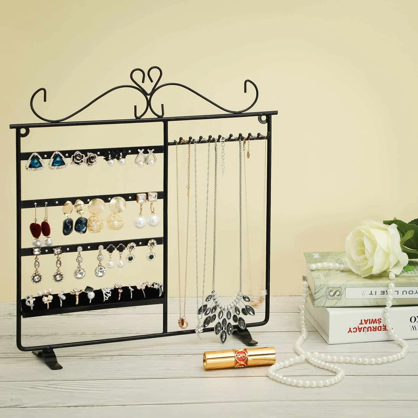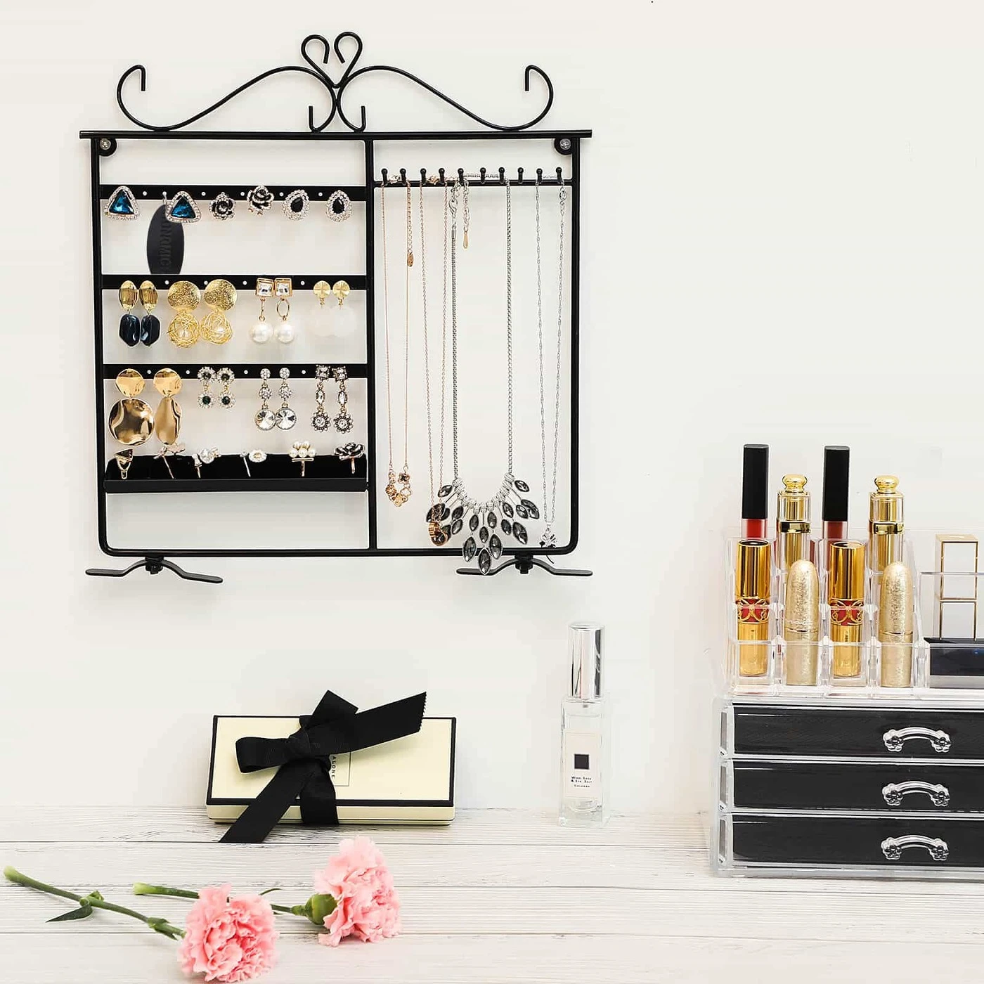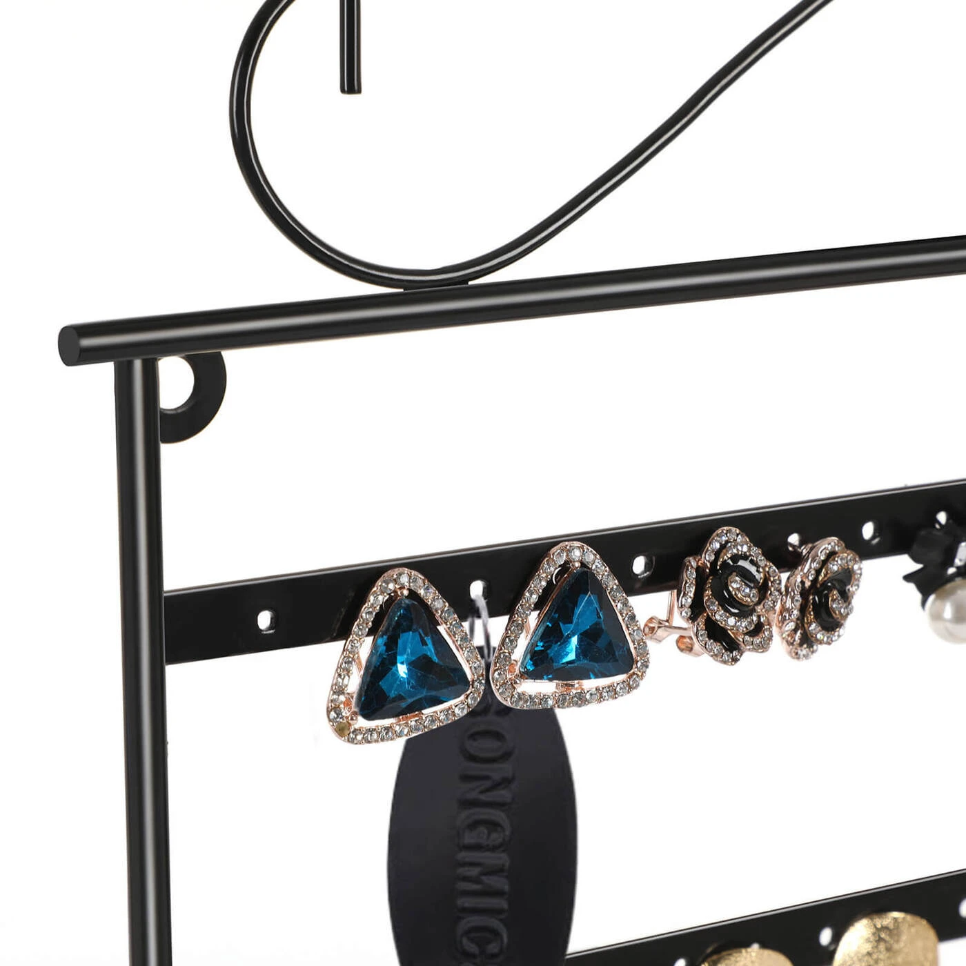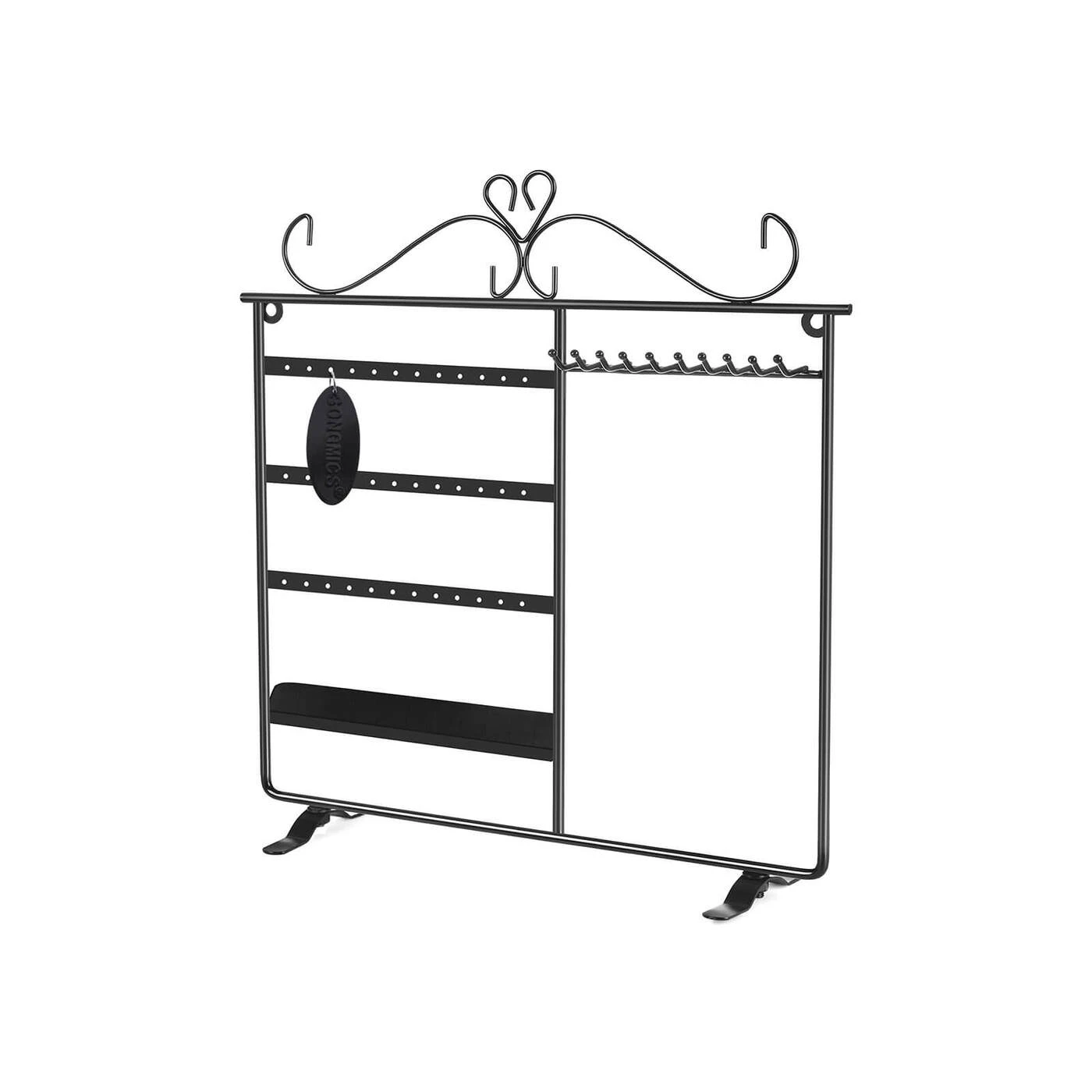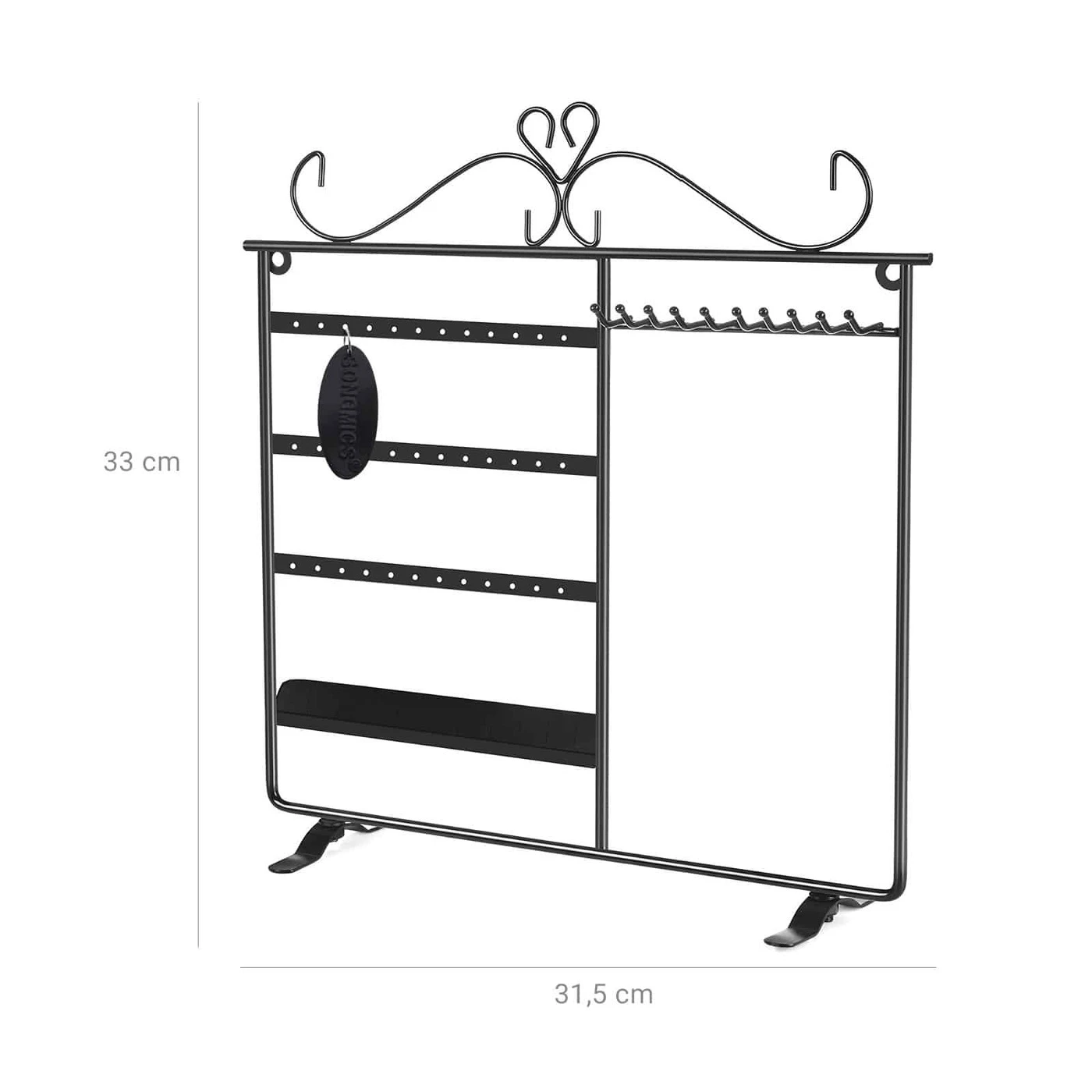 Aprašymas buvo automatiškai išverstas, gali pasitaikyti klaidų.Visur guli auskarai ir karoliai? O ar visada nerandi tinkamų, kai prireikia? Songmics juvelyrikos stendas siūlo jums idealų sprendimą tokioms problemoms spręsti. Jis pagamintas iš tvirtos geležies ir turi milteliniu būdu padengtą paviršių, kuris yra lygus ir patvarus, apsaugantis po juo esantį metalą. Ant jos galite pakabinti iki 18 porų auskarų ir 10 karolių. Jūsų žiedai taip pat ras savo vietą ant daugelio prijungiamų paviršių. Taip pat galite pastatyti bet kur ant stalo arba pakabinti ant sienos. Su Songmics papuošalų stovu jūsų papuošalai atrodys dailiai ir tvarkingai, juos galima naudoti net kaip dekoraciją.Išsami informacija apie gaminį: - Medžiaga: geležis - Spalva: juoda - Matmenys: 31,5 x 33 cm (P x A) - Pagrindo matmenys: 11 x 1,8 cm - Atstumas tarp 2 skylių eilių: 5,5 cm - Horizontalus atstumas tarp dviejų skylių / kabliukas : 1 cm - atstumas tarp kabliuko ir apatinio rėmo krašto: 24,5 cm - kabliuko ilgis: 3 cm Pristatymo komplektas: - 1x papuošalų dėklas
