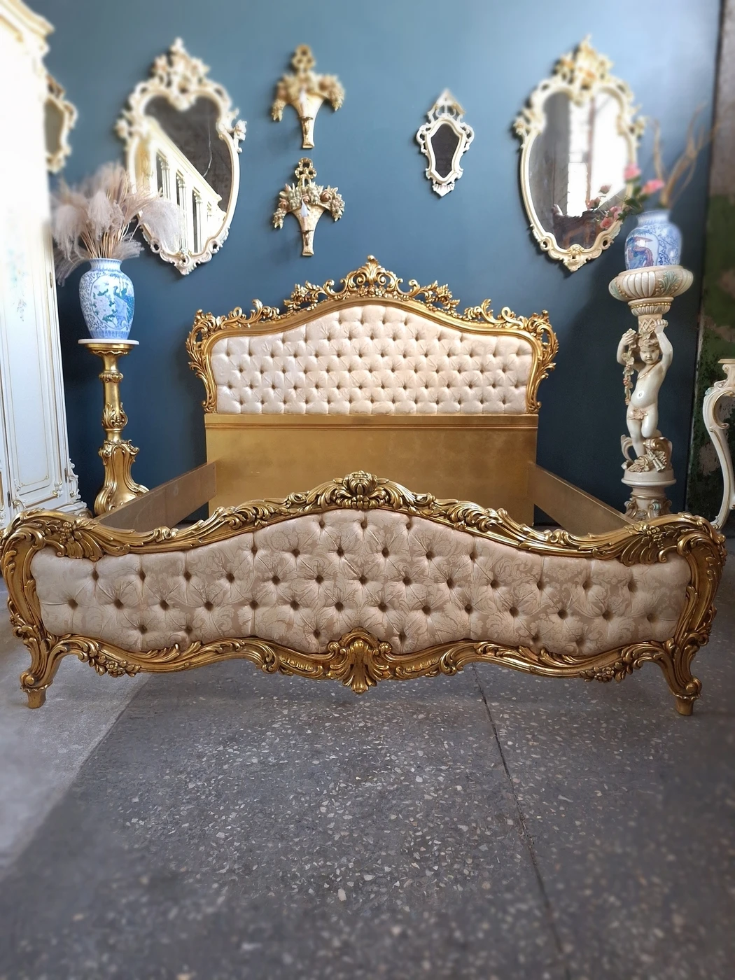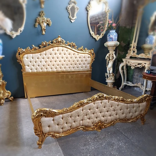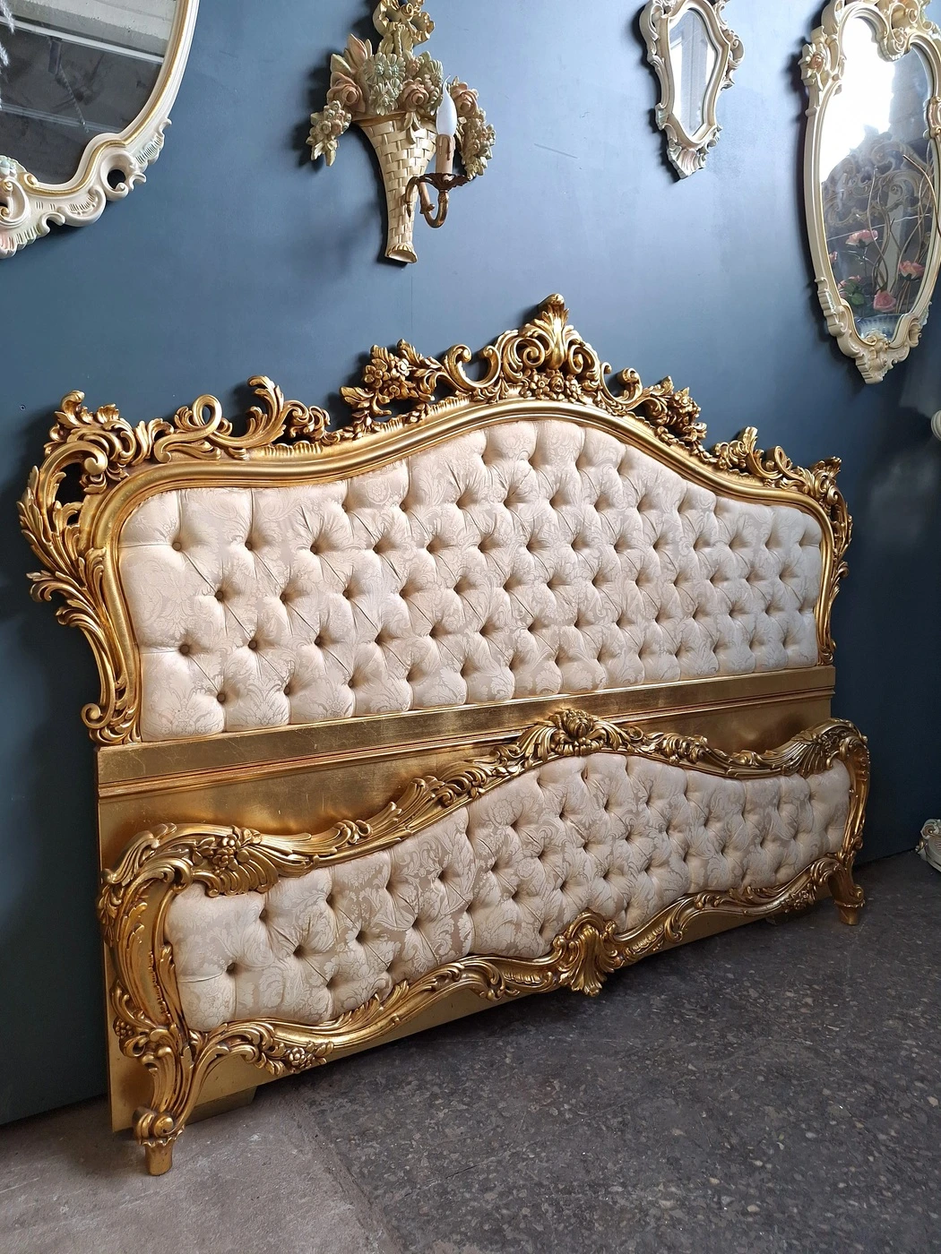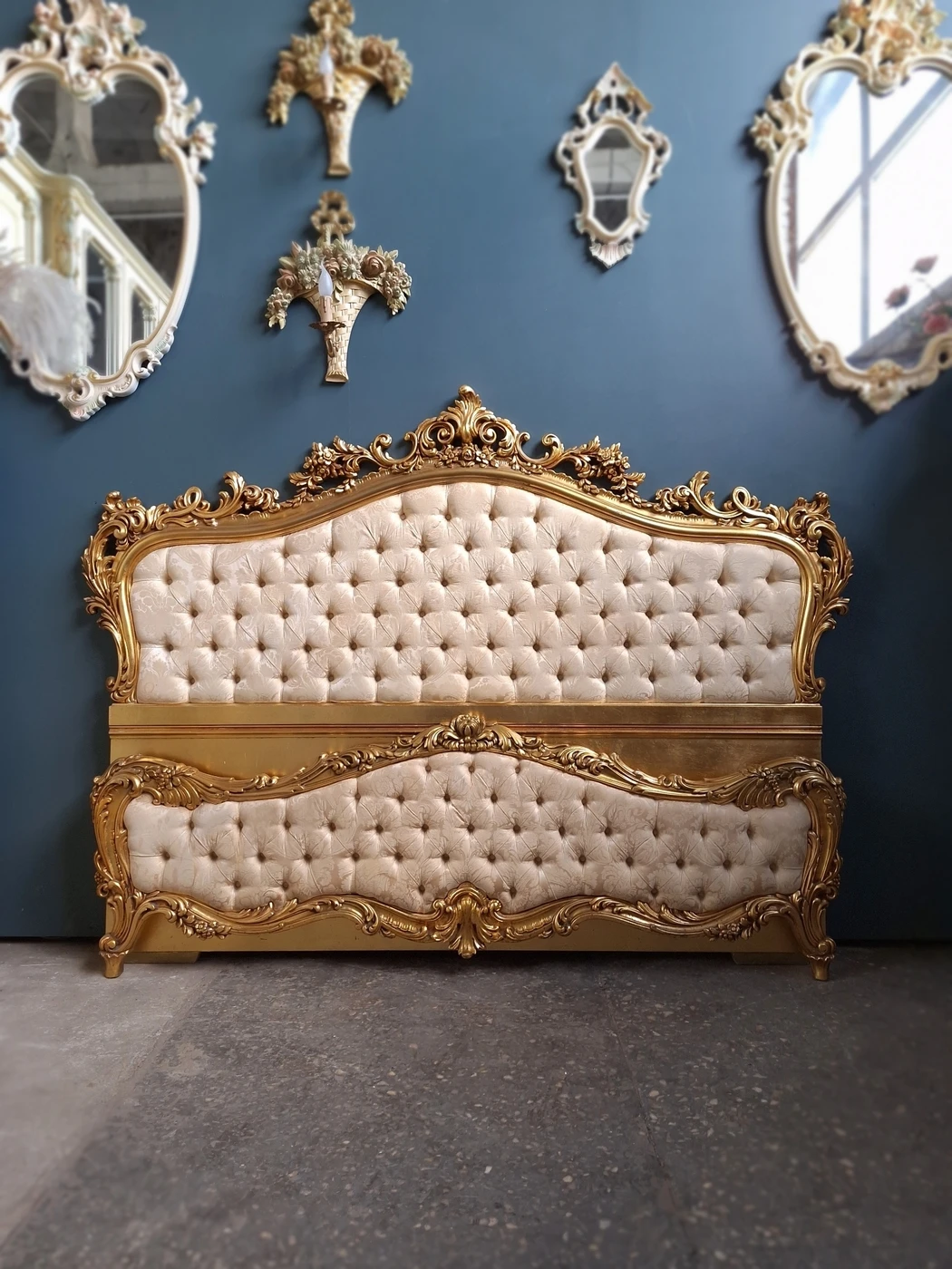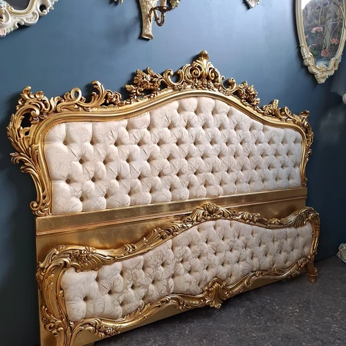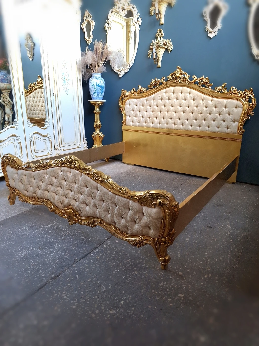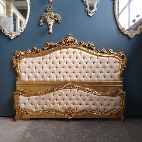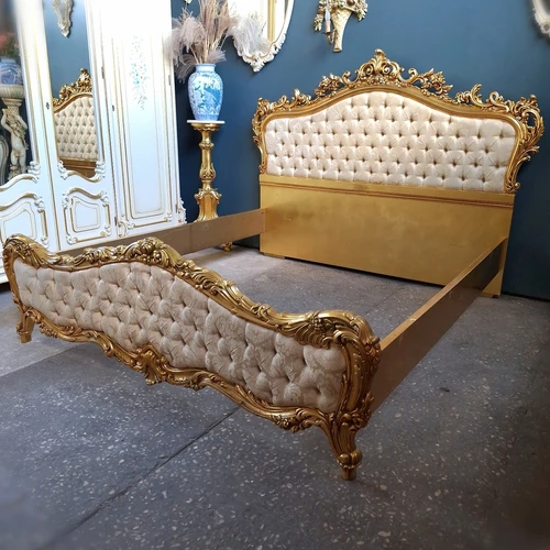 Įsigykite prabangos ir elegancijos šedevrą - aukso spalvos baroko stiliaus lovą, kuri suteiks jūsų miegamajam išskirtinio žavesio ir didybės. Ši lova, puikiai deranti klasikinio ir prabangaus interjero gerbėjams, yra tikras meno kūrinys, atspindintis karališką rafinuotumą ir stilių