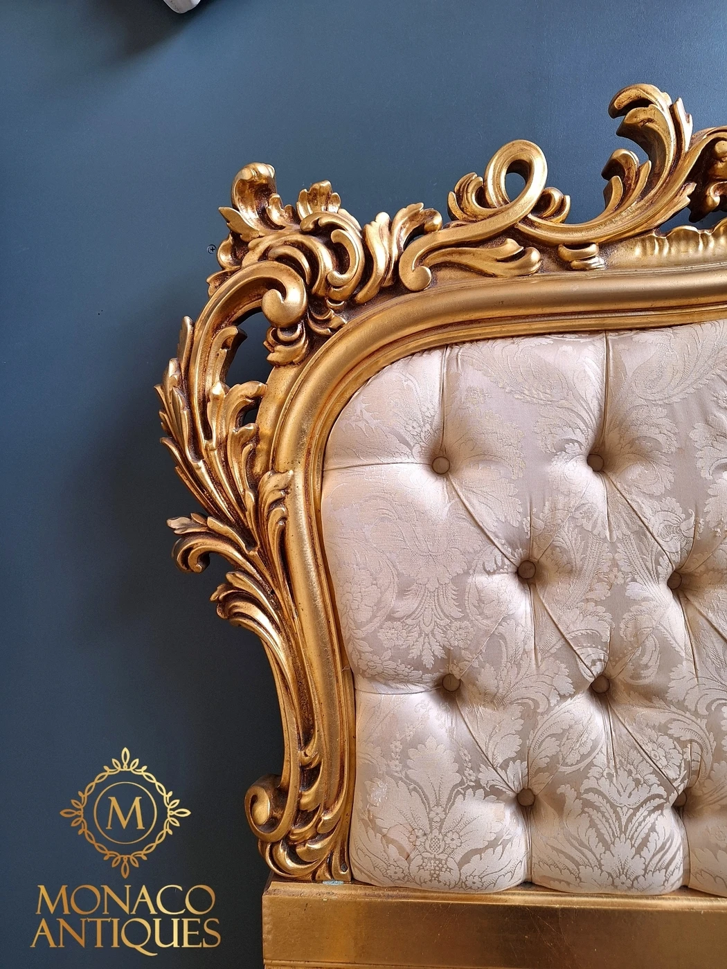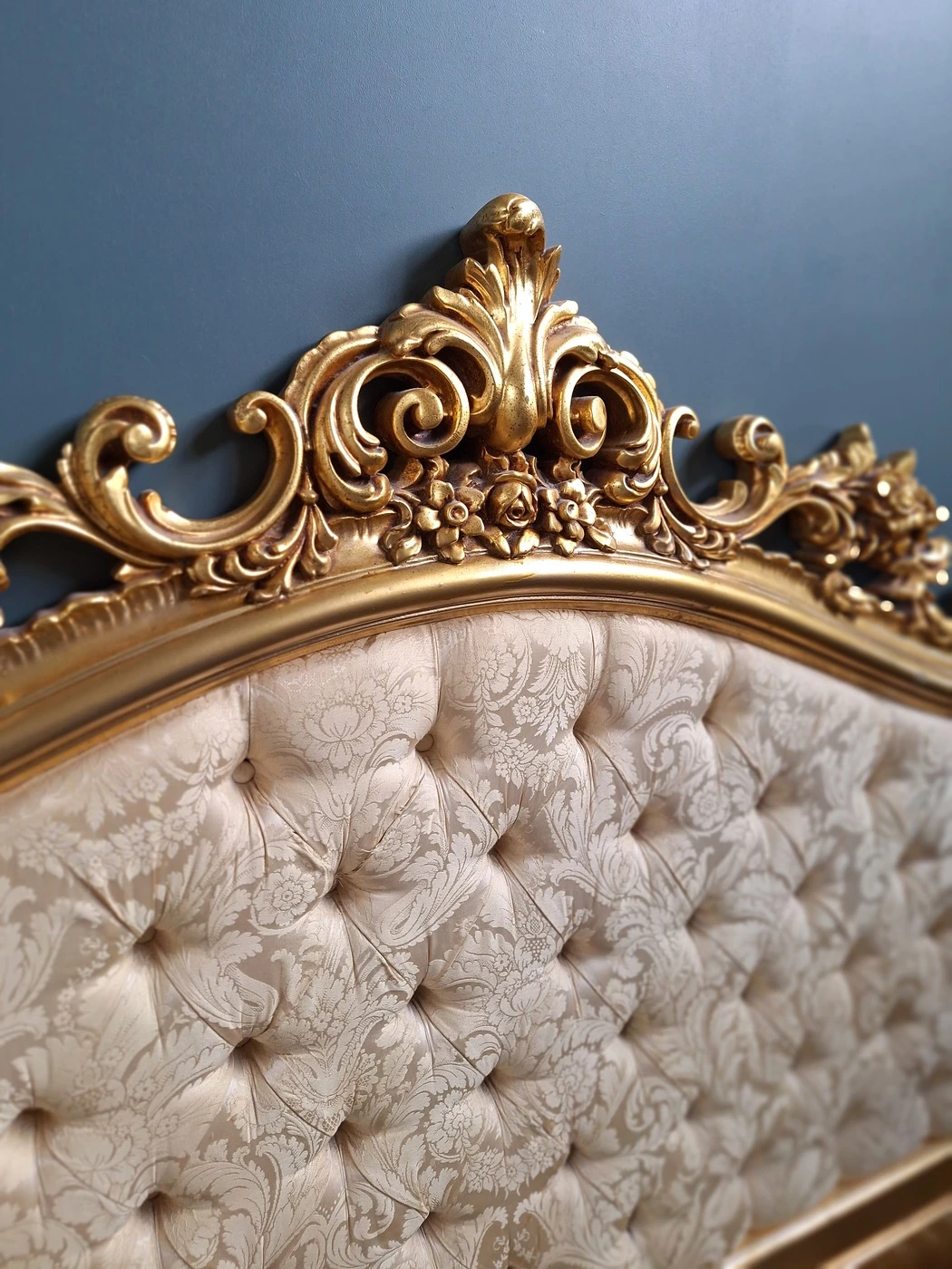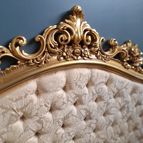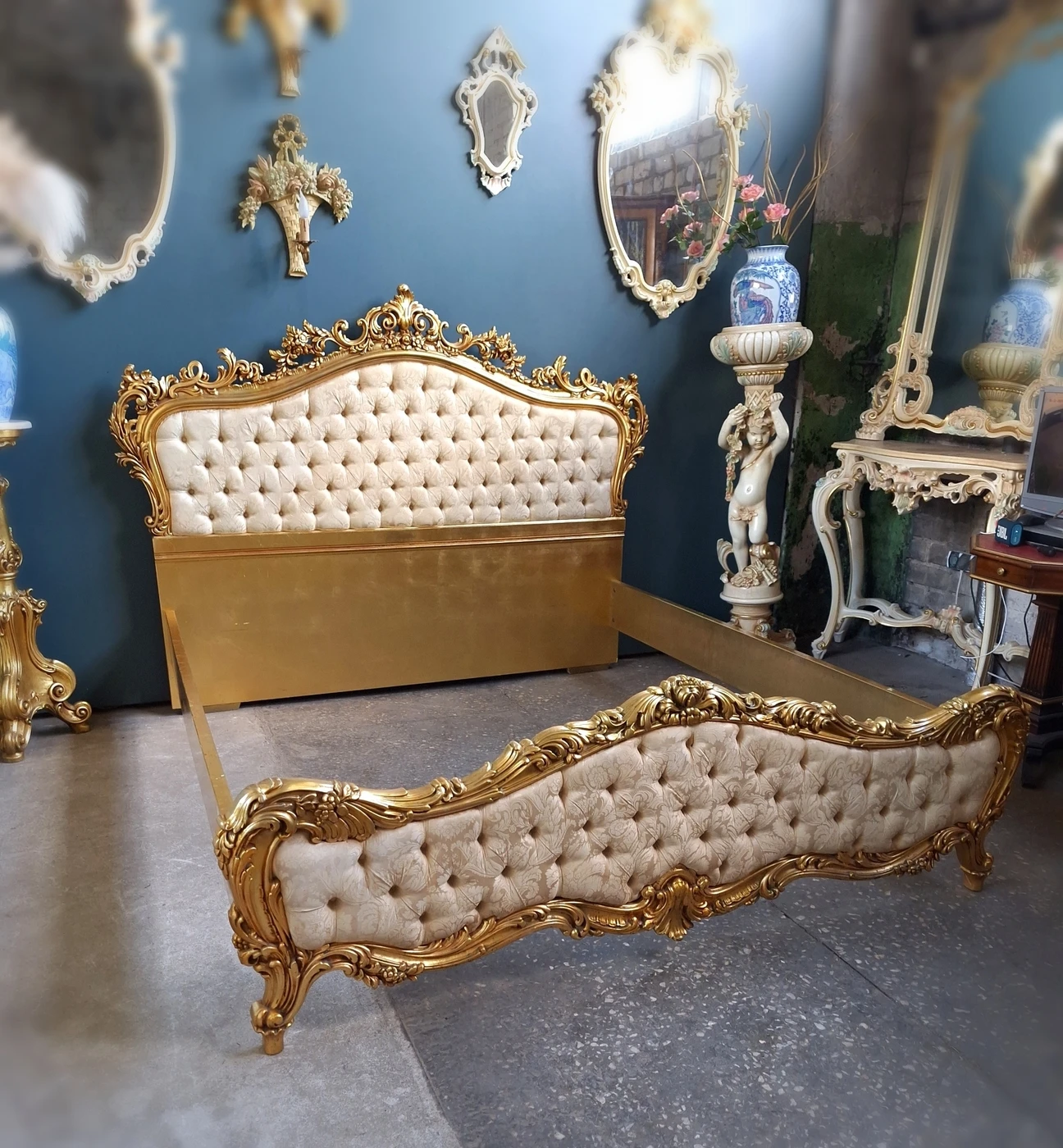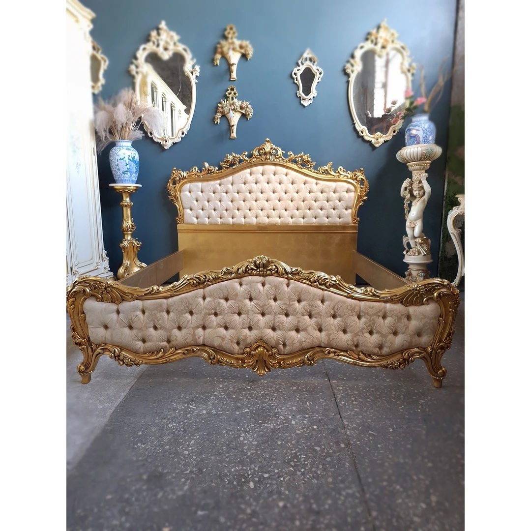 Įsigykite prabangos ir elegancijos šedevrą - aukso spalvos baroko stiliaus lovą, kuri suteiks jūsų miegamajam išskirtinio žavesio ir didybės. Ši lova, puikiai deranti klasikinio ir prabangaus interjero gerbėjams, yra tikras meno kūrinys, atspindintis karališką rafinuotumą ir stilių