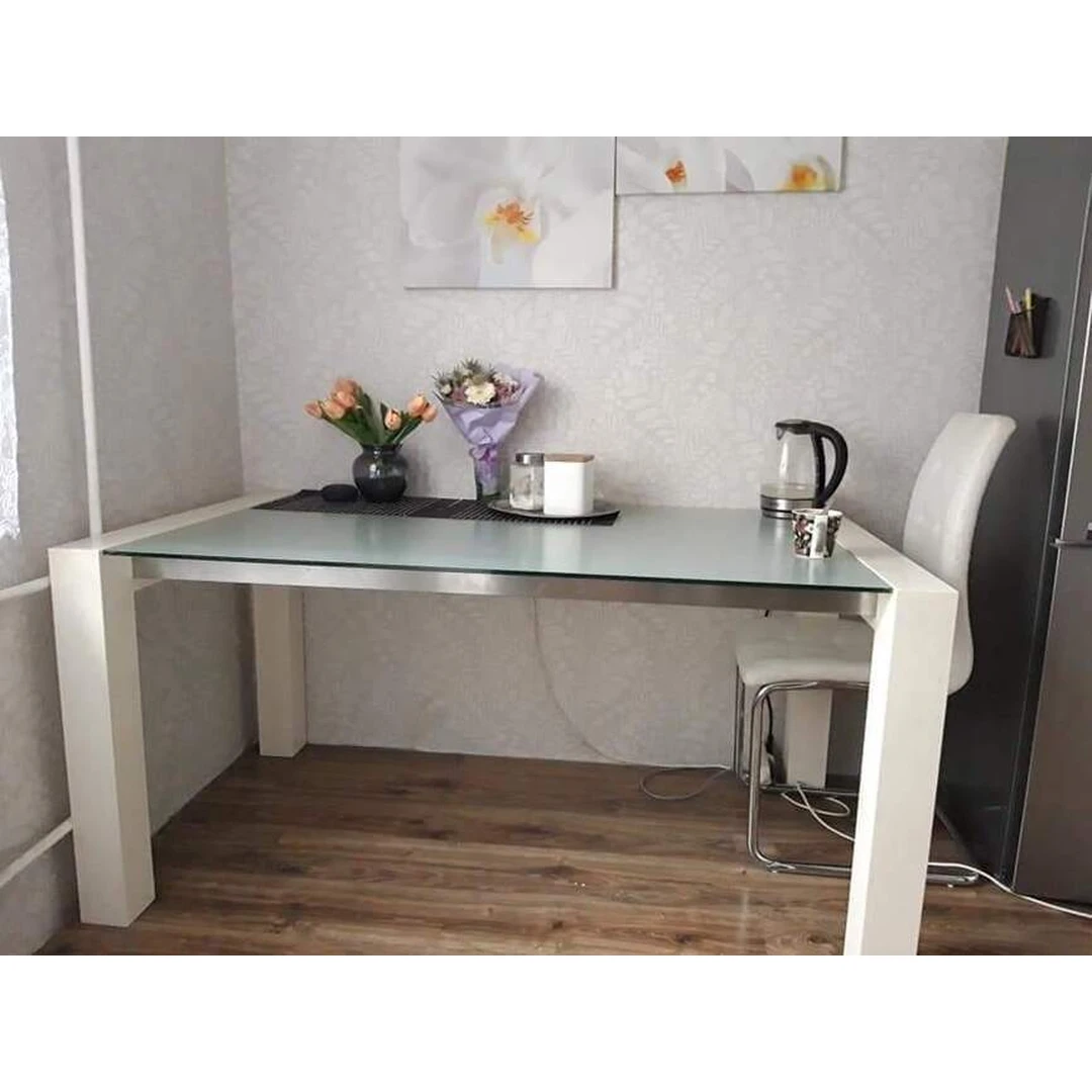 Virtuvinis stalas su marmuro kojomis ir stiklo viršūne