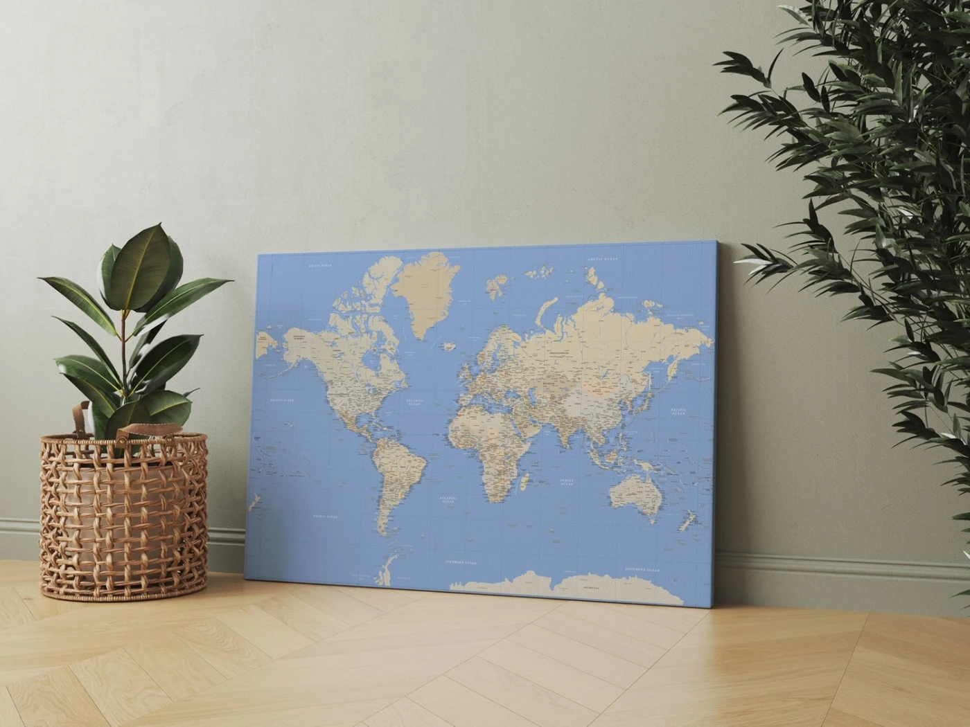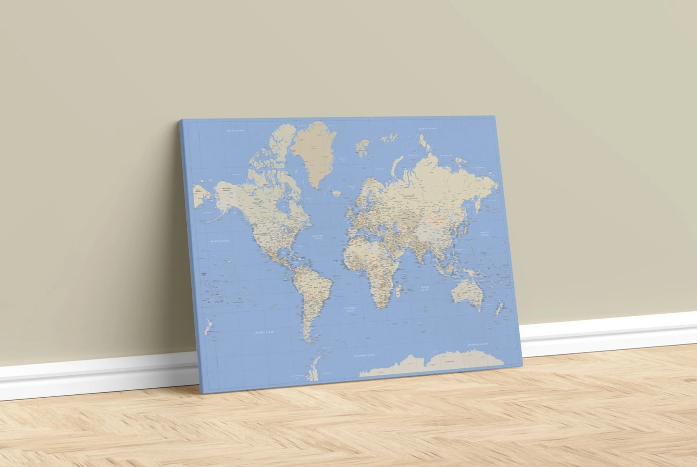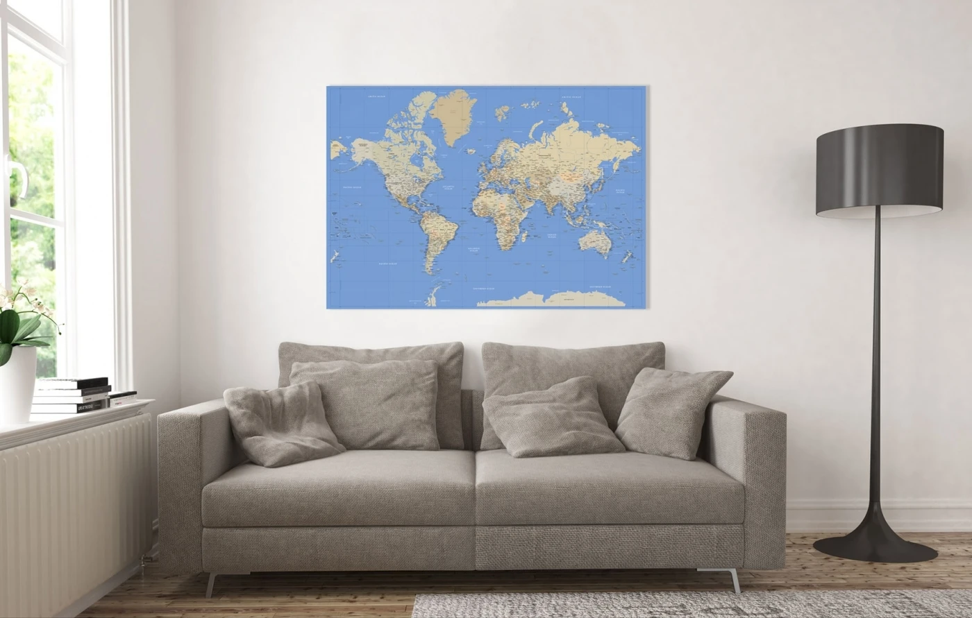 XL 150×100 cm – 199 €, L 120×80 cm – 159 €, M 100×700 cm – 119 €. MEDŽIAGOS Žemėlapis išliks ryškus ir puikios išvaizdos daugybę metų, nes jam pagaminti naudojamos aukščiausios kokybės medžiagos. Išspausdintas vaizdas yra padengiamas vandens pagrindo rūgščių neturinčiu apsauginiu laku, kuris atitinka muziejuose saugomų eksponatų reikalavimus - iki 80-100 metų spalvos išlieka nepakitusios. Kiekvienas žemėlapis yra kruopščiai pagamintas Lietuvoje profesionalių MyPoint meistrų. Smulkios tekstūros ir tvirta 310g/m² drobė Coala,Aukštos raiškos Mutoh spausdintuvas, užtikrinantis aiškų skaitomumą (Japonija),Originalūs ir ilgaamžiai dažai, suteikiantys ryškias spalvas (Japonija),Nuo blukimo ir neigiamo aplinkos poveikio apsaugantis matinis spaudos lakas (Jungtinė Karalystė);Tvirtas natūralaus medžio porėmis užpildytas su putų plokšte – lengvai konstrukcijai ir patogiam smeigtukų naudojimui (Lietuva).