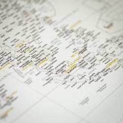 XL 150×100 cm – 199 €, L 120×80 cm – 159 €, M 100×700 cm – 119 €. MEDŽIAGOS Žemėlapis išliks ryškus ir puikios išvaizdos daugybę metų, nes jam pagaminti naudojamos aukščiausios kokybės medžiagos. Išspausdintas vaizdas yra padengiamas vandens pagrindo rūgščių neturinčiu apsauginiu laku, kuris atitinka muziejuose saugomų eksponatų reikalavimus - iki 80-100 metų spalvos išlieka nepakitusios. Kiekvienas žemėlapis yra kruopščiai pagamintas Lietuvoje profesionalių MyPoint meistrų. Smulkios tekstūros ir tvirta 310g/m² drobė Coala,Aukštos raiškos Mutoh spausdintuvas, užtikrinantis aiškų skaitomumą (Japonija),Originalūs ir ilgaamžiai dažai, suteikiantys ryškias spalvas (Japonija),Nuo blukimo ir neigiamo aplinkos poveikio apsaugantis matinis spaudos lakas (Jungtinė Karalystė);Tvirtas natūralaus medžio porėmis užpildytas su putų plokšte – lengvai konstrukcijai ir patogiam smeigtukų naudojimui (Lietuva).