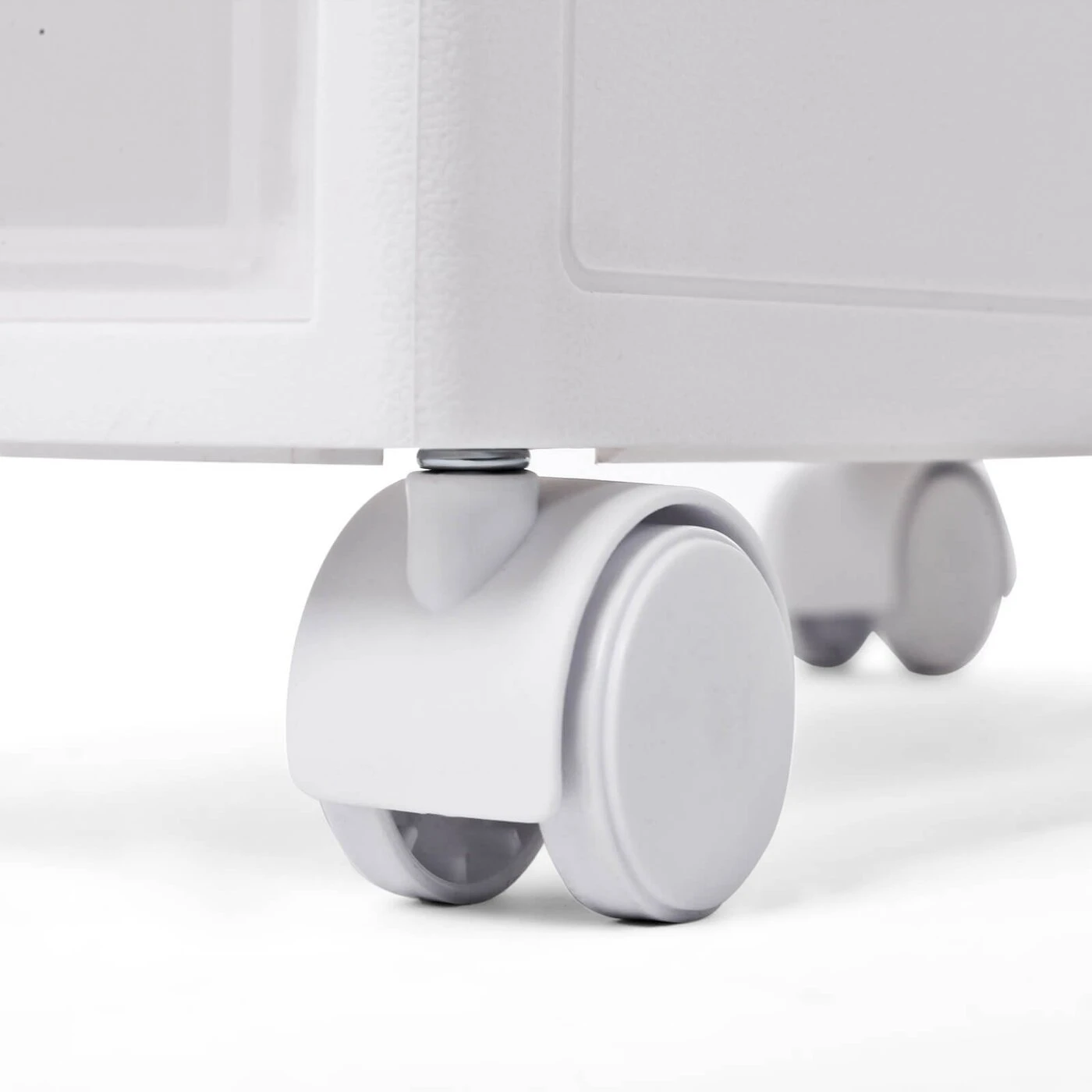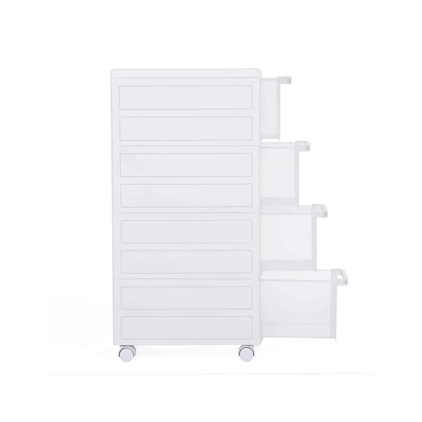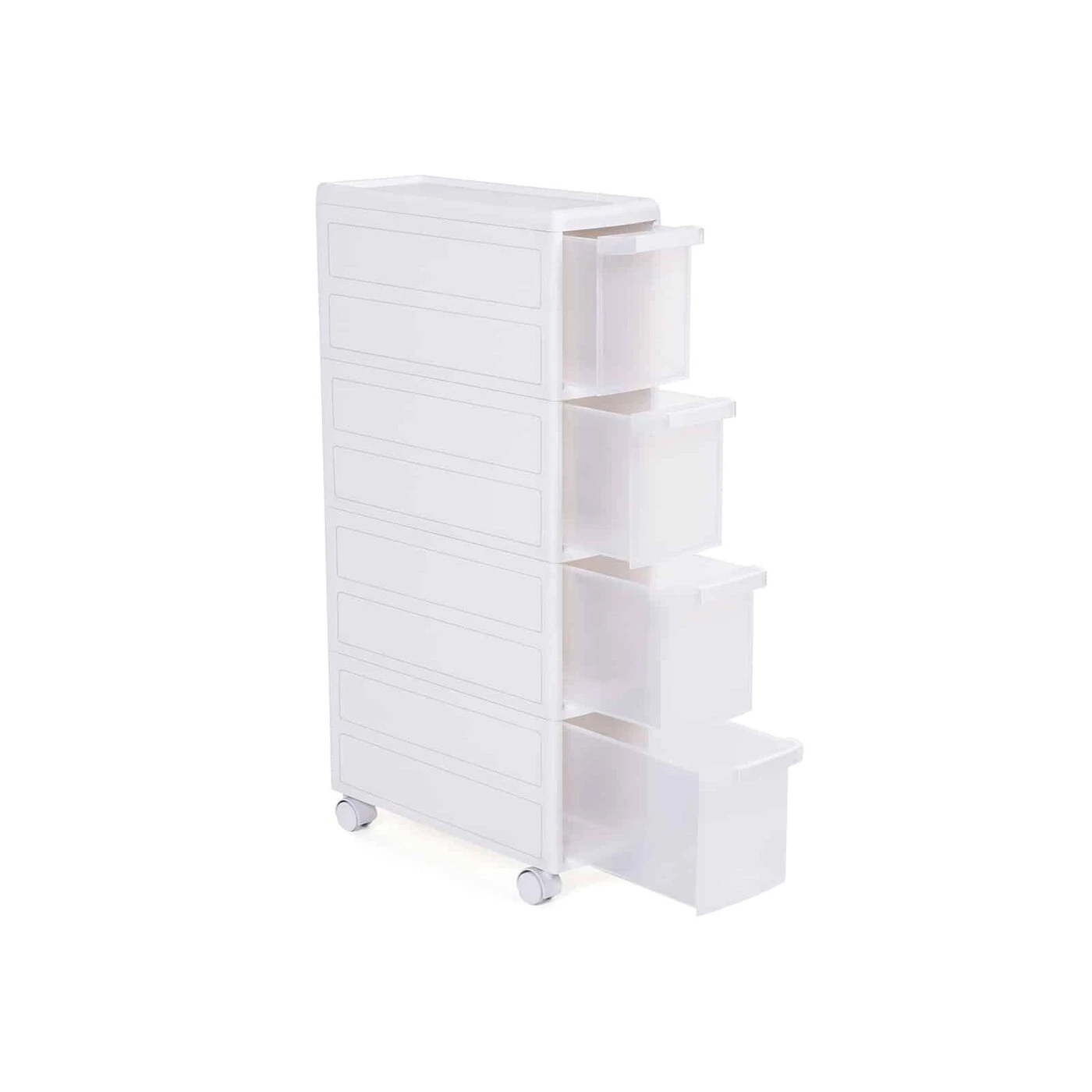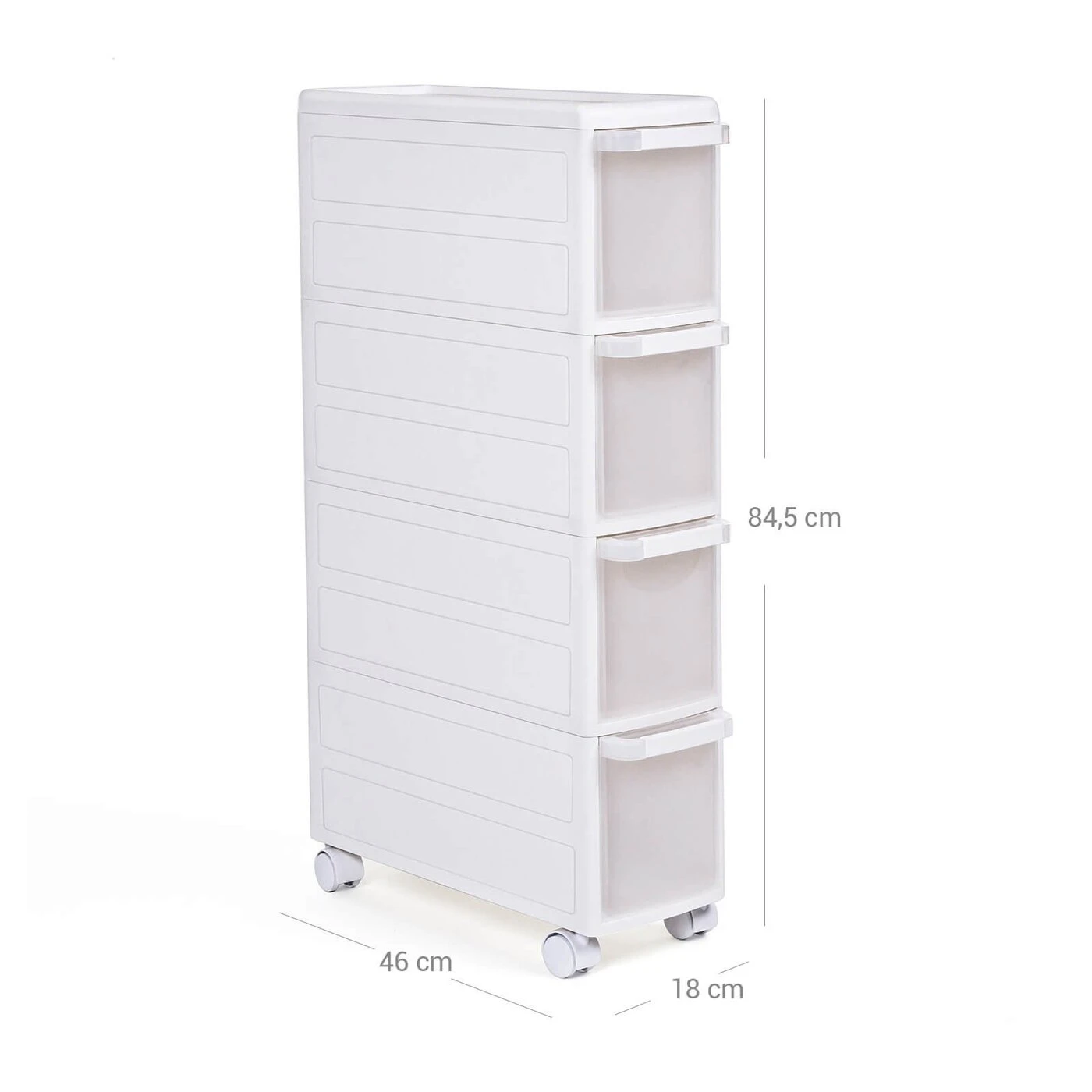 Aprašymas buvo automatiškai išverstas, gali pasitaikyti klaidų.Lengvai prižiūrima baltos spalvos nišinė lentyna iš PP plastiko su 4 stalčiais yra labai praktiškas problemų sprendimas siaurose ir kompaktiškose virtuvėse ar vonios kambariuose! Dėl peršviečiamų stalčių nesunkiai matosi kas yra viduje, o jei į vidų išsilietų prieskoniai ar kiti skysčiai, jie neišsiteps/neištekės ant grindų ar apatinių skyrių, dėmes lengvai ir greitai nuplausite vandeniu. Pridedamas papildomas dangtelis, todėl lentyną galite atskirti į 2 dalis ir jas naudoti atskirai. Stalčių skaičius taip pat gali būti derinamas pagal pageidavimą.Išsami informacija apie gaminį: - Matmenys: 18 x 84,5 x 46 cm (P x A x A) - Pakuotės matmenys: 52 x 46 x 46,5 cm - Medžiaga: PP plastikas - Spalva: balta - Maksimali kiekvienos pakopos apkrova: 2,5 kg - Grynasis svoris: 4,9 kg Pakuotės turinys: - 1 x nišinė lentyna - 2 x dangteliai - 4 x ratukai Pastabos - Siekiant geresnio stabilumo, patartina gaminį įdėti į nišą. - Nelaikykite per sunkių daiktų stalčiuose, kad netikėtai nenukristų ištraukus.