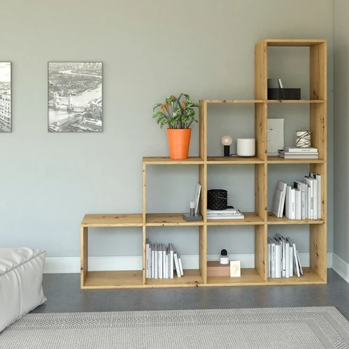 laiptuota lentyna lengvai ras vietą jūsų biure ar namuose. Ši lentyna tiks tiek mažoms, tiek erdvioms patalpoms;abi pusės su apdaila, todėl prie sienos galima statyti taip, kaip norite;puikiai tinka gražiam kanceliarinių prekių, namų apyvokos daiktų, kitų smulkių dizaino elementų ar knygų laikymui;pagaminta iš laminuotos medžio drožlių plokštės (MDP), briaunos dailintos PVC danga;spalva - ruda (artisan oak);išmatavimai: aukštis - 153 cm, ilgis - 153 cm, gylis - 30 cm;10 lentynų pakopų; pakopos matmenys: ilgis - 36 cm, plotis - 36 cm;