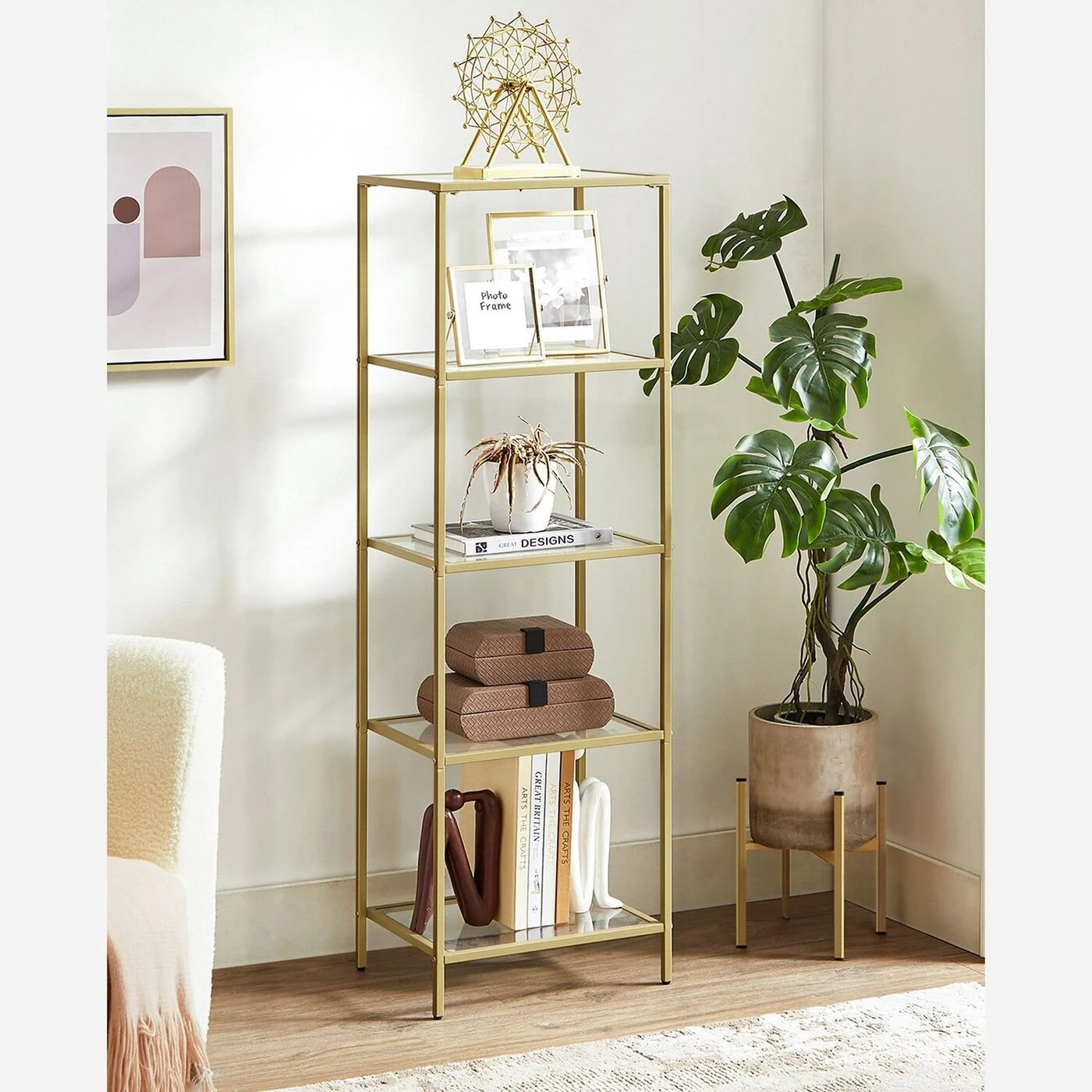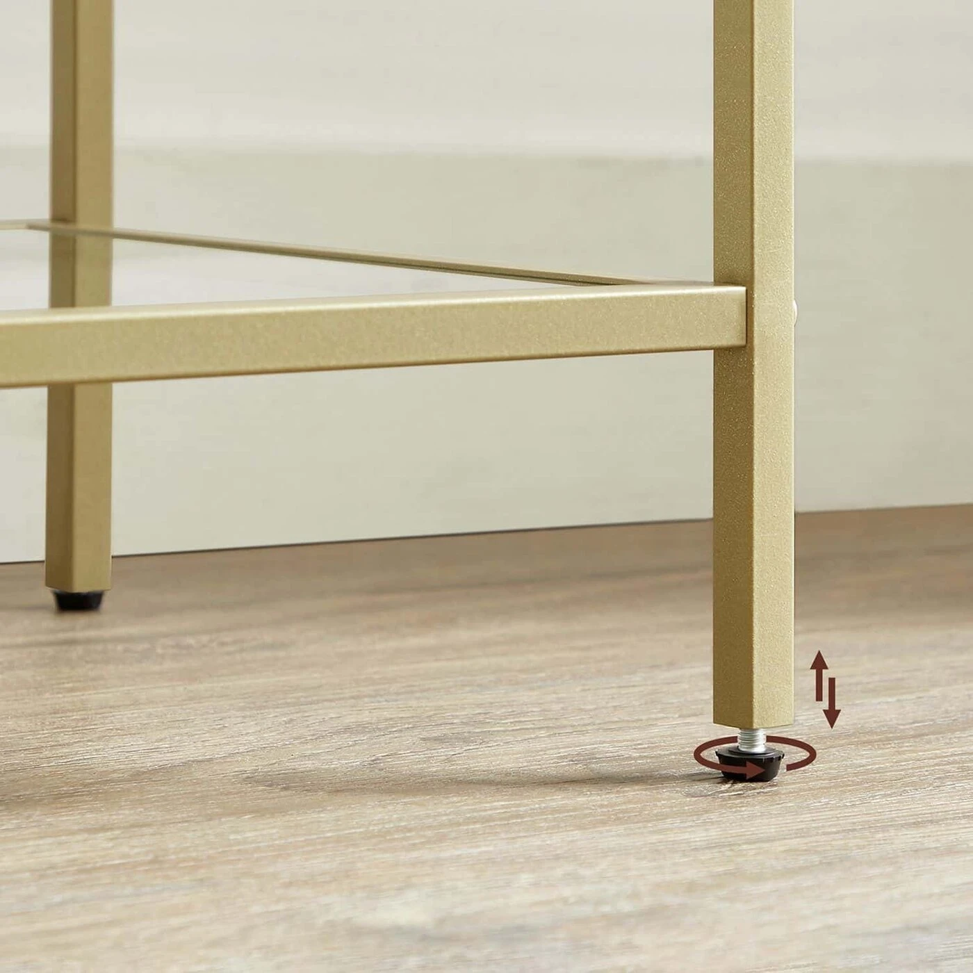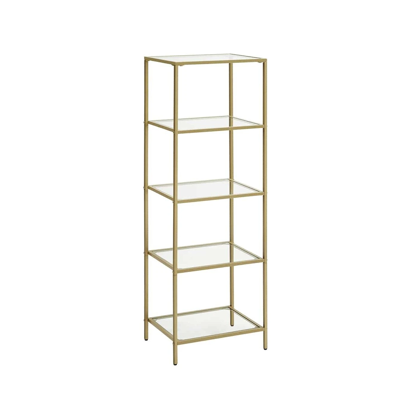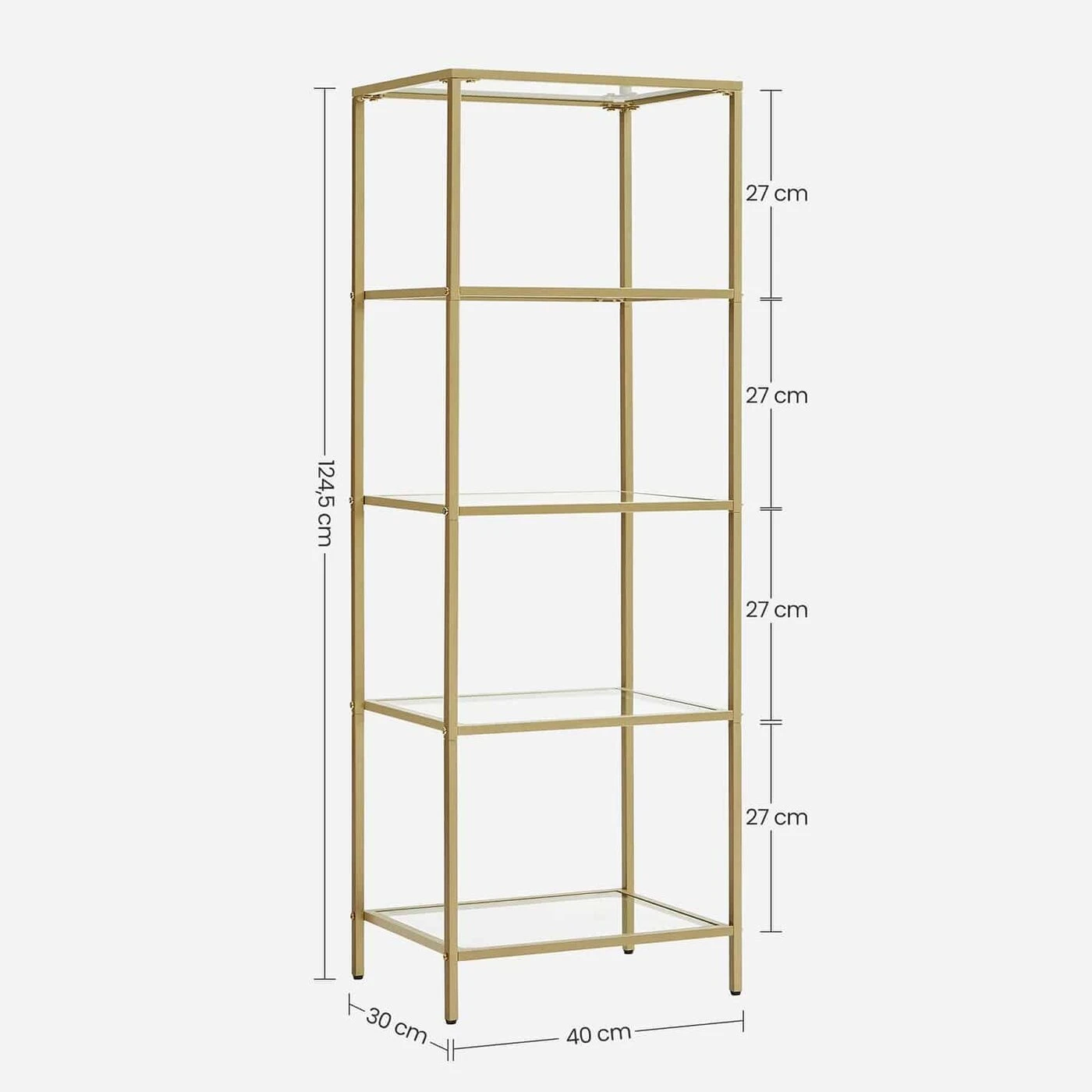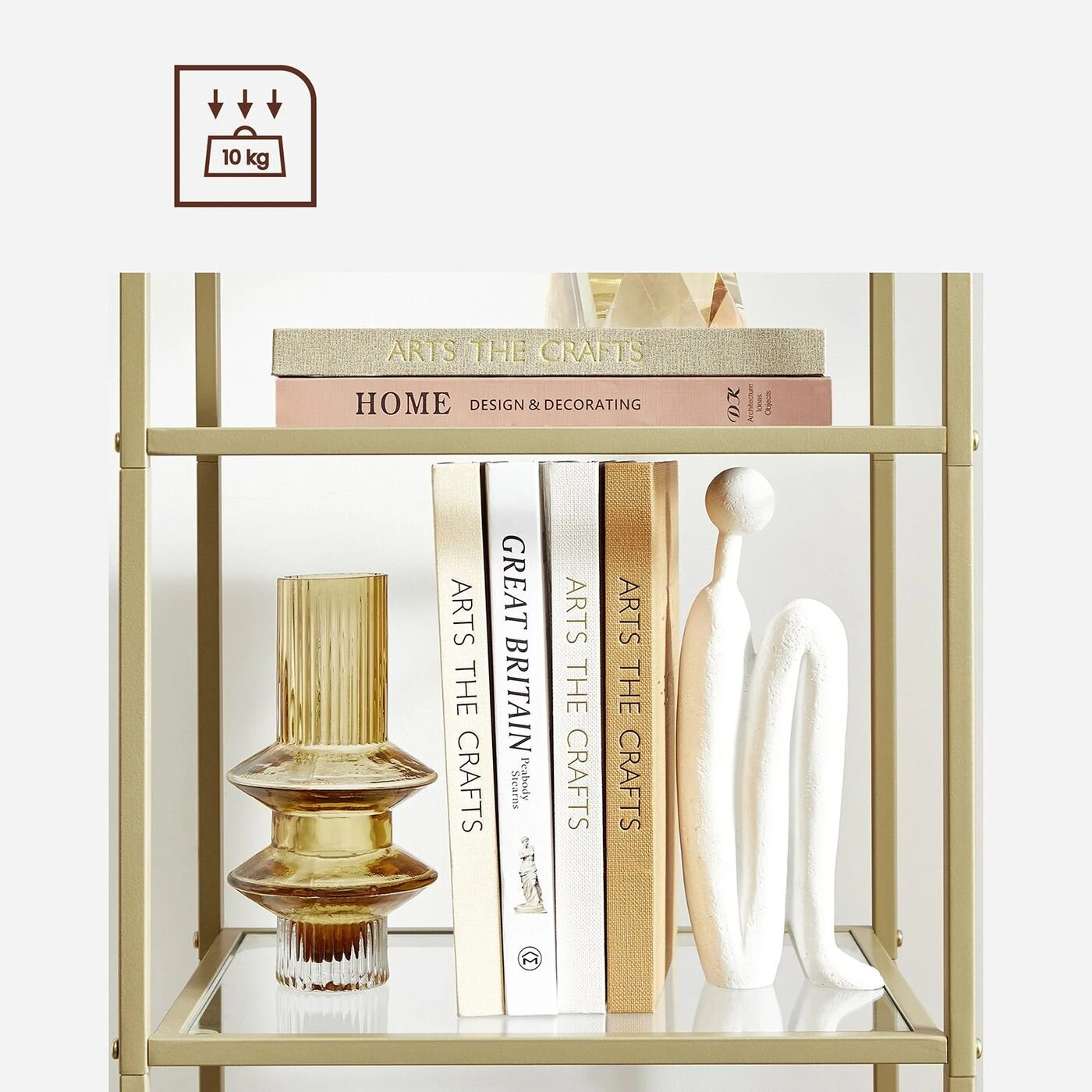 Aprašymas buvo automatiškai išverstas, gali pasitaikyti klaidų.Informacija apie gaminį: - Spalva: Auksinė - Medžiaga: Plienas, grūdintas stiklas - Dydis: 40 x 30 x 124,5 cm (P x P x A) - Svoris: 8,2 kg - Maksimali lentynos statinė apkrova: 10 kg Pakuotės turinys: - 1 x stovima lentyna - 1 x priedų paketas - 2 x apsaugantys nuo apvirtimo - 1 x instrukcijosVASAGLE Pastabos: - Saugumo sumetimais vaikams draudžiama lipti ant gaminio ar žaisti su juo. - Didžiausia vienos lentynos statinė apkrova yra 10 kg. Neviršykite šio maksimalaus svorio. – Pritvirtinkite šį gaminį prie sienos su komplekte esančiu neapvirtimu, kad užtikrintumėte saugų naudojimą.