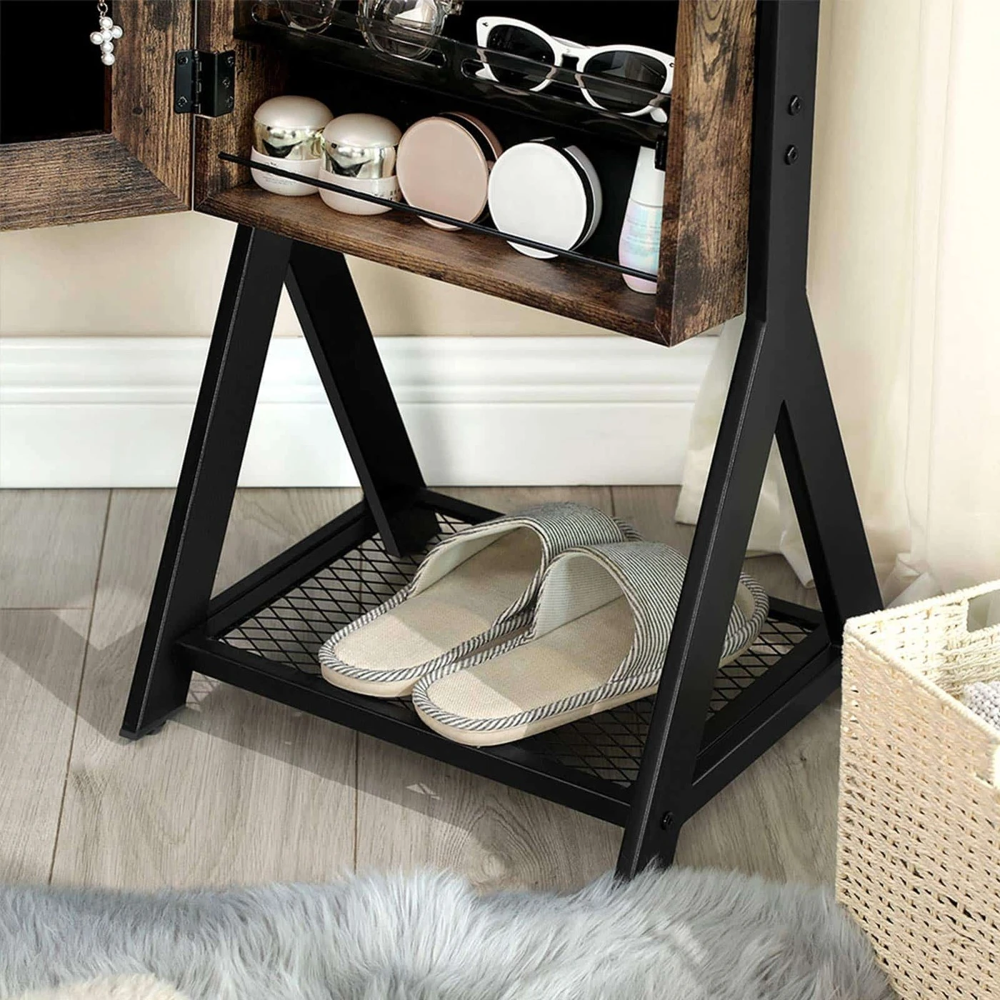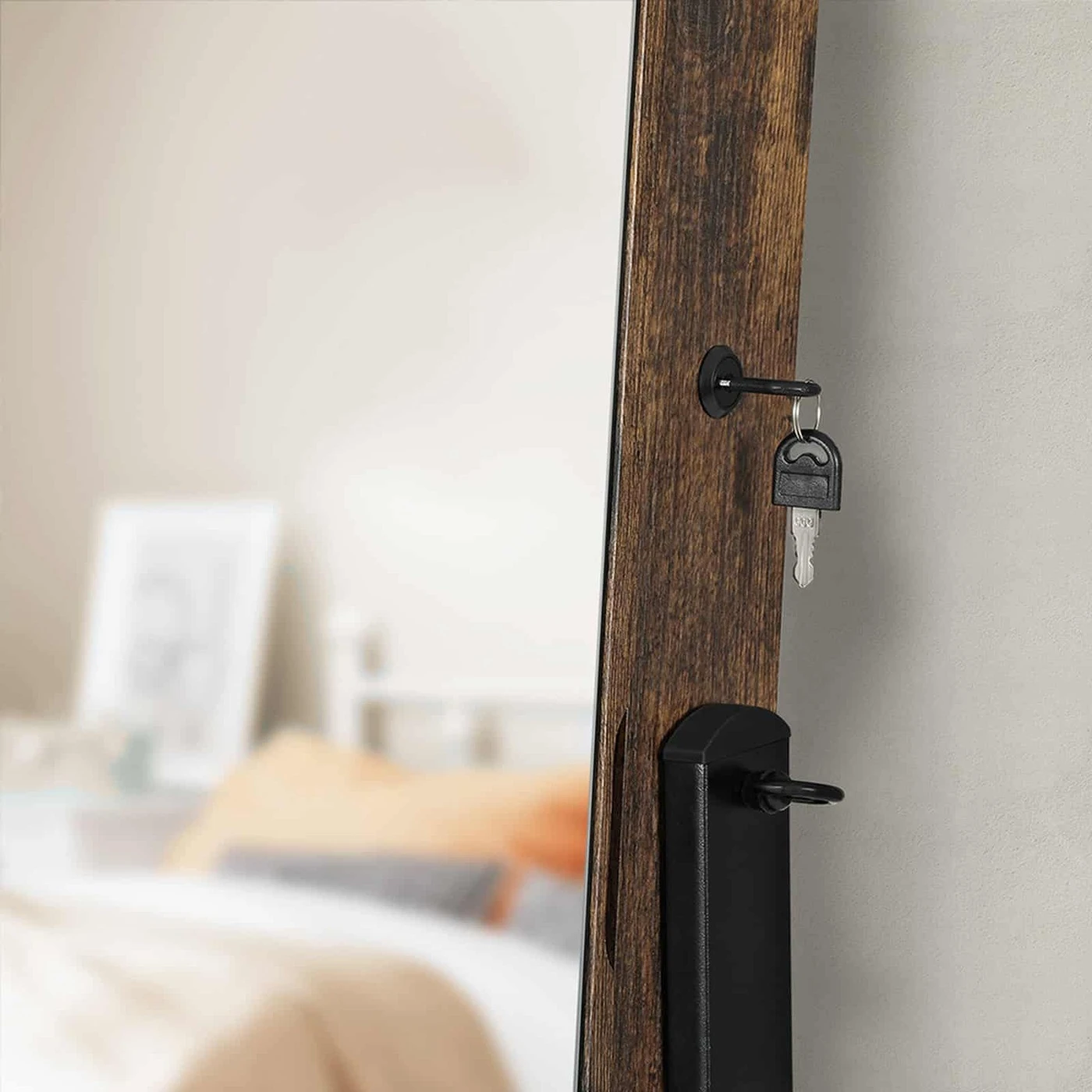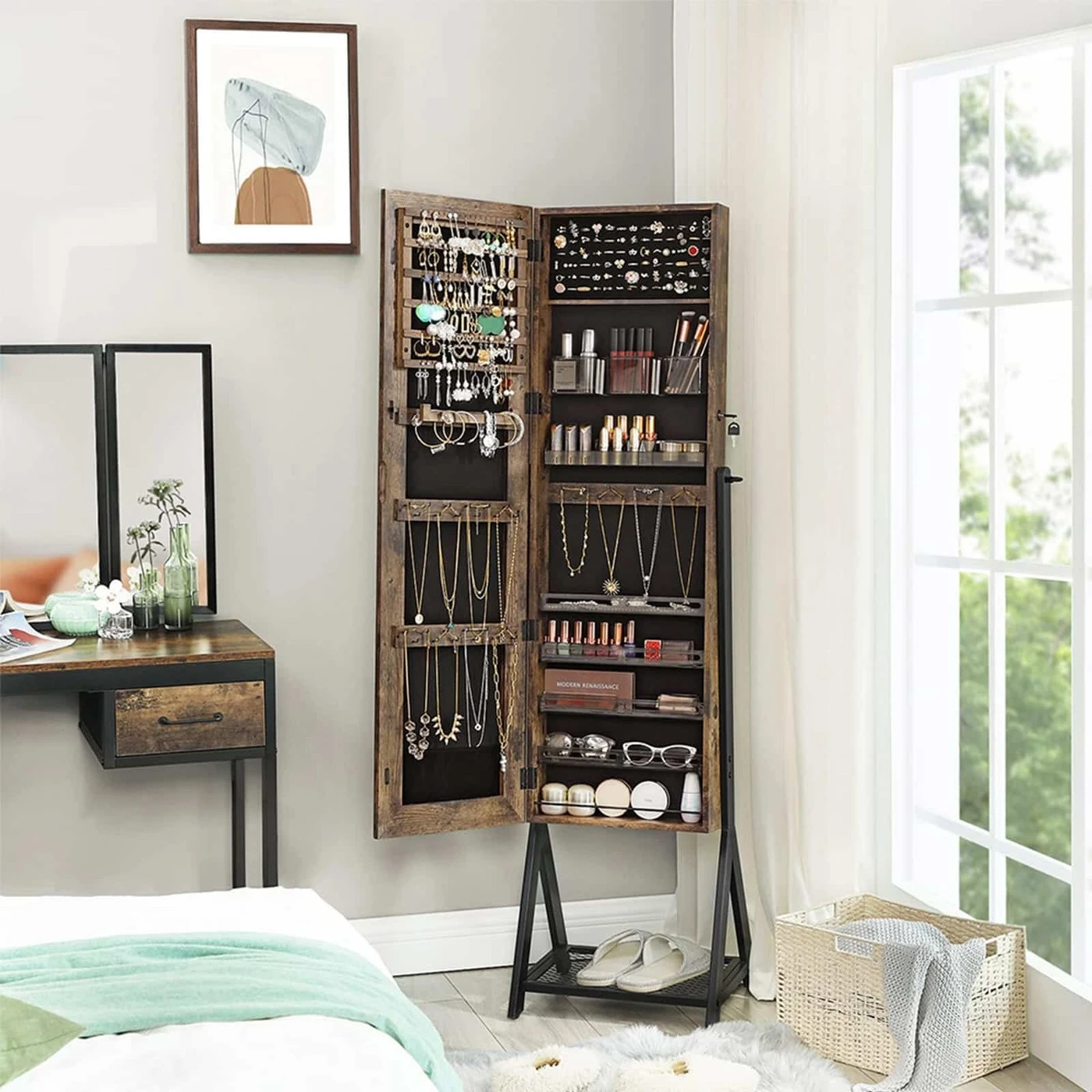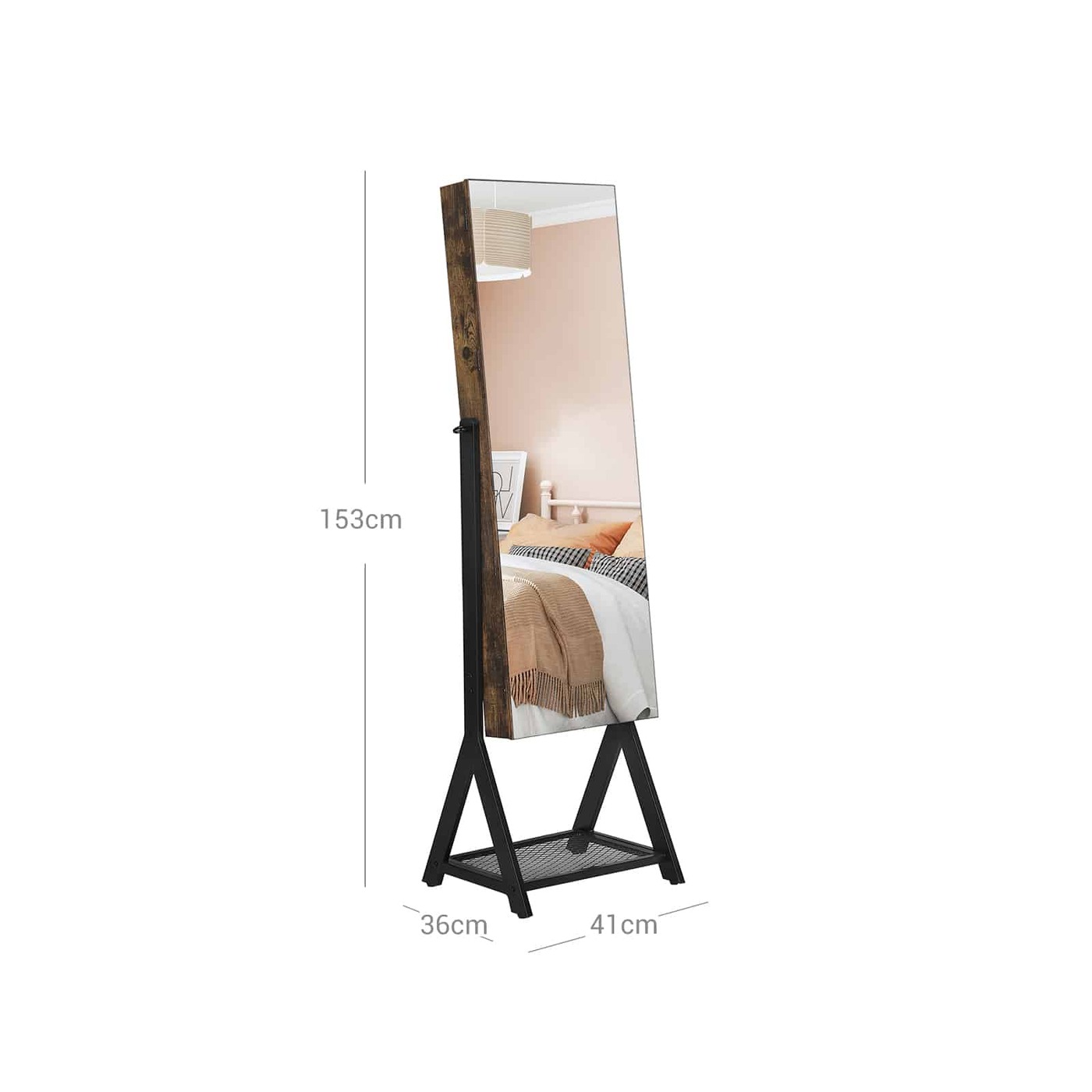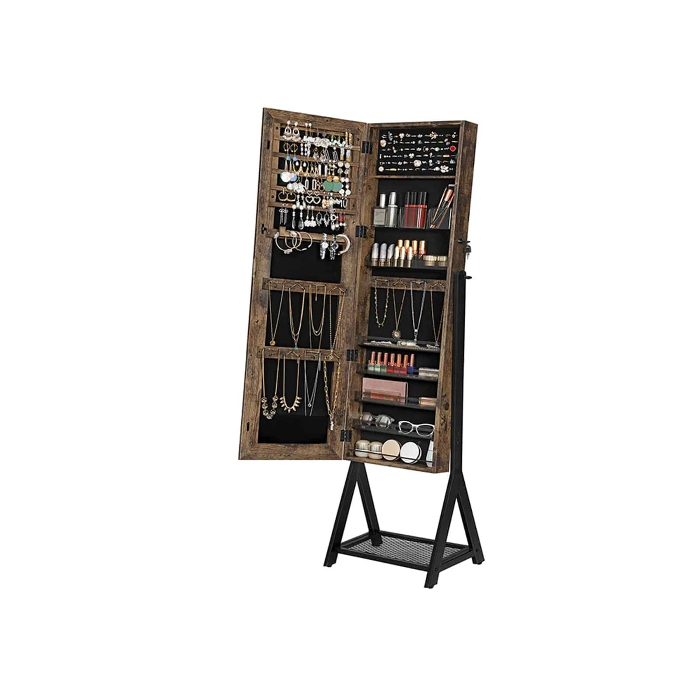 Aprašymas buvo automatiškai išverstas, gali pasitaikyti klaidų.Daugiau funkcijų, daugiau emocijų Daugybė šios spintelės laikymo galimybių užtikrina didelę STAIGMENĄ. Tinklelios lentynos dėka jums nereikės dėti krepšių ant grindų, o tai nudžiugins. ŽVEJĖKITE savo aprangą nuo viršaus iki apačios viso ilgio veidrodyje. Visos tavo draugės tau PADĖS, nes jos taip pat nori šio veidrodžio! Papasakosime apie šios spintelės privalumus: - Pakreipta papuošalų spintelė su dideliu berėmiu veidrodžiu - 108 angos auskarams - 36 skylės auskarams - 78 angos žiedams - 36 kabliukai kaklo papuošalams - Strypas apyrankėms - Lankstus laikiklis su 3 skyriai šepetėliams - Lankstus dėtuvė su keliais skyreliais lūpų dažams - 4 lentynos jūsų grožio prekėms - Lentynėlė apačioje kitiems daiktams - Spyna ir 2 raktai didesniam saugumui - Tinklelio lentyna jūsų krepšiamsInformacija apie gaminį: - Spalva: vintažinė ruda-juoda - Medžiaga: MDF (vidutinio tankio medienos plaušų plokštė), plienas - Dydis: 41 x 36 x 153 cm (P x P x A) - Svoris: 13,7 kg Pristatymo komplektas: - 1 x papuošalų spintelė - 1 x apsauga nuo virtimo - 1 x priedų paketas - 1 x vadovas (DE, EN, FR, ES, IT)SONGMICS Pastabos: - Saugumo sumetimais vaikams draudžiama lipti ant gaminio ar žaisti su juo. - Kad galėtumėte saugiai naudoti šį gaminį, pritvirtinkite prie sienos esančia apsauga nuo apvirtimo.