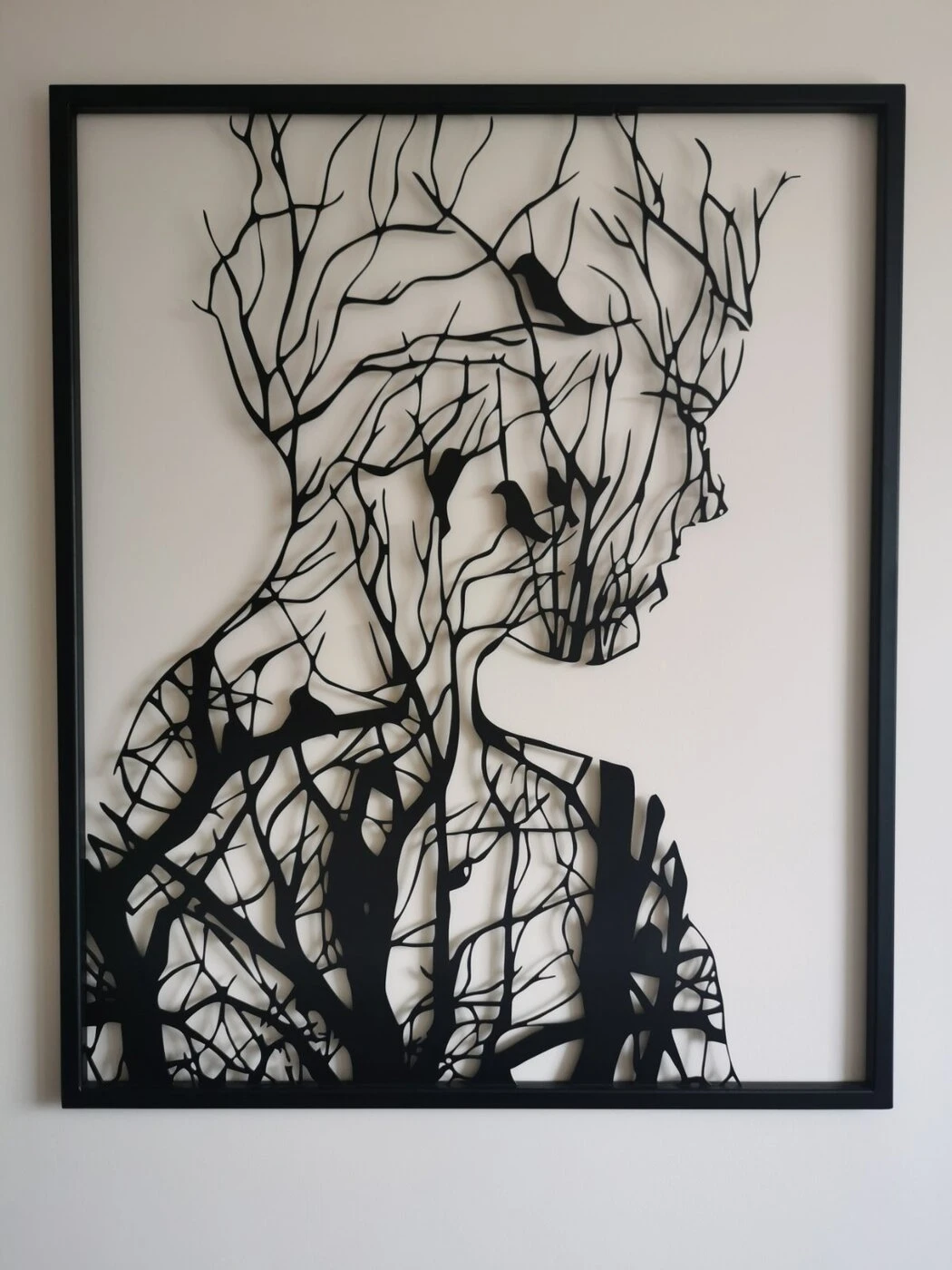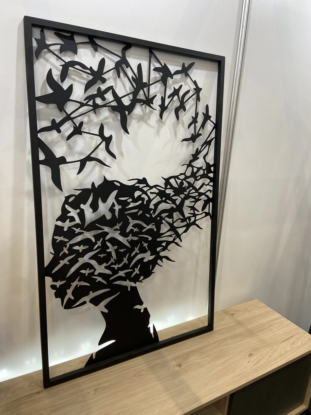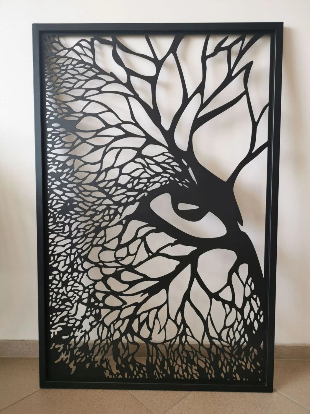 Preciziškai tiksliai lazeriu iš plieno lakšto išpjautas paveikslas. Dėl individualaus paveikslo dizaino užsakymo teirautis el.paštu arba telefonu. Kaina kinta nuo pasirinkto paveikslo dizaino ir dydžio. Standartiniai išmatavimai: 80×97 cm. Išmatavimus galima keisti.