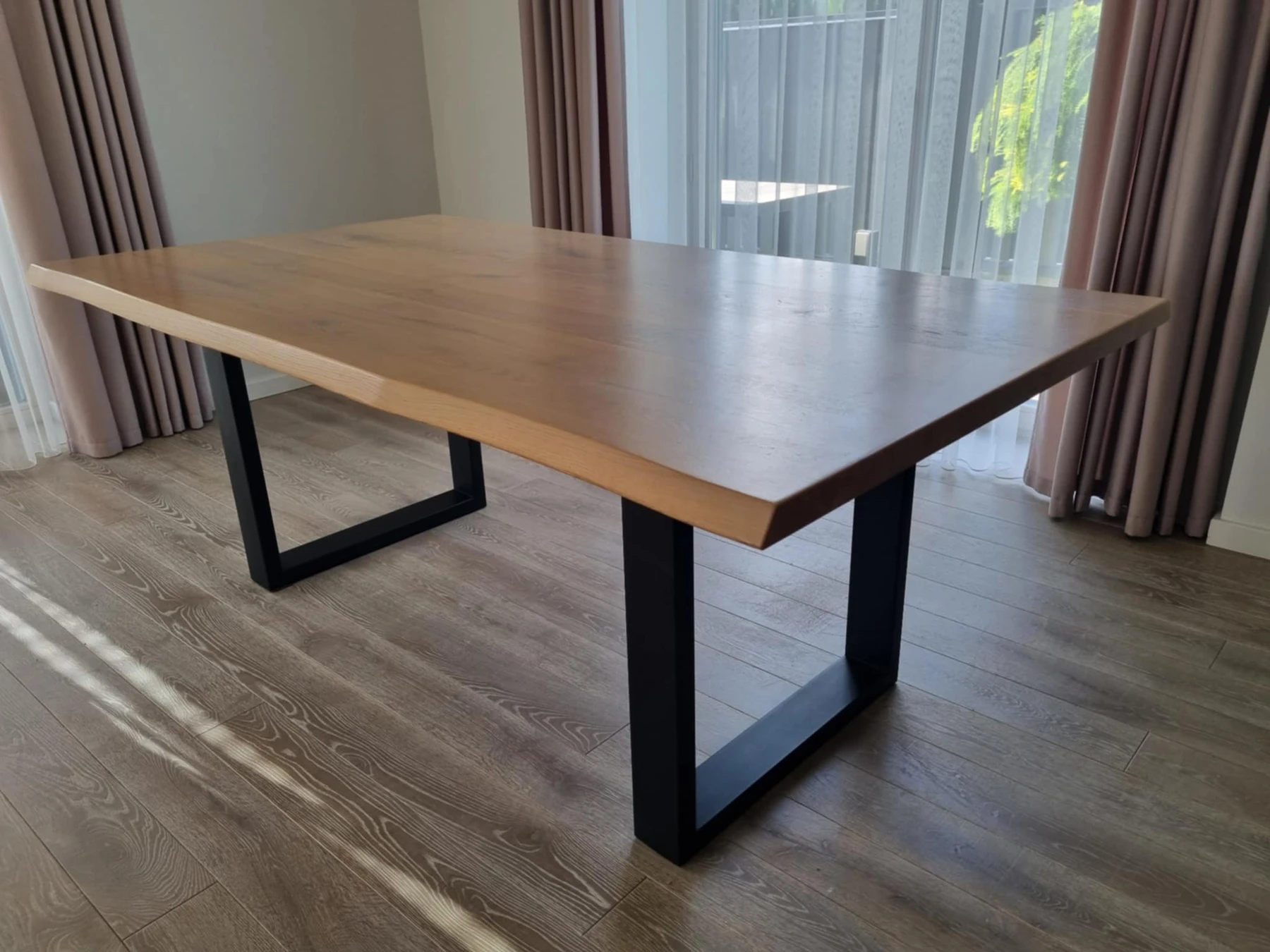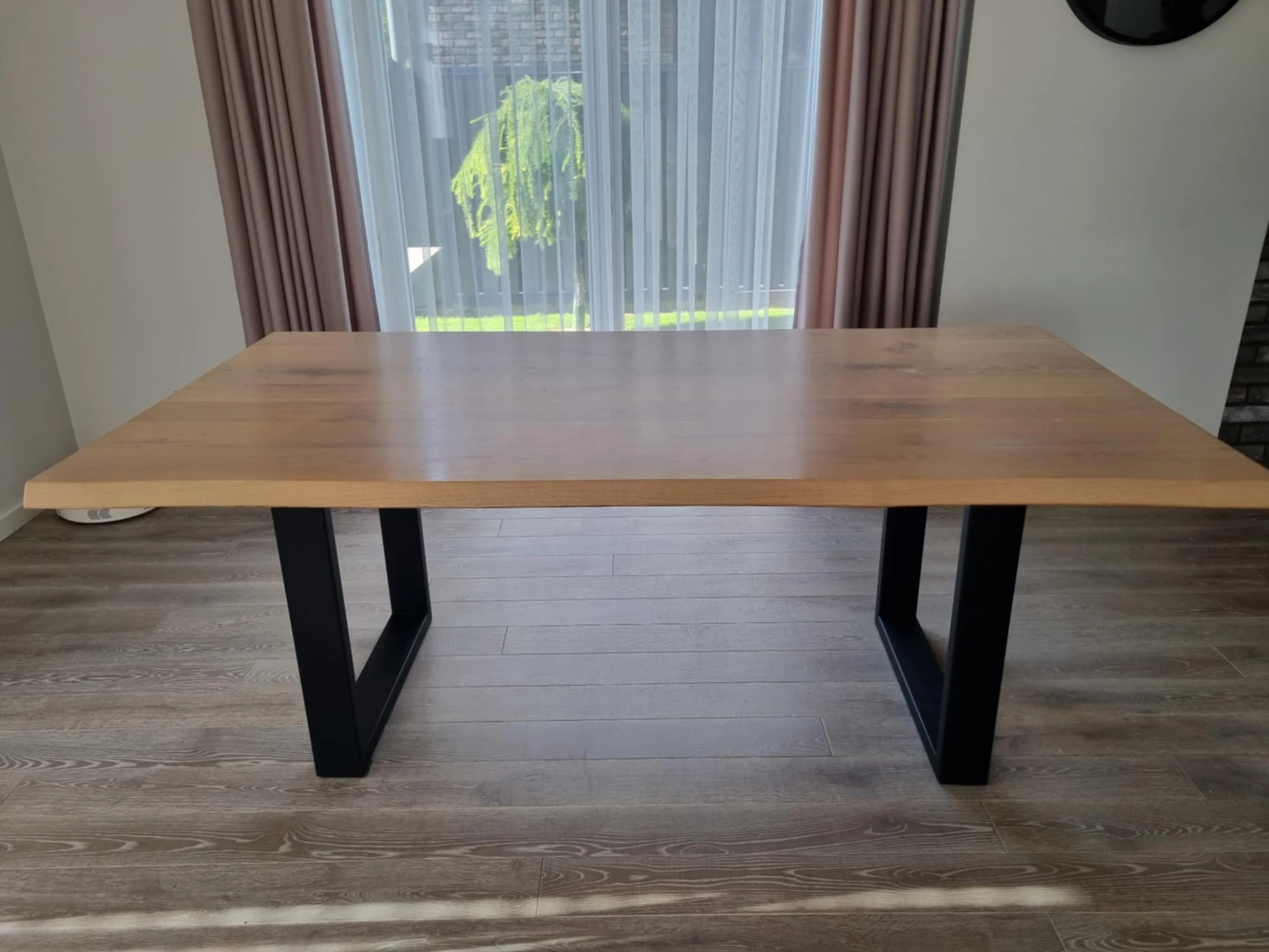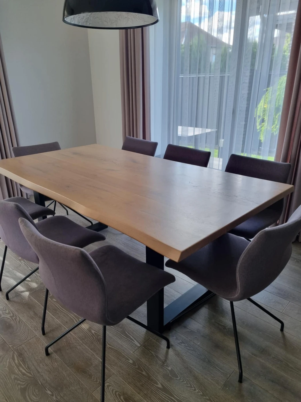 Ąžuolo masyvo pietų stalas su metalinėmis kojimis.