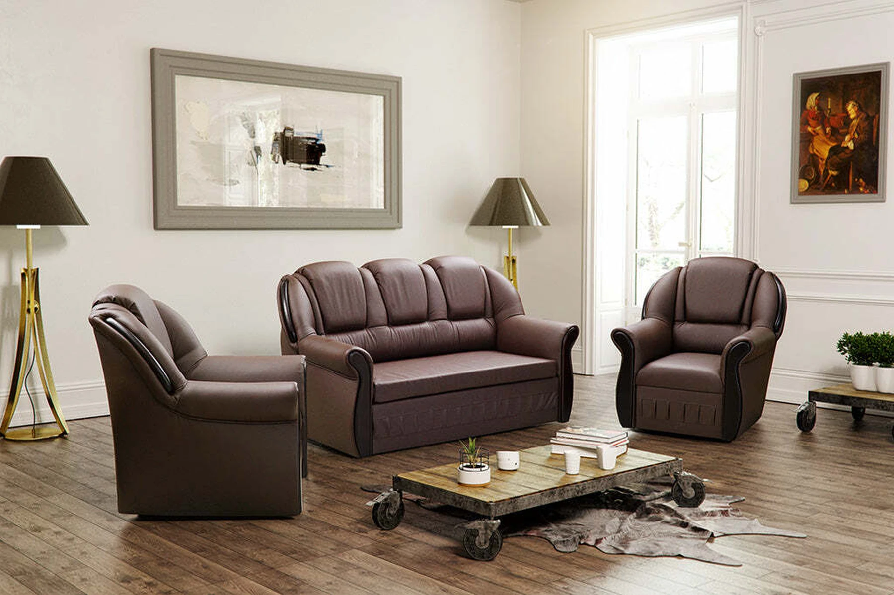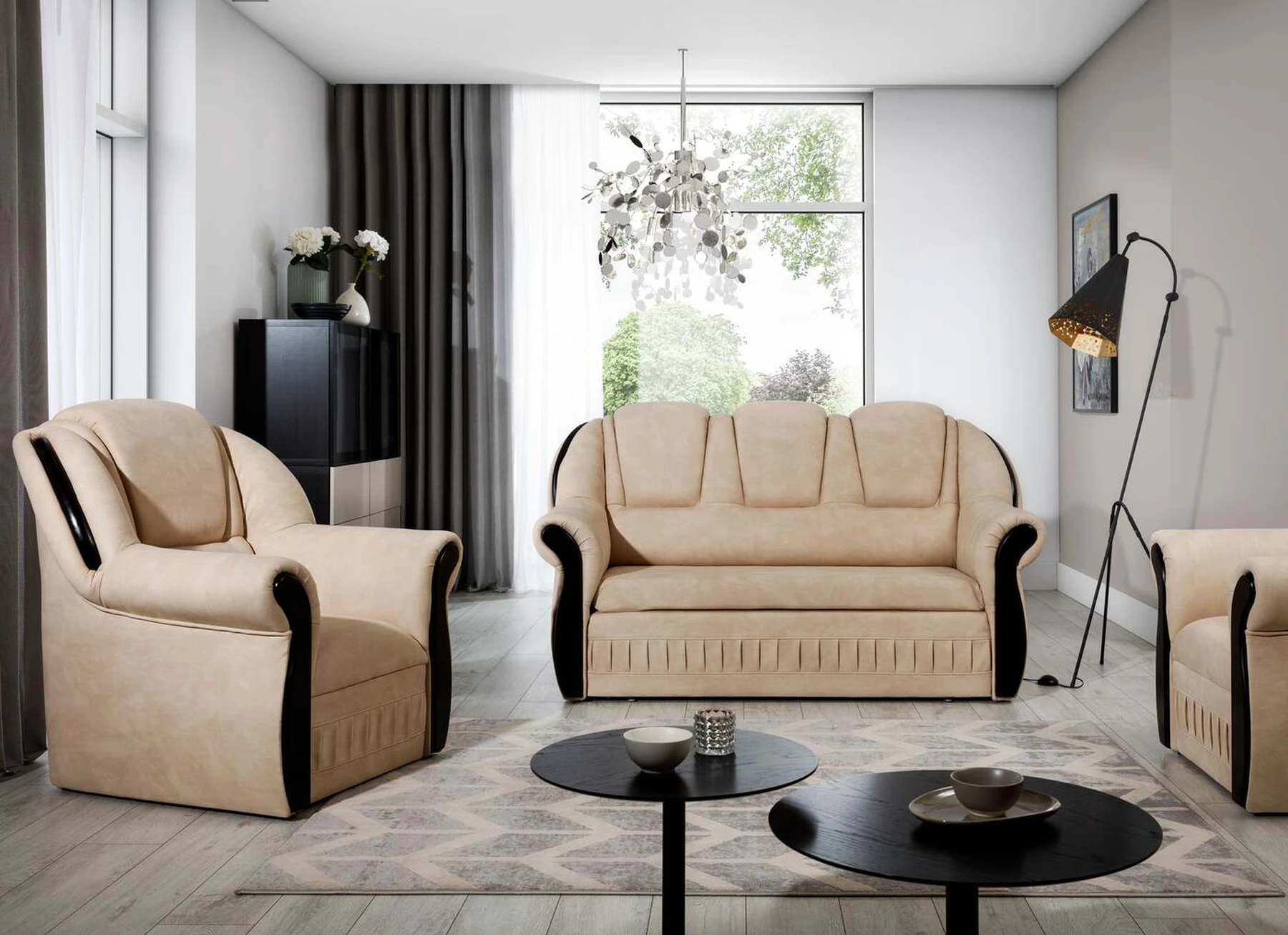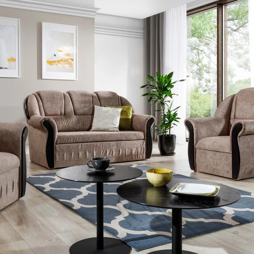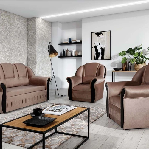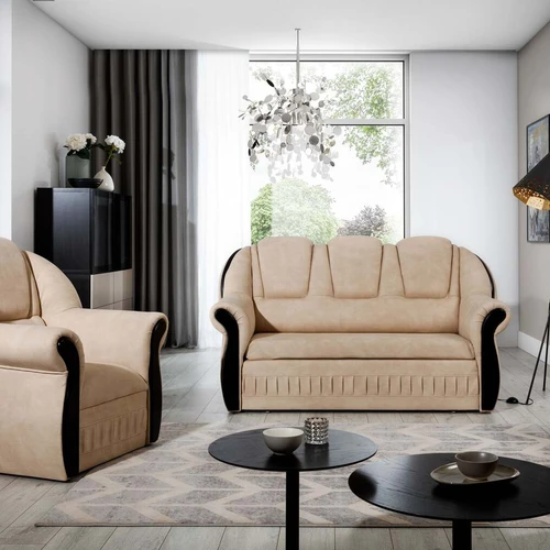 Poilsio komplektas EL5941, kurį sudaro sofa ir du foteliai, yra klasikos esmė, sugretinta su tikra elegancija. Šio komplekto baldai pasižymi ne tik išskirtiniu komfortu, bet ir elegantišku dizainu. Tiek sofa, tiek foteliai turi minkštas sėdynes, užpildytas lanksčia, laikančia ir deformacijai atsparia T30 puta. Be to, mūsų sofa idealiai tinka tiek dienos, tiek nakties poilsiui, nes joje buvo įrengta ne tik papildoma miegojimo funkcija, bet ir erdvus bei funkcionalus patalynės konteineris. Sofos išmatavimai yra 180 x 108 x 105 cm, o fotelių - 80 x 108 x 105 cm, todėl jie bus tobula įranga bet kokio dydžio svetainei. Kita vertus, išskleidus sofą gauname patogią 185 x 135 cm miegamąją erdvę. Dėl paprastos, stabilios konstrukcijos sofą išskleisti ir pritaikyti nakties poilsiui yra paprasta ir intuityvu. Taip pat negalima nepaminėti unikalių fotelių, kurių skiriamieji bruožai yra: gili sėdynė, aukštas atlošas ir kontūriniai porankiai. Mūsų baldų visuma dekoruota mediniais elementais ir stilingomis siūlėmis, kurios imituoja įdubimus ir būdingas raukšles. Mūsų baldai puikiai derės su, pavyzdžiui, mediniais baldais ar antikvariniais daiktais. EL5941 taip pat pasižymi ypatingu dėmesiu detalėms, ornamentų, suteikiančių baldui charakterį, išskirtinumu ir medžiagomis, iš kurių jie buvo pagaminti. Verta pasidomėti mūsų EL5941 poilsio komplektu, kuris gali taip lengvai pakeisti interjerą, kuriame jis yra.
