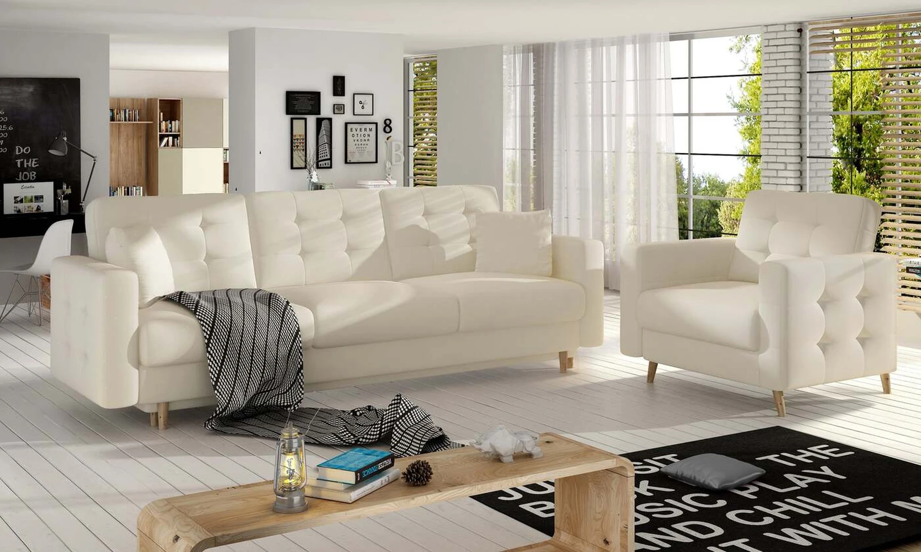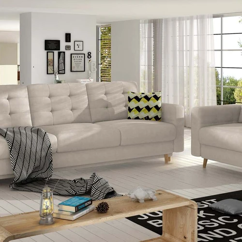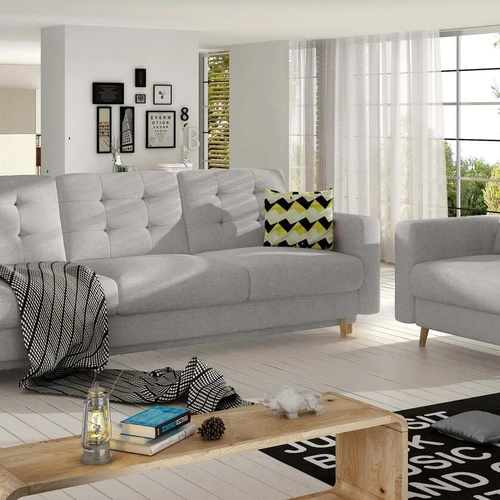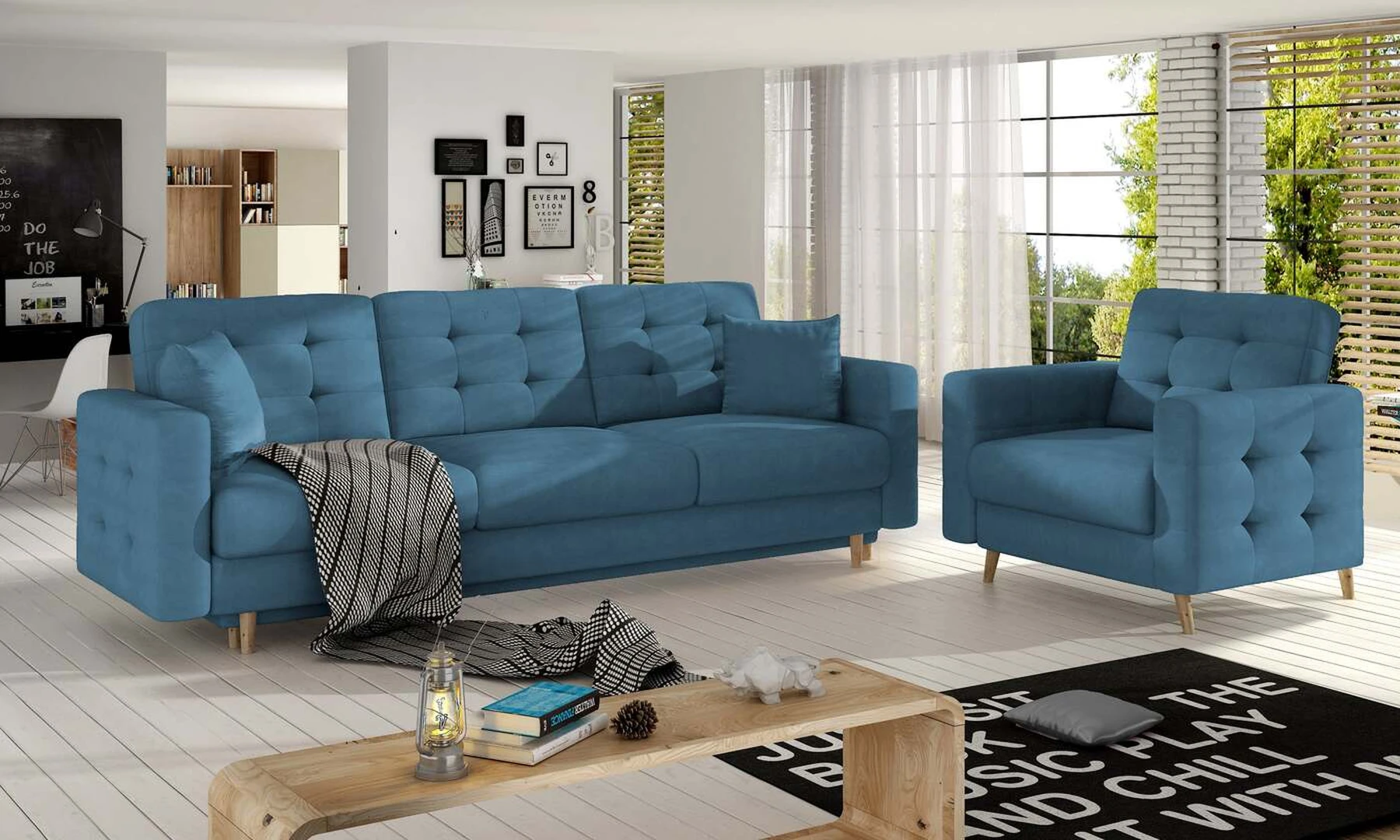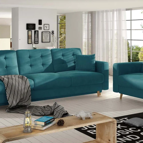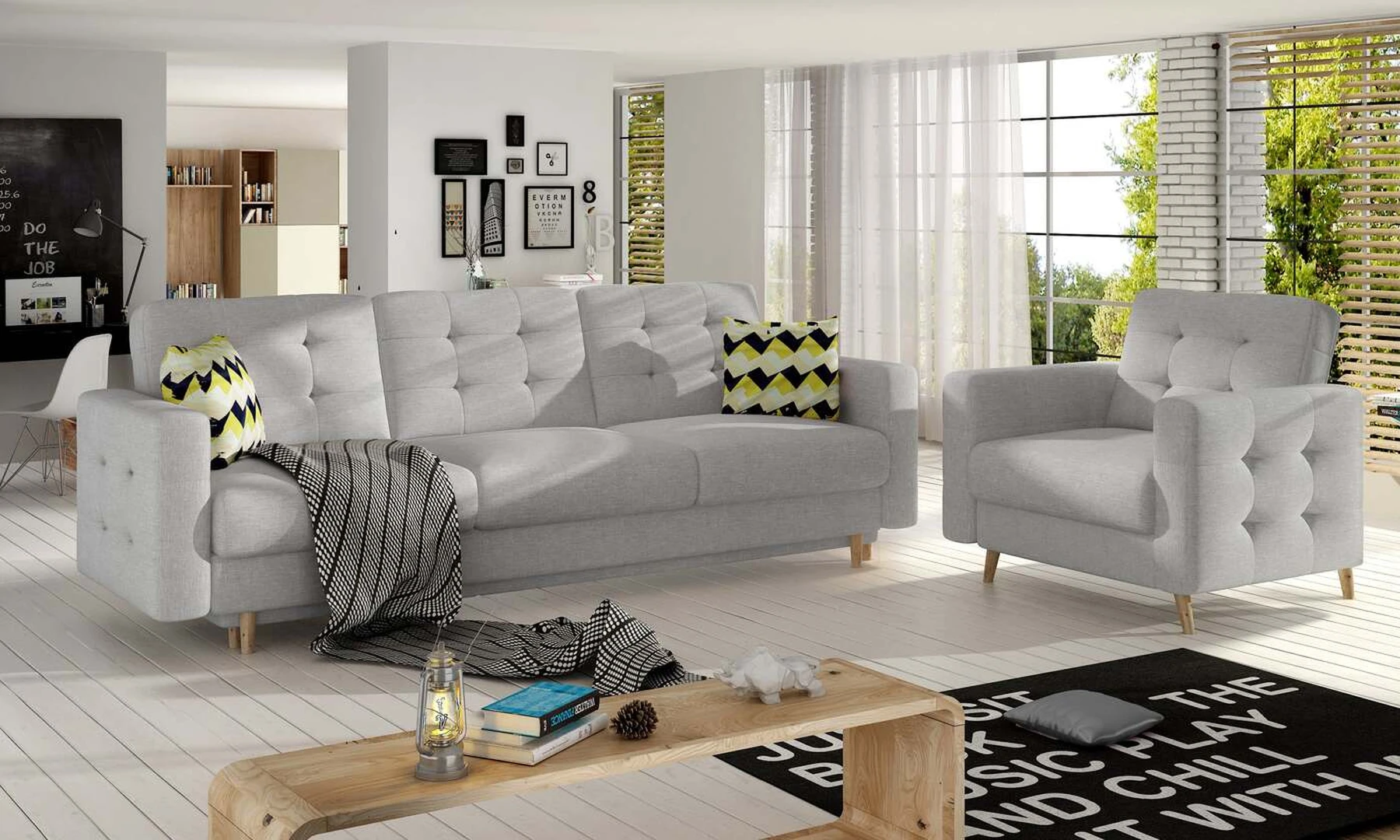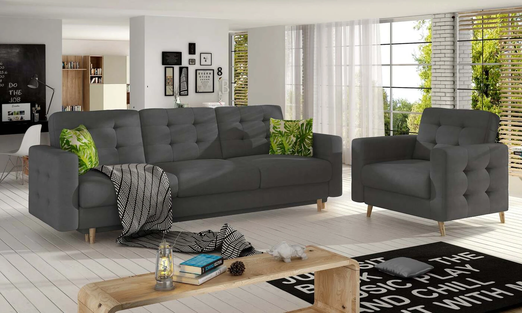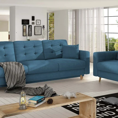 Sofos komplektas EL9257 yra puikus sprendimas tiems, kurie svajoja apie stilingą, elegantišką interjerą. Be abejo, šio fotelio ir šios sofos pasirinkimas bus tikras malonumas gražiai sutvarkyto interjero mėgėjams. Individualūs baldai yra klasikinio, tačiau modernaus dizaino. Per dekoratyvinę skiautinę – jos praturtins bet kurį įprastą namų kampelį. Kalbant apie 107 x 92 x 86 cm fotelį - jis turi gilią, lygią sėdynę, kontūruotą atlošą, erdvią pagalvėlę, taip pat daugybę spalvų variacijų. Korpusas niekuo nesiskiria ir 235 x 95 x 86 cm sofos, kuri skirta ir dienos, ir nakties poilsiui – vėliau ji transformuojasi į 133 x 196 cm lovą (šiame modelyje taip pat yra talpi patalynės dėžė). Dėl gofruotos spyruoklės ir T25 putplasčio naudojimo sofos ir fotelio sėdynė yra itin lanksti, minkšta ir atspari bet kokiai deformacijai. Paprasta forma, elegantiška apdaila ir saugi konstrukcija – tai išskirtiniai mūsų EL9257 sofos baldų bruožai. Tokią sofą verta turėti savo bute, kad džiaugtumėtės išskirtiniu komfortu ir stiliumi. Ramia sąžine rekomenduojame mūsų EL9257 baldus. Toks pasirinkimas niekada nenuvilia!