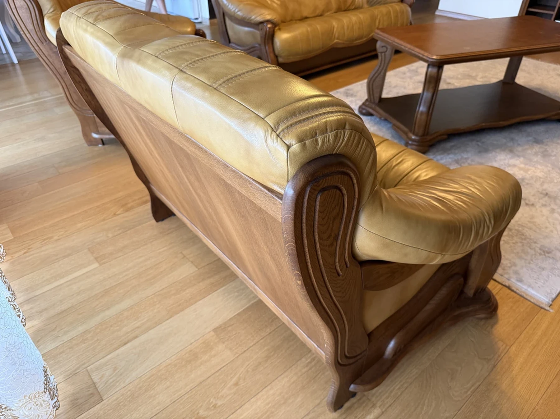 Parduodamas prabangus, ilgaamžis, iš aukščiausios klasės medžiagų pagamintas minkštųjų baldų komplektas, 3 x 2 x 1 komplektacijos.Minkštoji dalis - tik natūrali oda, nėra nutrinta, sudėvėta, subraižyta. Būklė tikrai 9/10. Kietasis medinis karkasas, kadangi praktiškai nesidėvi, yra visiškai idealios būklės, kaip naujas, būklė 10/10. Natūralaus ąžuolo masyvas, todėl tai baldui duoda ypatingo prabangumo ir ilgaamžiškumo.Baldai nėra labai masyvūs ir griozdiški, todėl gali puikiai tikti ne tik dideliame name, bet ir mažesniame bute, kitokiose patalpose, yra atsparūs drėgmei, todėl panaudojimo galimybės yra itin plačios. Minkštoji dalis išsiima iš karkaso, todėl patogu pernešti ir kraustyti, transportuoti.