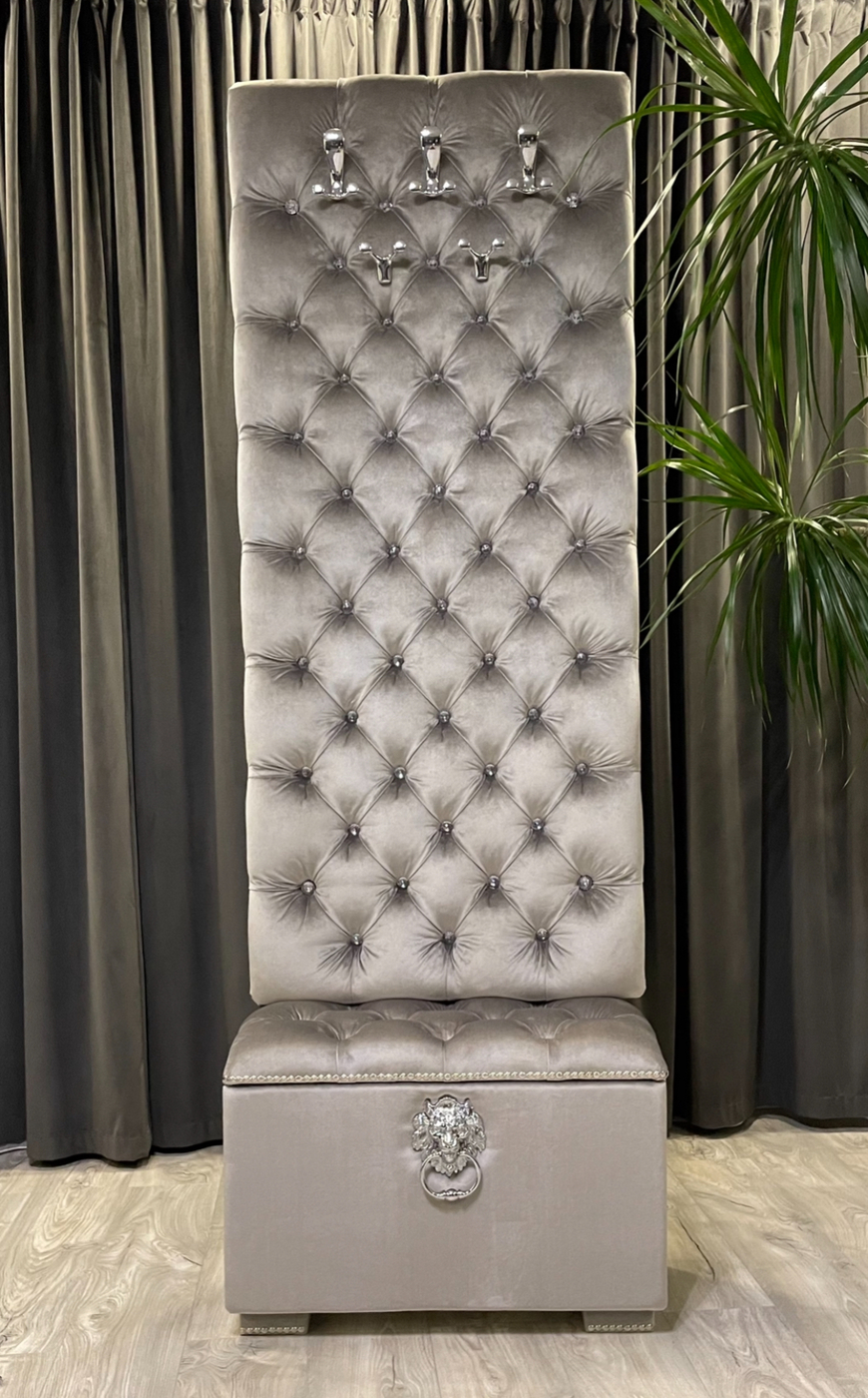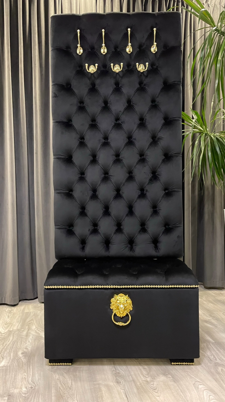 Komplektus sudaro talpi batų dėžė ir drabužių kabyklos su kokybiškais kabliukais, kurie užtikrina ne tik funkcionalumą, bet ir dekoratyvumą. Kiekvieno komplekto dekoratyviniai elementai, įskaitant liūto galvas ir grandinėles, gali būti pritaikyti pagal kliento norus – siūlome pasirinkti iš skirtingų spalvų metalinių detalių, tokių kaip auksas, sidabras, varis ar žalvaris.