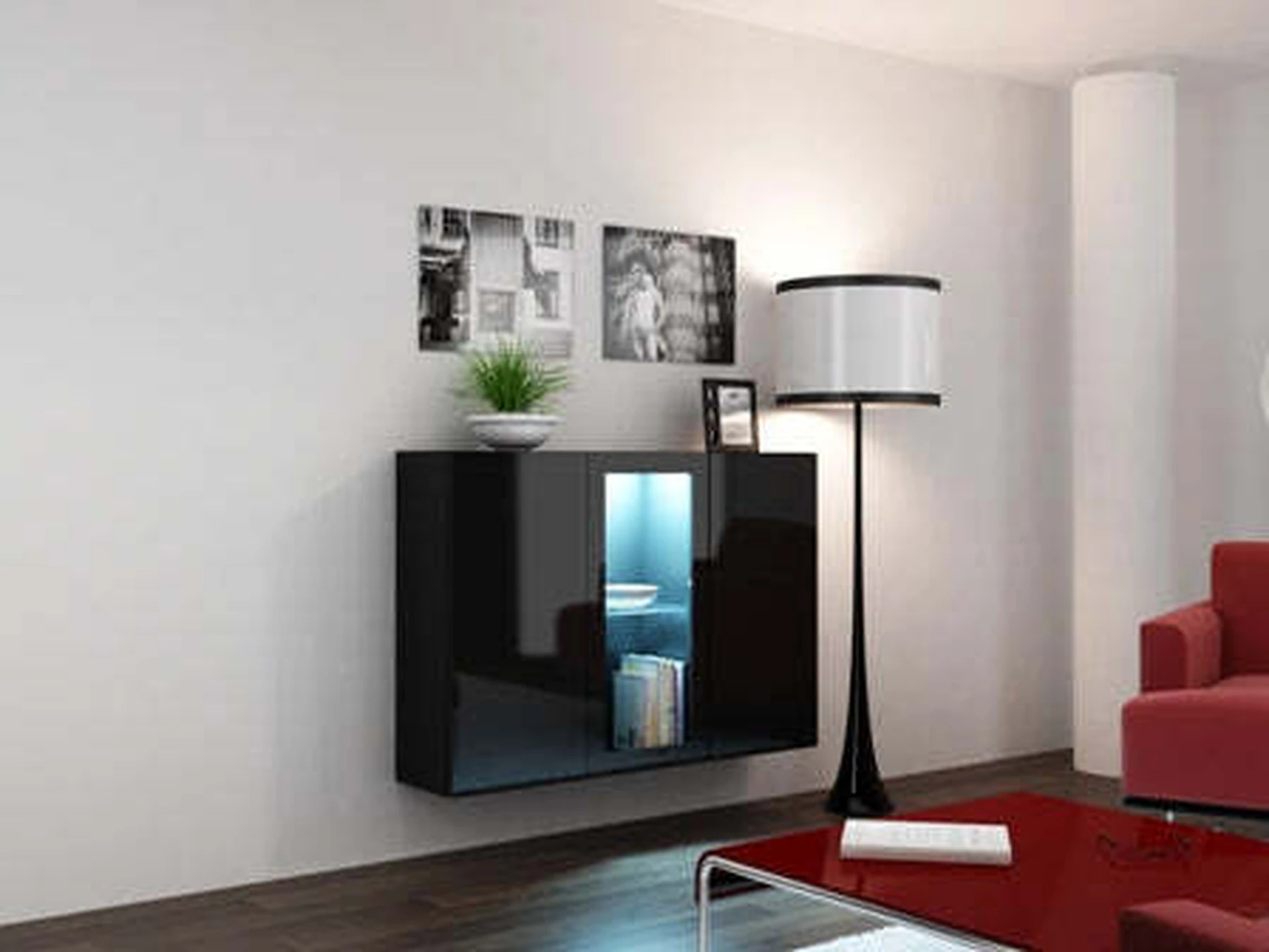 Priekyje: laminuotas blizgus MDF ir stiklas