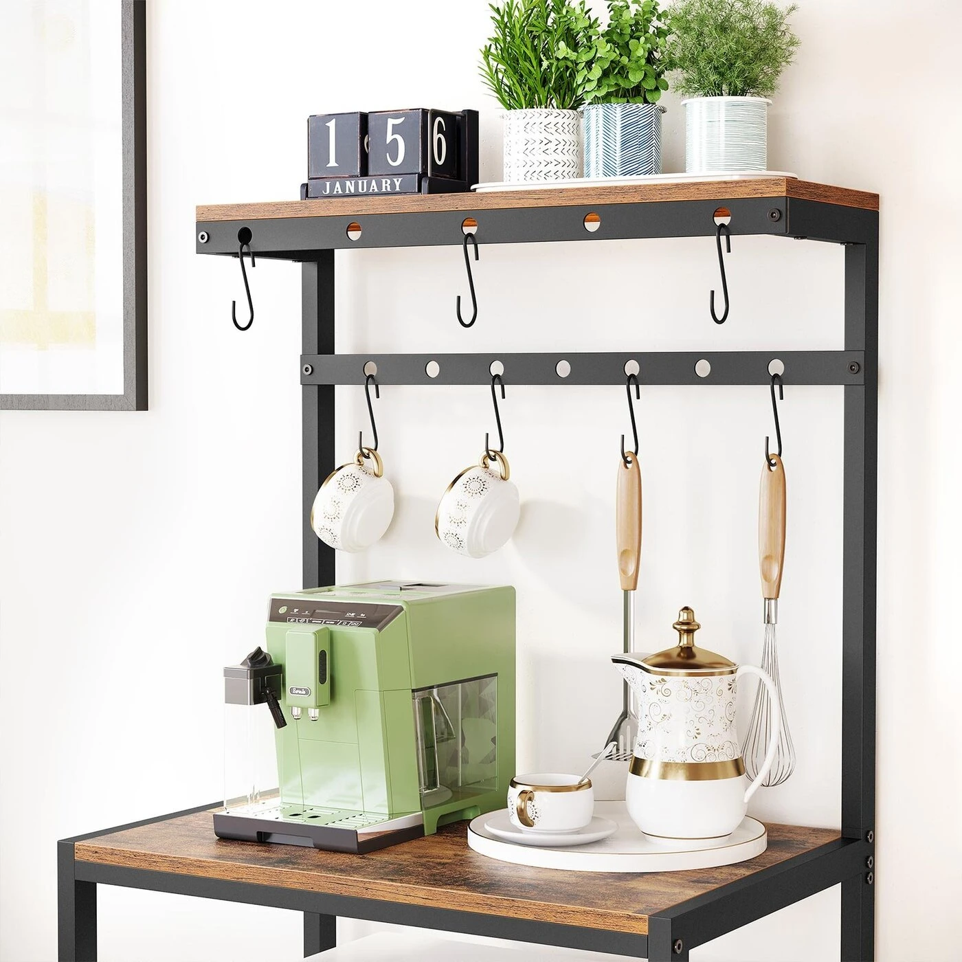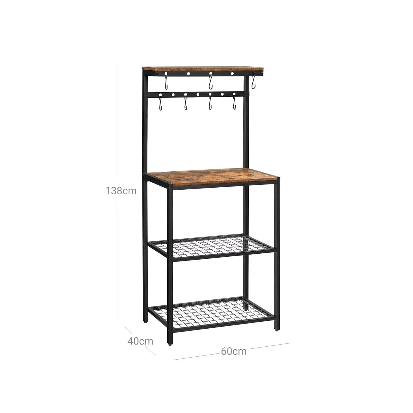 Aprašymas buvo automatiškai išverstas, gali pasitaikyti klaidų.Informacija apie gaminį: - Spalva: vintažinė ruda-juoda - Medžiaga: medžio drožlių plokštės, plienas - Dydis: 60 x 40 x 138 cm (P x P x A) - Svoris: 9,9 kg - Maksimali statinė apkrova: - Viršutinės lentynos lygis: 15 kg - Stalo paviršius: 25 kg - vienai tinklelio lentynai: 10 kgPristatymo komplektas: - 1 x virtuvės lentyna - 7 x S formos kabliukai - 1 x apsaugos nuo posvyrio įtaisas - 1 x priedų paketas - 1 x vadovas (DE, EN, IT, FR, ES) VASAGLE Pastabos: - Saugumo sumetimais , vaikams neleidžiama ant gaminio lipti ar žaisti su juo.- Pritvirtinkite šį gaminį prie sienos su komplekte esančiu apsaugančiu nuo virtimo, kad užtikrintumėte saugų naudojimą.- Higienos sumetimais nedėkite maisto tiesiai ant metalinio tinklelio. lentynos.- Atidžiai patikrinkite, ar jūsų mikrobangų krosnelės ar kitų virtuvės prietaisų lentynos dydis.