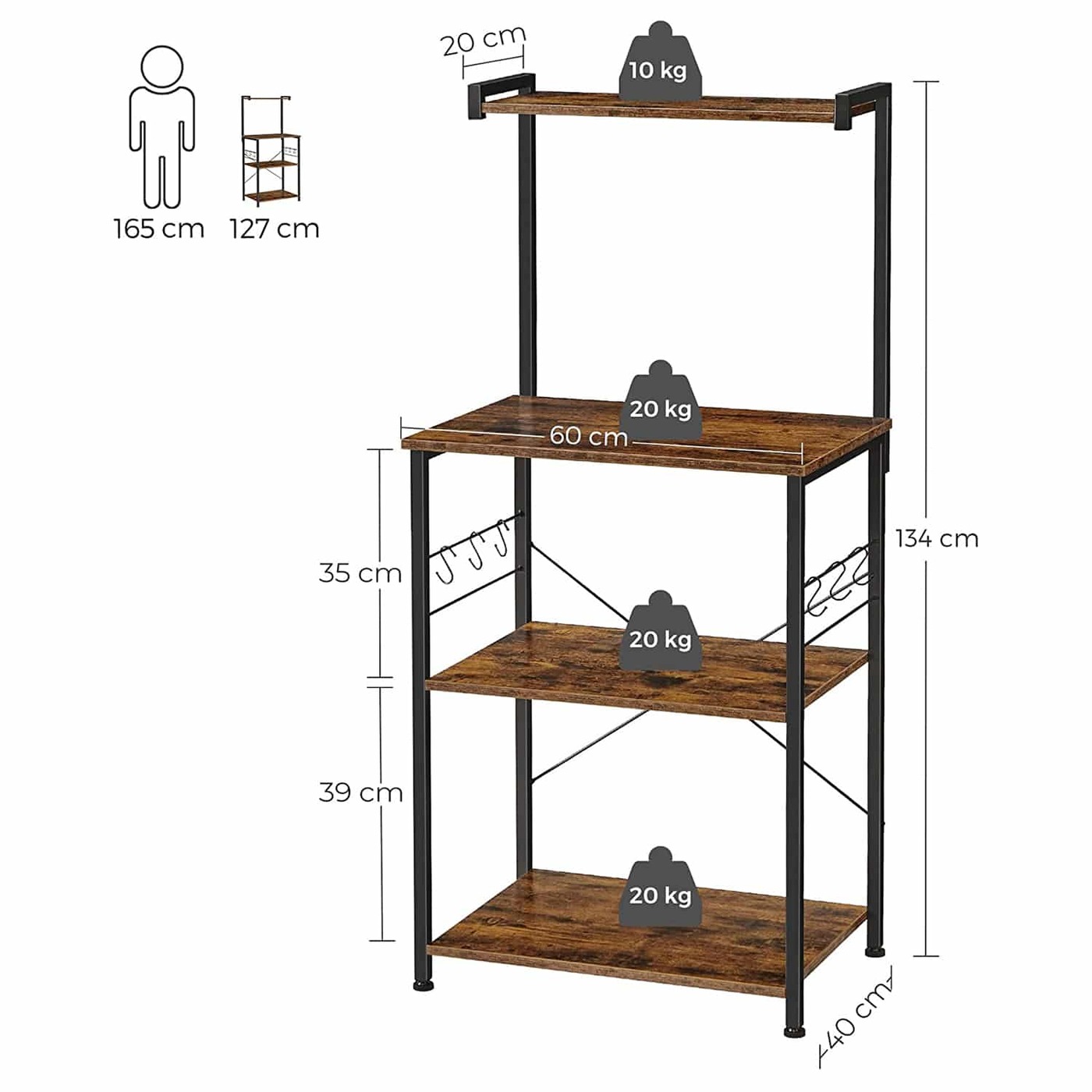 Aprašymas buvo automatiškai išverstas, gali pasitaikyti klaidų. Išsami informacija apie gaminį: - Spalva: vintažinė ruda-juoda - Medžiaga: medžio drožlių plokštės, plienas - Dydis: 60 x 40 x 127 cm (P x P x A) - Svoris: 12,2 kg - Maksimali apatinės lentynos statinė apkrova: 20 kg - Maks. Viršutinės lentynos statinė apkrova: 10 kg Pakuotės turinys: - 1 x virtuvinė lentyna - 6 x S formos kabliukai - 1 x apsauga nuo apvirtimo - 1 x priedų pakuotė - 1 x instrukcijosVASAGLE Pastabos:- Saugumo sumetimais vaikams neleidžiama laipioti ar žaisti su gaminiu.- Pritvirtinkite šį gaminį prie sienos su komplekte esančiu neapvirtimu, kad užtikrintumėte saugų naudojimą.- Atidžiai patikrinkite savo mikrobangų krosnelės ar kitų virtuvės prietaisų dydį. .