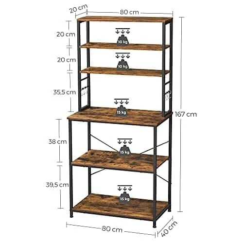Aprašymas buvo automatiškai išverstas, gali pasitaikyti klaidų.Informacija apie gaminį: - Spalva: vintažinė ruda-juoda - Medžiaga: medžio drožlių plokštės, plienas - Dydis: 80 x 40 x 167 cm (P x P x A) - Svoris: 21 kg - Maksimali bendra statinė apkrova: 90 kg Pakuotės turinys: - 1 x virtuvės lentyna - 6 x S formos kabliukai - 1 x apsaugantis nuo apvirtimo - 1 x priedų paketas - 1 x rankinis (DE, EN, IT, FR, ES)VASAGLE Pastabos:- Saugumo sumetimais vaikams neleidžiama laipioti ar žaisti su gaminiu.- Pritvirtinkite šį gaminį prie sienos su komplekte esančiu neapvirtimu, kad užtikrintumėte saugų naudojimą.- Atidžiai patikrinkite savo mikrobangų krosnelės ar kitų virtuvės prietaisų dydį. .