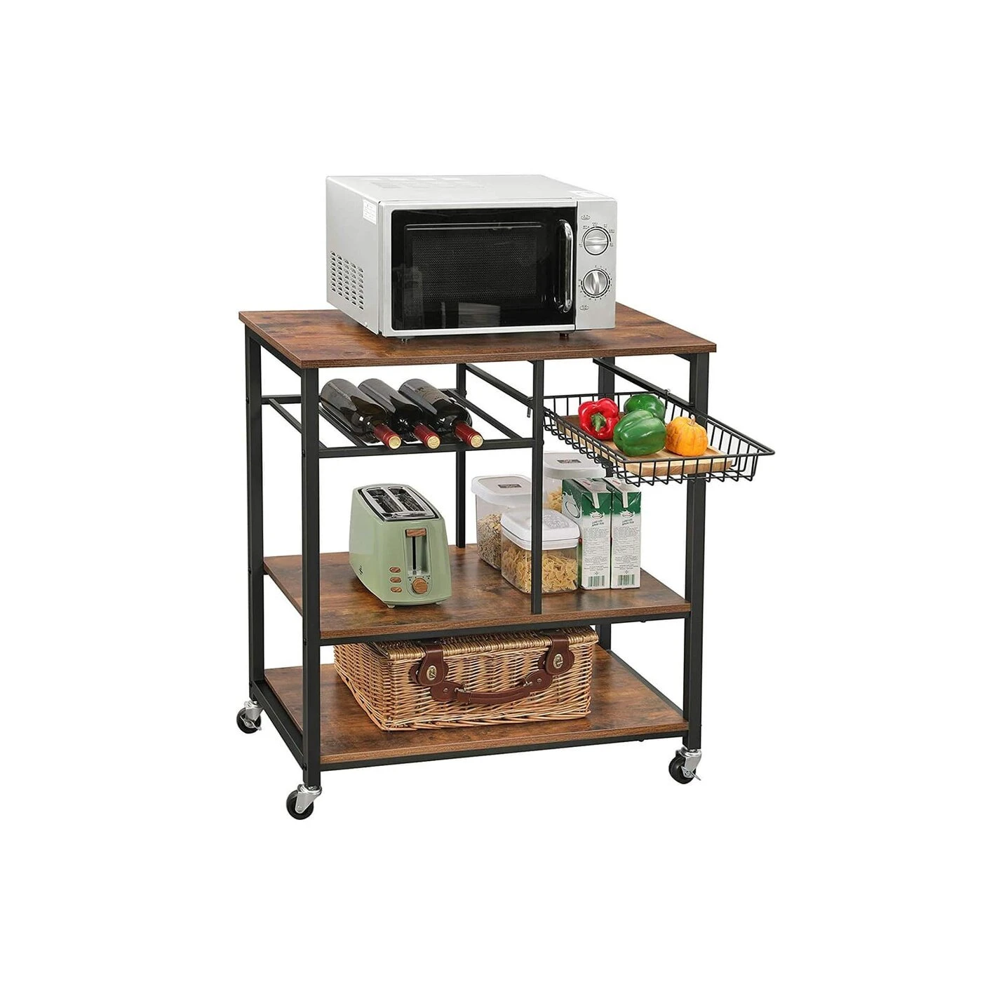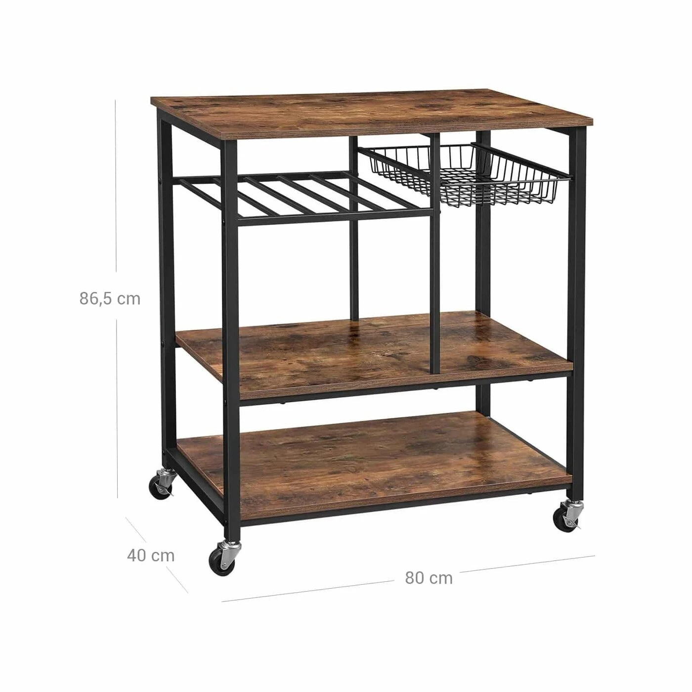 Aprašymas buvo automatiškai išverstas, gali pasitaikyti klaidų.Išsami informacija apie gaminį: - Spalva: vintažinė/tamsiai ruda - Medžiaga: medžio drožlių plokštė su melamino lukštu, geležis - Bendras dydis: 80 x 40 x 86,5 cm (P x P x A) - Stalviršio dydis: 80 x 40 x 1,5 cm (P x P x H) - Svoris: 16,5 kg - Maksimali bendra statinė apkrova: 80 kg Pristatymo komplektas: - 1 x virtuvės lentyna - 4 x universalūs ratukai (2 su stabdžiais) - 4 x reguliuojamos kojelės - 1 x montavimo priedai - 1 x instrukcija (DE, EN, IT, FR, ES) VASAGLE Pastabos: Surinkdami neleiskite vaikams patekti į darbo vietą. Pakuotėje yra daug smulkių dalių, kurios gali būti mirtinos prarijus ar įkvėpus. - Saugokite gaminį nuo aštrių ir smailių daiktų bei ėsdinančių cheminių medžiagų, kad nepažeistumėte paviršiaus. - Neleiskite vaikams lipti ant gaminio. - Didžiausia statinė apkrova talpa 80 kg. Nedėkite ant gaminio sunkesnių daiktų.