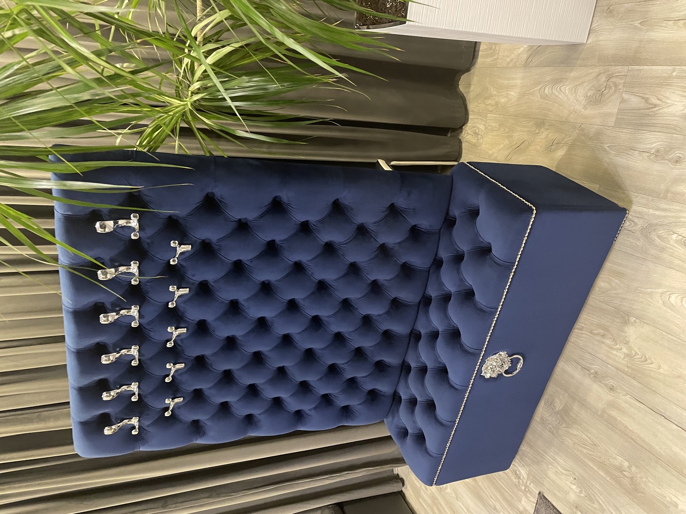 Mūsų baldų dekoratyvinės detalės (tokios kaip liūto galvos, grandinėlės ar kokybiški kabliukai) gali būti pritaikytos pagal jūsų pageidavimus. Metalinės detalės gali būti auksinės, sidabrinės, varinės ar žalvarinės – kad baldai derėtų prie jūsų namų interjero stiliaus. Šių baldų veliūrinis apmušalas ne tik prabangiai atrodo, bet ir yra atsparus trynimui, vandeniui bei gyvūnų nagams, todėl jie ilgai išlieka kaip nauji ir lengvai prižiūrimi.